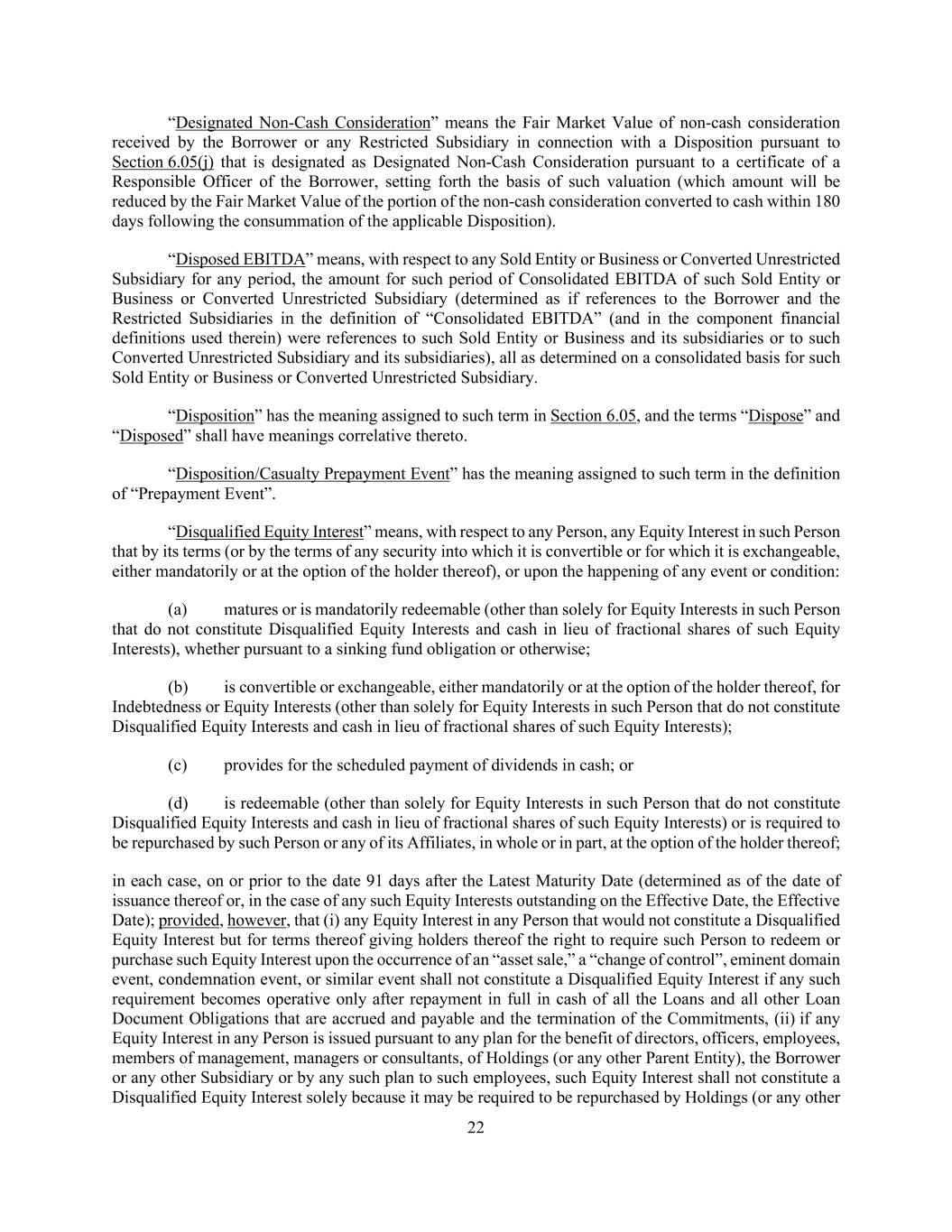 22 “Designated Non-Cash Consideration” means the Fair Market Value of non-cash consideration received by the Borrower or any Restricted Subsidiary in connection with a Disposition pursuant to Section 6.05(j) that is designated as Designated Non-Cash Consideration pursuant to a certificate of a Responsible Officer of the Borrower, setting forth the basis of such valuation (which amount will be reduced by the Fair Market Value of the portion of the non-cash consideration converted to cash within 180 days following the consummation of the applicable Disposition). “Disposed EBITDA” means, with respect to any Sold Entity or Business or Converted Unrestricted Subsidiary for any period, the amount for such period of Consolidated EBITDA of such Sold Entity or Business or Converted Unrestricted Subsidiary (determined as if references to the Borrower and the Restricted Subsidiaries in the definition of “Consolidated EBITDA” (and in the component financial definitions used therein) were references to such Sold Entity or Business and its subsidiaries or to such Converted Unrestricted Subsidiary and its subsidiaries), all as determined on a consolidated basis for such Sold Entity or Business or Converted Unrestricted Subsidiary. “Disposition” has the meaning assigned to such term in Section 6.05, and the terms “Dispose” and “Disposed” shall have meanings correlative thereto. “Disposition/Casualty Prepayment Event” has the meaning assigned to such term in the definition of “Prepayment Event”. “Disqualified Equity Interest” means, with respect to any Person, any Equity Interest in such Person that by its terms (or by the terms of any security into which it is convertible or for which it is exchangeable, either mandatorily or at the option of the holder thereof), or upon the happening of any event or condition: (a) matures or is mandatorily redeemable (other than solely for Equity Interests in such Person that do not constitute Disqualified Equity Interests and cash in lieu of fractional shares of such Equity Interests), whether pursuant to a sinking fund obligation or otherwise; (b) is convertible or exchangeable, either mandatorily or at the option of the holder thereof, for Indebtedness or Equity Interests (other than solely for Equity Interests in such Person that do not constitute Disqualified Equity Interests and cash in lieu of fractional shares of such Equity Interests); (c) provides for the scheduled payment of dividends in cash; or (d) is redeemable (other than solely for Equity Interests in such Person that do not constitute Disqualified Equity Interests and cash in lieu of fractional shares of such Equity Interests) or is required to be repurchased by such Person or any of its Affiliates, in whole or in part, at the option of the holder thereof; in each case, on or prior to the date 91 days after the Latest Maturity Date (determined as of the date of issuance thereof or, in the case of any such Equity Interests outstanding on the Effective Date, the Effective Date); provided, however, that (i) any Equity Interest in any Person that would not constitute a Disqualified Equity Interest but for terms thereof giving holders thereof the right to require such Person to redeem or purchase such Equity Interest upon the occurrence of an “asset sale,” a “change of control”, eminent domain event, condemnation event, or similar event shall not constitute a Disqualified Equity Interest if any such requirement becomes operative only after repayment in full in cash of all the Loans and all other Loan Document Obligations that are accrued and payable and the termination of the Commitments, (ii) if any Equity Interest in any Person is issued pursuant to any plan for the benefit of directors, officers, employees, members of management, managers or consultants, of Holdings (or any other Parent Entity), the Borrower or any other Subsidiary or by any such plan to such employees, such Equity Interest shall not constitute a Disqualified Equity Interest solely because it may be required to be repurchased by Holdings (or any other