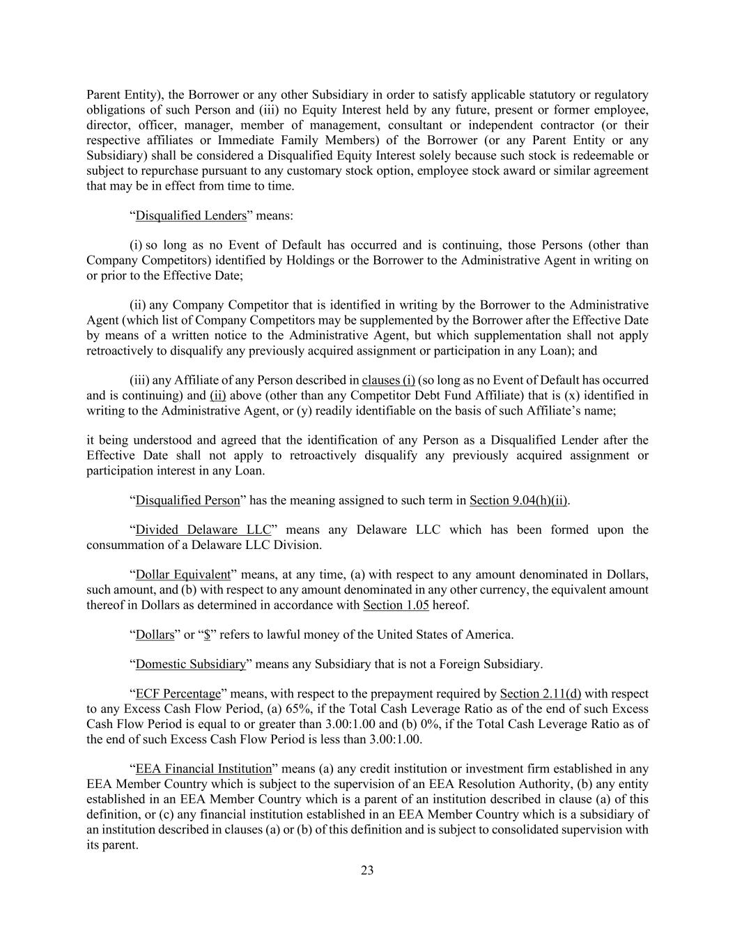 23 Parent Entity), the Borrower or any other Subsidiary in order to satisfy applicable statutory or regulatory obligations of such Person and (iii) no Equity Interest held by any future, present or former employee, director, officer, manager, member of management, consultant or independent contractor (or their respective affiliates or Immediate Family Members) of the Borrower (or any Parent Entity or any Subsidiary) shall be considered a Disqualified Equity Interest solely because such stock is redeemable or subject to repurchase pursuant to any customary stock option, employee stock award or similar agreement that may be in effect from time to time. “Disqualified Lenders” means: (i) so long as no Event of Default has occurred and is continuing, those Persons (other than Company Competitors) identified by Holdings or the Borrower to the Administrative Agent in writing on or prior to the Effective Date; (ii) any Company Competitor that is identified in writing by the Borrower to the Administrative Agent (which list of Company Competitors may be supplemented by the Borrower after the Effective Date by means of a written notice to the Administrative Agent, but which supplementation shall not apply retroactively to disqualify any previously acquired assignment or participation in any Loan); and (iii) any Affiliate of any Person described in clauses (i) (so long as no Event of Default has occurred and is continuing) and (ii) above (other than any Competitor Debt Fund Affiliate) that is (x) identified in writing to the Administrative Agent, or (y) readily identifiable on the basis of such Affiliate’s name; it being understood and agreed that the identification of any Person as a Disqualified Lender after the Effective Date shall not apply to retroactively disqualify any previously acquired assignment or participation interest in any Loan. “Disqualified Person” has the meaning assigned to such term in Section 9.04(h)(ii). “Divided Delaware LLC” means any Delaware LLC which has been formed upon the consummation of a Delaware LLC Division. “Dollar Equivalent” means, at any time, (a) with respect to any amount denominated in Dollars, such amount, and (b) with respect to any amount denominated in any other currency, the equivalent amount thereof in Dollars as determined in accordance with Section 1.05 hereof. “Dollars” or “$” refers to lawful money of the United States of America. “Domestic Subsidiary” means any Subsidiary that is not a Foreign Subsidiary. “ECF Percentage” means, with respect to the prepayment required by Section 2.11(d) with respect to any Excess Cash Flow Period, (a) 65%, if the Total Cash Leverage Ratio as of the end of such Excess Cash Flow Period is equal to or greater than 3.00:1.00 and (b) 0%, if the Total Cash Leverage Ratio as of the end of such Excess Cash Flow Period is less than 3.00:1.00. “EEA Financial Institution” means (a) any credit institution or investment firm established in any EEA Member Country which is subject to the supervision of an EEA Resolution Authority, (b) any entity established in an EEA Member Country which is a parent of an institution described in clause (a) of this definition, or (c) any financial institution established in an EEA Member Country which is a subsidiary of an institution described in clauses (a) or (b) of this definition and is subject to consolidated supervision with its parent.