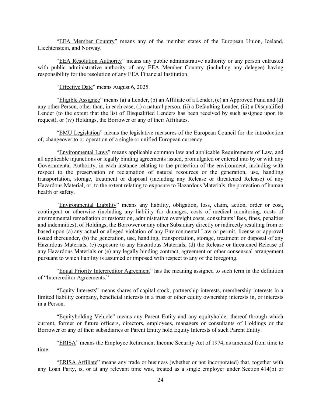 24 “EEA Member Country” means any of the member states of the European Union, Iceland, Liechtenstein, and Norway. “EEA Resolution Authority” means any public administrative authority or any person entrusted with public administrative authority of any EEA Member Country (including any delegee) having responsibility for the resolution of any EEA Financial Institution. “Effective Date” means August 6, 2025. “Eligible Assignee” means (a) a Lender, (b) an Affiliate of a Lender, (c) an Approved Fund and (d) any other Person, other than, in each case, (i) a natural person, (ii) a Defaulting Lender, (iii) a Disqualified Lender (to the extent that the list of Disqualified Lenders has been received by such assignee upon its request), or (iv) Holdings, the Borrower or any of their Affiliates. “EMU Legislation” means the legislative measures of the European Council for the introduction of, changeover to or operation of a single or unified European currency. “Environmental Laws” means applicable common law and applicable Requirements of Law, and all applicable injunctions or legally binding agreements issued, promulgated or entered into by or with any Governmental Authority, in each instance relating to the protection of the environment, including with respect to the preservation or reclamation of natural resources or the generation, use, handling transportation, storage, treatment or disposal (including any Release or threatened Release) of any Hazardous Material, or, to the extent relating to exposure to Hazardous Materials, the protection of human health or safety. “Environmental Liability” means any liability, obligation, loss, claim, action, order or cost, contingent or otherwise (including any liability for damages, costs of medical monitoring, costs of environmental remediation or restoration, administrative oversight costs, consultants’ fees, fines, penalties and indemnities), of Holdings, the Borrower or any other Subsidiary directly or indirectly resulting from or based upon (a) any actual or alleged violation of any Environmental Law or permit, license or approval issued thereunder, (b) the generation, use, handling, transportation, storage, treatment or disposal of any Hazardous Materials, (c) exposure to any Hazardous Materials, (d) the Release or threatened Release of any Hazardous Materials or (e) any legally binding contract, agreement or other consensual arrangement pursuant to which liability is assumed or imposed with respect to any of the foregoing. “Equal Priority Intercreditor Agreement” has the meaning assigned to such term in the definition of “Intercreditor Agreements.” “Equity Interests” means shares of capital stock, partnership interests, membership interests in a limited liability company, beneficial interests in a trust or other equity ownership interests in, or interests in a Person. “Equityholding Vehicle” means any Parent Entity and any equityholder thereof through which current, former or future officers, directors, employees, managers or consultants of Holdings or the Borrower or any of their subsidiaries or Parent Entity hold Equity Interests of such Parent Entity. “ERISA” means the Employee Retirement Income Security Act of 1974, as amended from time to time. “ERISA Affiliate” means any trade or business (whether or not incorporated) that, together with any Loan Party, is, or at any relevant time was, treated as a single employer under Section 414(b) or