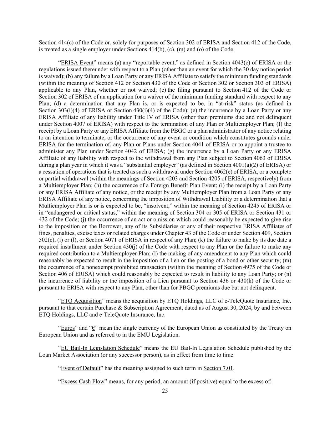 25 Section 414(c) of the Code or, solely for purposes of Section 302 of ERISA and Section 412 of the Code, is treated as a single employer under Sections 414(b), (c), (m) and (o) of the Code. “ERISA Event” means (a) any “reportable event,” as defined in Section 4043(c) of ERISA or the regulations issued thereunder with respect to a Plan (other than an event for which the 30 day notice period is waived); (b) any failure by a Loan Party or any ERISA Affiliate to satisfy the minimum funding standards (within the meaning of Section 412 or Section 430 of the Code or Section 302 or Section 303 of ERISA) applicable to any Plan, whether or not waived; (c) the filing pursuant to Section 412 of the Code or Section 302 of ERISA of an application for a waiver of the minimum funding standard with respect to any Plan; (d) a determination that any Plan is, or is expected to be, in “at-risk” status (as defined in Section 303(i)(4) of ERISA or Section 430(i)(4) of the Code); (e) the incurrence by a Loan Party or any ERISA Affiliate of any liability under Title IV of ERISA (other than premiums due and not delinquent under Section 4007 of ERISA) with respect to the termination of any Plan or Multiemployer Plan; (f) the receipt by a Loan Party or any ERISA Affiliate from the PBGC or a plan administrator of any notice relating to an intention to terminate, or the occurrence of any event or condition which constitutes grounds under ERISA for the termination of, any Plan or Plans under Section 4041 of ERISA or to appoint a trustee to administer any Plan under Section 4042 of ERISA; (g) the incurrence by a Loan Party or any ERISA Affiliate of any liability with respect to the withdrawal from any Plan subject to Section 4063 of ERISA during a plan year in which it was a “substantial employer” (as defined in Section 4001(a)(2) of ERISA) or a cessation of operations that is treated as such a withdrawal under Section 4062(e) of ERISA, or a complete or partial withdrawal (within the meanings of Section 4203 and Section 4205 of ERISA, respectively) from a Multiemployer Plan; (h) the occurrence of a Foreign Benefit Plan Event; (i) the receipt by a Loan Party or any ERISA Affiliate of any notice, or the receipt by any Multiemployer Plan from a Loan Party or any ERISA Affiliate of any notice, concerning the imposition of Withdrawal Liability or a determination that a Multiemployer Plan is or is expected to be, “insolvent,” within the meaning of Section 4245 of ERISA or in “endangered or critical status,” within the meaning of Section 304 or 305 of ERISA or Section 431 or 432 of the Code; (j) the occurrence of an act or omission which could reasonably be expected to give rise to the imposition on the Borrower, any of its Subsidiaries or any of their respective ERISA Affiliates of fines, penalties, excise taxes or related charges under Chapter 43 of the Code or under Section 409, Section 502(c), (i) or (l), or Section 4071 of ERISA in respect of any Plan; (k) the failure to make by its due date a required installment under Section 430(j) of the Code with respect to any Plan or the failure to make any required contribution to a Multiemployer Plan; (l) the making of any amendment to any Plan which could reasonably be expected to result in the imposition of a lien or the posting of a bond or other security; (m) the occurrence of a nonexempt prohibited transaction (within the meaning of Section 4975 of the Code or Section 406 of ERISA) which could reasonably be expected to result in liability to any Loan Party; or (n) the incurrence of liability or the imposition of a Lien pursuant to Section 436 or 430(k) of the Code or pursuant to ERISA with respect to any Plan, other than for PBGC premiums due but not delinquent. “ETQ Acquisition” means the acquisition by ETQ Holdings, LLC of e-TeleQuote Insurance, Inc. pursuant to that certain Purchase & Subscription Agreement, dated as of August 30, 2024, by and between ETQ Holdings, LLC and e-TeleQuote Insurance, Inc. “Euros” and “€” mean the single currency of the European Union as constituted by the Treaty on European Union and as referred to in the EMU Legislation. “EU Bail-In Legislation Schedule” means the EU Bail-In Legislation Schedule published by the Loan Market Association (or any successor person), as in effect from time to time. “Event of Default” has the meaning assigned to such term in Section 7.01. “Excess Cash Flow” means, for any period, an amount (if positive) equal to the excess of: