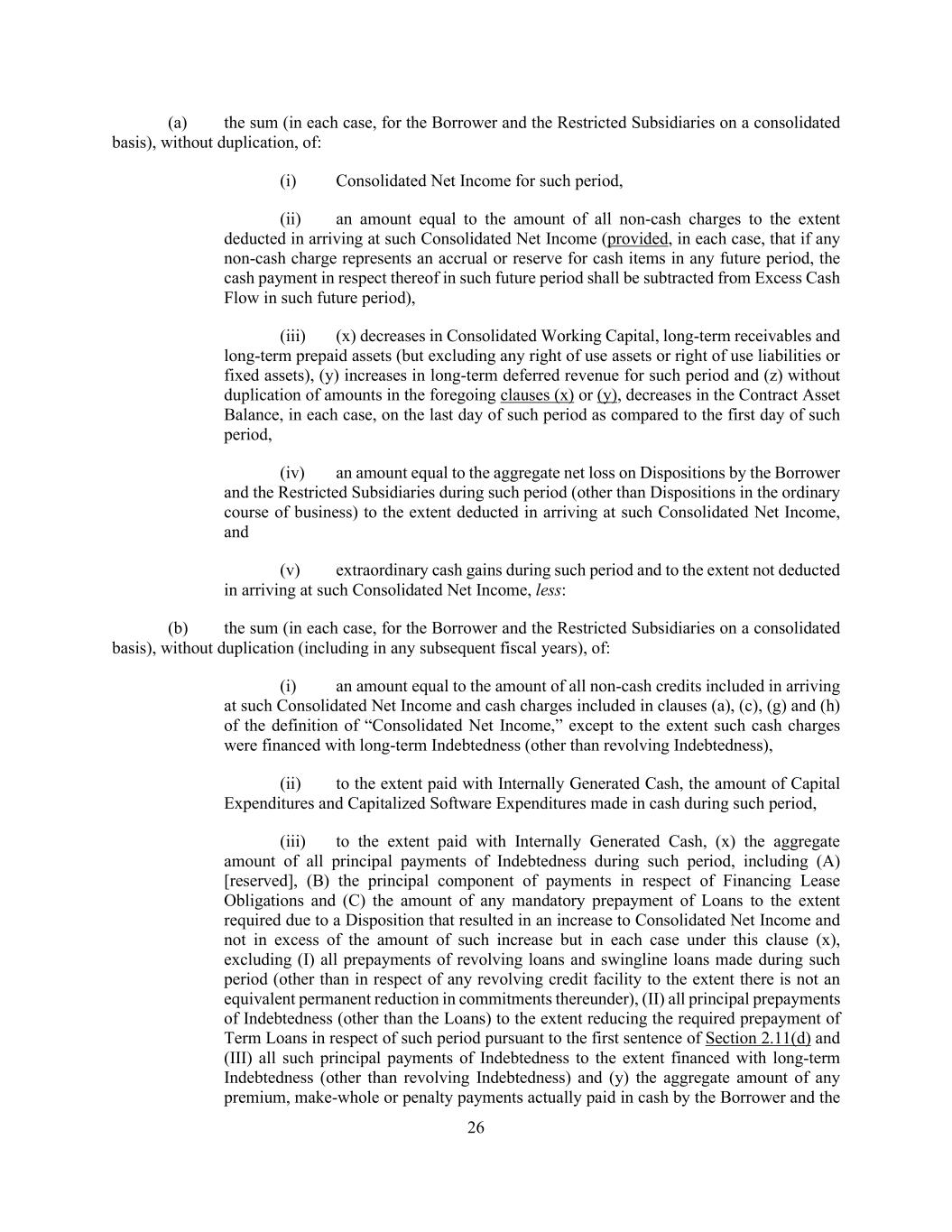 26 (a) the sum (in each case, for the Borrower and the Restricted Subsidiaries on a consolidated basis), without duplication, of: (i) Consolidated Net Income for such period, (ii) an amount equal to the amount of all non-cash charges to the extent deducted in arriving at such Consolidated Net Income (provided, in each case, that if any non-cash charge represents an accrual or reserve for cash items in any future period, the cash payment in respect thereof in such future period shall be subtracted from Excess Cash Flow in such future period), (iii) (x) decreases in Consolidated Working Capital, long-term receivables and long-term prepaid assets (but excluding any right of use assets or right of use liabilities or fixed assets), (y) increases in long-term deferred revenue for such period and (z) without duplication of amounts in the foregoing clauses (x) or (y), decreases in the Contract Asset Balance, in each case, on the last day of such period as compared to the first day of such period, (iv) an amount equal to the aggregate net loss on Dispositions by the Borrower and the Restricted Subsidiaries during such period (other than Dispositions in the ordinary course of business) to the extent deducted in arriving at such Consolidated Net Income, and (v) extraordinary cash gains during such period and to the extent not deducted in arriving at such Consolidated Net Income, less: (b) the sum (in each case, for the Borrower and the Restricted Subsidiaries on a consolidated basis), without duplication (including in any subsequent fiscal years), of: (i) an amount equal to the amount of all non-cash credits included in arriving at such Consolidated Net Income and cash charges included in clauses (a), (c), (g) and (h) of the definition of “Consolidated Net Income,” except to the extent such cash charges were financed with long-term Indebtedness (other than revolving Indebtedness), (ii) to the extent paid with Internally Generated Cash, the amount of Capital Expenditures and Capitalized Software Expenditures made in cash during such period, (iii) to the extent paid with Internally Generated Cash, (x) the aggregate amount of all principal payments of Indebtedness during such period, including (A) [reserved], (B) the principal component of payments in respect of Financing Lease Obligations and (C) the amount of any mandatory prepayment of Loans to the extent required due to a Disposition that resulted in an increase to Consolidated Net Income and not in excess of the amount of such increase but in each case under this clause (x), excluding (I) all prepayments of revolving loans and swingline loans made during such period (other than in respect of any revolving credit facility to the extent there is not an equivalent permanent reduction in commitments thereunder), (II) all principal prepayments of Indebtedness (other than the Loans) to the extent reducing the required prepayment of Term Loans in respect of such period pursuant to the first sentence of Section 2.11(d) and (III) all such principal payments of Indebtedness to the extent financed with long-term Indebtedness (other than revolving Indebtedness) and (y) the aggregate amount of any premium, make-whole or penalty payments actually paid in cash by the Borrower and the