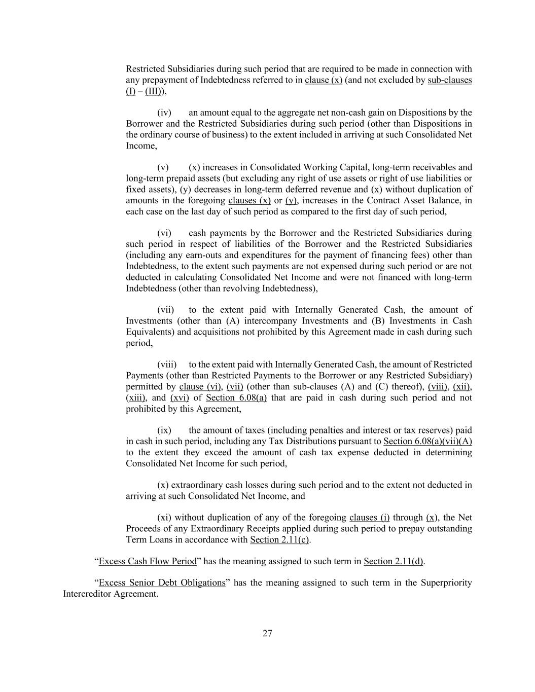27 Restricted Subsidiaries during such period that are required to be made in connection with any prepayment of Indebtedness referred to in clause (x) (and not excluded by sub-clauses (I) – (III)), (iv) an amount equal to the aggregate net non-cash gain on Dispositions by the Borrower and the Restricted Subsidiaries during such period (other than Dispositions in the ordinary course of business) to the extent included in arriving at such Consolidated Net Income, (v) (x) increases in Consolidated Working Capital, long-term receivables and long-term prepaid assets (but excluding any right of use assets or right of use liabilities or fixed assets), (y) decreases in long-term deferred revenue and (x) without duplication of amounts in the foregoing clauses (x) or (y), increases in the Contract Asset Balance, in each case on the last day of such period as compared to the first day of such period, (vi) cash payments by the Borrower and the Restricted Subsidiaries during such period in respect of liabilities of the Borrower and the Restricted Subsidiaries (including any earn-outs and expenditures for the payment of financing fees) other than Indebtedness, to the extent such payments are not expensed during such period or are not deducted in calculating Consolidated Net Income and were not financed with long-term Indebtedness (other than revolving Indebtedness), (vii) to the extent paid with Internally Generated Cash, the amount of Investments (other than (A) intercompany Investments and (B) Investments in Cash Equivalents) and acquisitions not prohibited by this Agreement made in cash during such period, (viii) to the extent paid with Internally Generated Cash, the amount of Restricted Payments (other than Restricted Payments to the Borrower or any Restricted Subsidiary) permitted by clause (vi), (vii) (other than sub-clauses (A) and (C) thereof), (viii), (xii), (xiii), and (xvi) of Section 6.08(a) that are paid in cash during such period and not prohibited by this Agreement, (ix) the amount of taxes (including penalties and interest or tax reserves) paid in cash in such period, including any Tax Distributions pursuant to Section 6.08(a)(vii)(A) to the extent they exceed the amount of cash tax expense deducted in determining Consolidated Net Income for such period, (x) extraordinary cash losses during such period and to the extent not deducted in arriving at such Consolidated Net Income, and (xi) without duplication of any of the foregoing clauses (i) through (x), the Net Proceeds of any Extraordinary Receipts applied during such period to prepay outstanding Term Loans in accordance with Section 2.11(c). “Excess Cash Flow Period” has the meaning assigned to such term in Section 2.11(d). “Excess Senior Debt Obligations” has the meaning assigned to such term in the Superpriority Intercreditor Agreement.