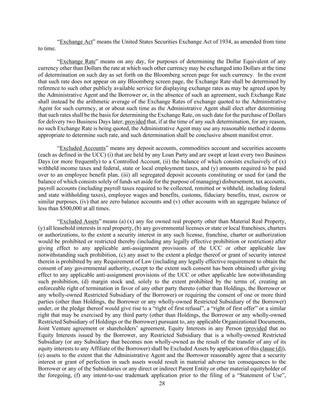 28 “Exchange Act” means the United States Securities Exchange Act of 1934, as amended from time to time. “Exchange Rate” means on any day, for purposes of determining the Dollar Equivalent of any currency other than Dollars the rate at which such other currency may be exchanged into Dollars at the time of determination on such day as set forth on the Bloomberg screen page for such currency. In the event that such rate does not appear on any Bloomberg screen page, the Exchange Rate shall be determined by reference to such other publicly available service for displaying exchange rates as may be agreed upon by the Administrative Agent and the Borrower or, in the absence of such an agreement, such Exchange Rate shall instead be the arithmetic average of the Exchange Rates of exchange quoted to the Administrative Agent for such currency, at or about such time as the Administrative Agent shall elect after determining that such rates shall be the basis for determining the Exchange Rate, on such date for the purchase of Dollars for delivery two Business Days later; provided that, if at the time of any such determination, for any reason, no such Exchange Rate is being quoted, the Administrative Agent may use any reasonable method it deems appropriate to determine such rate, and such determination shall be conclusive absent manifest error. “Excluded Accounts” means any deposit accounts, commodities account and securities accounts (each as defined in the UCC) (i) that are held by any Loan Party and are swept at least every two Business Days (or more frequently) to a Controlled Account, (ii) the balance of which consists exclusively of (x) withheld income taxes and federal, state or local employment taxes, and (y) amounts required to be paid over to an employee benefit plan, (iii) all segregated deposit accounts constituting or used for (and the balance of which consists solely of funds set aside for the purpose of managing) disbursement, tax accounts, payroll accounts (including payroll taxes required to be collected, remitted or withheld, including federal and state withholding taxes), employee wages and benefits, customs, fiduciary benefits, trust, escrow or similar purposes, (iv) that are zero balance accounts and (v) other accounts with an aggregate balance of less than $500,000 at all times. “Excluded Assets” means (a) (x) any fee owned real property other than Material Real Property, (y) all leasehold interests in real property, (b) any governmental licenses or state or local franchises, charters or authorizations, to the extent a security interest in any such license, franchise, charter or authorization would be prohibited or restricted thereby (including any legally effective prohibition or restriction) after giving effect to any applicable anti-assignment provisions of the UCC or other applicable law notwithstanding such prohibition, (c) any asset to the extent a pledge thereof or grant of security interest therein is prohibited by any Requirement of Law (including any legally effective requirement to obtain the consent of any governmental authority, except to the extent such consent has been obtained) after giving effect to any applicable anti-assignment provisions of the UCC or other applicable law notwithstanding such prohibition, (d) margin stock and, solely to the extent prohibited by the terms of, creating an enforceable right of termination in favor of any other party thereto (other than Holdings, the Borrower or any wholly-owned Restricted Subsidiary of the Borrower) or requiring the consent of one or more third parties (other than Holdings, the Borrower or any wholly-owned Restricted Subsidiary of the Borrower) under, or the pledge thereof would give rise to a “right of first refusal”, a “right of first offer” or a similar right that may be exercised by any third party (other than Holdings, the Borrower or any wholly-owned Restricted Subsidiary of Holdings or the Borrower) pursuant to, any applicable Organizational Documents, Joint Venture agreement or shareholders’ agreement, Equity Interests in any Person (provided that no Equity Interests issued by the Borrower, any Restricted Subsidiary that is a wholly-owned Restricted Subsidiary (or any Subsidiary that becomes non wholly-owned as the result of the transfer of any of its equity interests to any Affiliate of the Borrower) shall be Excluded Assets by application of this clause (d)), (e) assets to the extent that the Administrative Agent and the Borrower reasonably agree that a security interest or grant of perfection in such assets would result in material adverse tax consequences to the Borrower or any of the Subsidiaries or any direct or indirect Parent Entity or other material equityholder of the foregoing, (f) any intent-to-use trademark application prior to the filing of a “Statement of Use”,