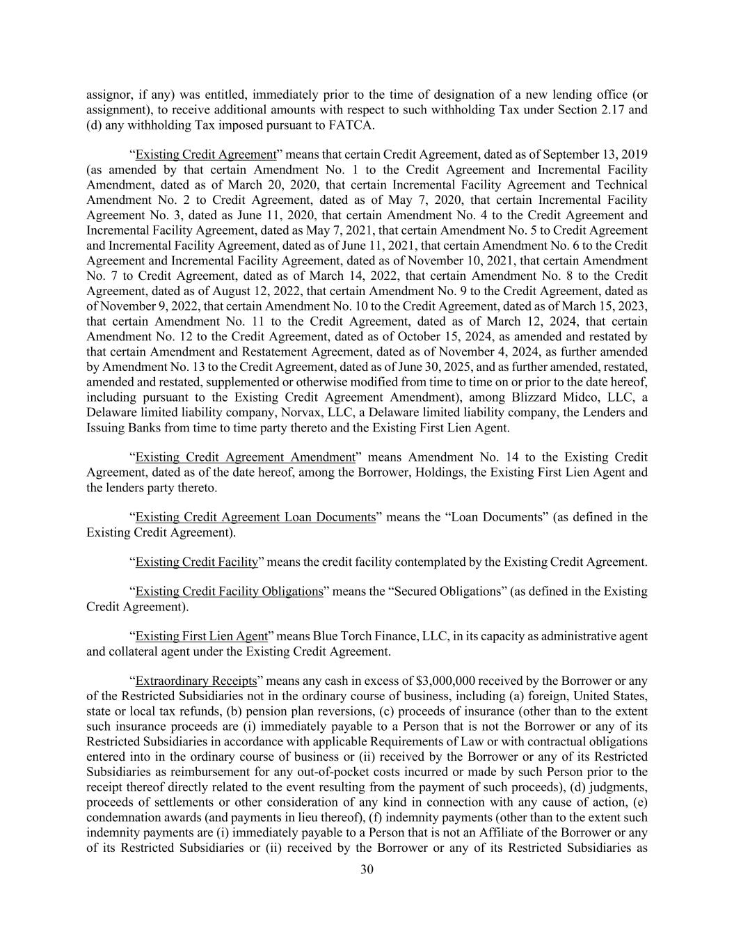 30 assignor, if any) was entitled, immediately prior to the time of designation of a new lending office (or assignment), to receive additional amounts with respect to such withholding Tax under Section 2.17 and (d) any withholding Tax imposed pursuant to FATCA. “Existing Credit Agreement” means that certain Credit Agreement, dated as of September 13, 2019 (as amended by that certain Amendment No. 1 to the Credit Agreement and Incremental Facility Amendment, dated as of March 20, 2020, that certain Incremental Facility Agreement and Technical Amendment No. 2 to Credit Agreement, dated as of May 7, 2020, that certain Incremental Facility Agreement No. 3, dated as June 11, 2020, that certain Amendment No. 4 to the Credit Agreement and Incremental Facility Agreement, dated as May 7, 2021, that certain Amendment No. 5 to Credit Agreement and Incremental Facility Agreement, dated as of June 11, 2021, that certain Amendment No. 6 to the Credit Agreement and Incremental Facility Agreement, dated as of November 10, 2021, that certain Amendment No. 7 to Credit Agreement, dated as of March 14, 2022, that certain Amendment No. 8 to the Credit Agreement, dated as of August 12, 2022, that certain Amendment No. 9 to the Credit Agreement, dated as of November 9, 2022, that certain Amendment No. 10 to the Credit Agreement, dated as of March 15, 2023, that certain Amendment No. 11 to the Credit Agreement, dated as of March 12, 2024, that certain Amendment No. 12 to the Credit Agreement, dated as of October 15, 2024, as amended and restated by that certain Amendment and Restatement Agreement, dated as of November 4, 2024, as further amended by Amendment No. 13 to the Credit Agreement, dated as of June 30, 2025, and as further amended, restated, amended and restated, supplemented or otherwise modified from time to time on or prior to the date hereof, including pursuant to the Existing Credit Agreement Amendment), among Blizzard Midco, LLC, a Delaware limited liability company, Norvax, LLC, a Delaware limited liability company, the Lenders and Issuing Banks from time to time party thereto and the Existing First Lien Agent. “Existing Credit Agreement Amendment” means Amendment No. 14 to the Existing Credit Agreement, dated as of the date hereof, among the Borrower, Holdings, the Existing First Lien Agent and the lenders party thereto. “Existing Credit Agreement Loan Documents” means the “Loan Documents” (as defined in the Existing Credit Agreement). “Existing Credit Facility” means the credit facility contemplated by the Existing Credit Agreement. “Existing Credit Facility Obligations” means the “Secured Obligations” (as defined in the Existing Credit Agreement). “Existing First Lien Agent” means Blue Torch Finance, LLC, in its capacity as administrative agent and collateral agent under the Existing Credit Agreement. “Extraordinary Receipts” means any cash in excess of $3,000,000 received by the Borrower or any of the Restricted Subsidiaries not in the ordinary course of business, including (a) foreign, United States, state or local tax refunds, (b) pension plan reversions, (c) proceeds of insurance (other than to the extent such insurance proceeds are (i) immediately payable to a Person that is not the Borrower or any of its Restricted Subsidiaries in accordance with applicable Requirements of Law or with contractual obligations entered into in the ordinary course of business or (ii) received by the Borrower or any of its Restricted Subsidiaries as reimbursement for any out-of-pocket costs incurred or made by such Person prior to the receipt thereof directly related to the event resulting from the payment of such proceeds), (d) judgments, proceeds of settlements or other consideration of any kind in connection with any cause of action, (e) condemnation awards (and payments in lieu thereof), (f) indemnity payments (other than to the extent such indemnity payments are (i) immediately payable to a Person that is not an Affiliate of the Borrower or any of its Restricted Subsidiaries or (ii) received by the Borrower or any of its Restricted Subsidiaries as