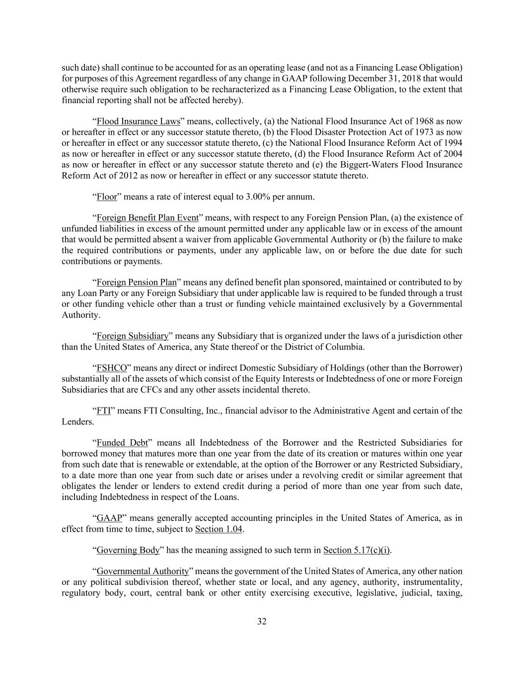 32 such date) shall continue to be accounted for as an operating lease (and not as a Financing Lease Obligation) for purposes of this Agreement regardless of any change in GAAP following December 31, 2018 that would otherwise require such obligation to be recharacterized as a Financing Lease Obligation, to the extent that financial reporting shall not be affected hereby). “Flood Insurance Laws” means, collectively, (a) the National Flood Insurance Act of 1968 as now or hereafter in effect or any successor statute thereto, (b) the Flood Disaster Protection Act of 1973 as now or hereafter in effect or any successor statute thereto, (c) the National Flood Insurance Reform Act of 1994 as now or hereafter in effect or any successor statute thereto, (d) the Flood Insurance Reform Act of 2004 as now or hereafter in effect or any successor statute thereto and (e) the Biggert-Waters Flood Insurance Reform Act of 2012 as now or hereafter in effect or any successor statute thereto. “Floor” means a rate of interest equal to 3.00% per annum. “Foreign Benefit Plan Event” means, with respect to any Foreign Pension Plan, (a) the existence of unfunded liabilities in excess of the amount permitted under any applicable law or in excess of the amount that would be permitted absent a waiver from applicable Governmental Authority or (b) the failure to make the required contributions or payments, under any applicable law, on or before the due date for such contributions or payments. “Foreign Pension Plan” means any defined benefit plan sponsored, maintained or contributed to by any Loan Party or any Foreign Subsidiary that under applicable law is required to be funded through a trust or other funding vehicle other than a trust or funding vehicle maintained exclusively by a Governmental Authority. “Foreign Subsidiary” means any Subsidiary that is organized under the laws of a jurisdiction other than the United States of America, any State thereof or the District of Columbia. “FSHCO” means any direct or indirect Domestic Subsidiary of Holdings (other than the Borrower) substantially all of the assets of which consist of the Equity Interests or Indebtedness of one or more Foreign Subsidiaries that are CFCs and any other assets incidental thereto. “FTI” means FTI Consulting, Inc., financial advisor to the Administrative Agent and certain of the Lenders. “Funded Debt” means all Indebtedness of the Borrower and the Restricted Subsidiaries for borrowed money that matures more than one year from the date of its creation or matures within one year from such date that is renewable or extendable, at the option of the Borrower or any Restricted Subsidiary, to a date more than one year from such date or arises under a revolving credit or similar agreement that obligates the lender or lenders to extend credit during a period of more than one year from such date, including Indebtedness in respect of the Loans. “GAAP” means generally accepted accounting principles in the United States of America, as in effect from time to time, subject to Section 1.04. “Governing Body” has the meaning assigned to such term in Section 5.17(c)(i). “Governmental Authority” means the government of the United States of America, any other nation or any political subdivision thereof, whether state or local, and any agency, authority, instrumentality, regulatory body, court, central bank or other entity exercising executive, legislative, judicial, taxing,