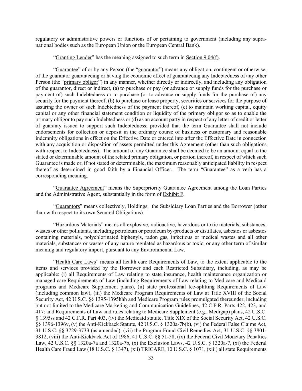 33 regulatory or administrative powers or functions of or pertaining to government (including any supra- national bodies such as the European Union or the European Central Bank). “Granting Lender” has the meaning assigned to such term in Section 9.04(f). “Guarantee” of or by any Person (the “guarantor”) means any obligation, contingent or otherwise, of the guarantor guaranteeing or having the economic effect of guaranteeing any Indebtedness of any other Person (the “primary obligor”) in any manner, whether directly or indirectly, and including any obligation of the guarantor, direct or indirect, (a) to purchase or pay (or advance or supply funds for the purchase or payment of) such Indebtedness or to purchase (or to advance or supply funds for the purchase of) any security for the payment thereof, (b) to purchase or lease property, securities or services for the purpose of assuring the owner of such Indebtedness of the payment thereof, (c) to maintain working capital, equity capital or any other financial statement condition or liquidity of the primary obligor so as to enable the primary obligor to pay such Indebtedness or (d) as an account party in respect of any letter of credit or letter of guaranty issued to support such Indebtedness; provided that the term Guarantee shall not include endorsements for collection or deposit in the ordinary course of business or customary and reasonable indemnity obligations in effect on the Effective Date or entered into after the Effective Date in connection with any acquisition or disposition of assets permitted under this Agreement (other than such obligations with respect to Indebtedness). The amount of any Guarantee shall be deemed to be an amount equal to the stated or determinable amount of the related primary obligation, or portion thereof, in respect of which such Guarantee is made or, if not stated or determinable, the maximum reasonably anticipated liability in respect thereof as determined in good faith by a Financial Officer. The term “Guarantee” as a verb has a corresponding meaning. “Guarantee Agreement” means the Superpriority Guarantee Agreement among the Loan Parties and the Administrative Agent, substantially in the form of Exhibit F. “Guarantors” means collectively, Holdings, the Subsidiary Loan Parties and the Borrower (other than with respect to its own Secured Obligations). “Hazardous Materials” means all explosive, radioactive, hazardous or toxic materials, substances, wastes or other pollutants, including petroleum or petroleum by-products or distillates, asbestos or asbestos containing materials, polychlorinated biphenyls, radon gas, infectious or medical wastes and all other materials, substances or wastes of any nature regulated as hazardous or toxic, or any other term of similar meaning and regulatory import, pursuant to any Environmental Law. “Health Care Laws” means all health care Requirements of Law, to the extent applicable to the items and services provided by the Borrower and each Restricted Subsidiary, including, as may be applicable: (i) all Requirements of Law relating to state insurance, health maintenance organization or managed care Requirements of Law (including Requirements of Law relating to Medicare and Medicaid programs and Medicare Supplement plans), (ii) state professional fee-splitting Requirements of Law (including common law), (iii) the Medicare Program Requirements of Law at Title XVIII of the Social Security Act, 42 U.S.C. §§ 1395-1395hhh and Medicare Program rules promulgated thereunder, including but not limited to the Medicare Marketing and Communication Guidelines, 42 C.F.R. Parts 422, 423, and 417; and Requirements of Law and rules relating to Medicare Supplement (e.g., Medigap) plans, 42 U.S.C. § 1395ss and 42 C.F.R. Part 403, (iv) the Medicaid statute, Title XIX of the Social Security Act, 42 U.S.C. §§ 1396-1396v, (v) the Anti-Kickback Statute, 42 U.S.C. § 1320a-7b(b), (vi) the Federal False Claims Act, 31 U.S.C. §§ 3729-3733 (as amended), (vii) the Program Fraud Civil Remedies Act, 31 U.S.C. §§ 3801- 3812, (viii) the Anti-Kickback Act of 1986, 41 U.S.C. §§ 51-58, (ix) the Federal Civil Monetary Penalties Law, 42 U.S.C. §§ 1320a-7a and 1320a-7b, (x) the Exclusion Laws, 42 U.S.C. § 1320a-7, (xi) the Federal Health Care Fraud Law (18 U.S.C. § 1347), (xii) TRICARE, 10 U.S.C. § 1071, (xiii) all state Requirements