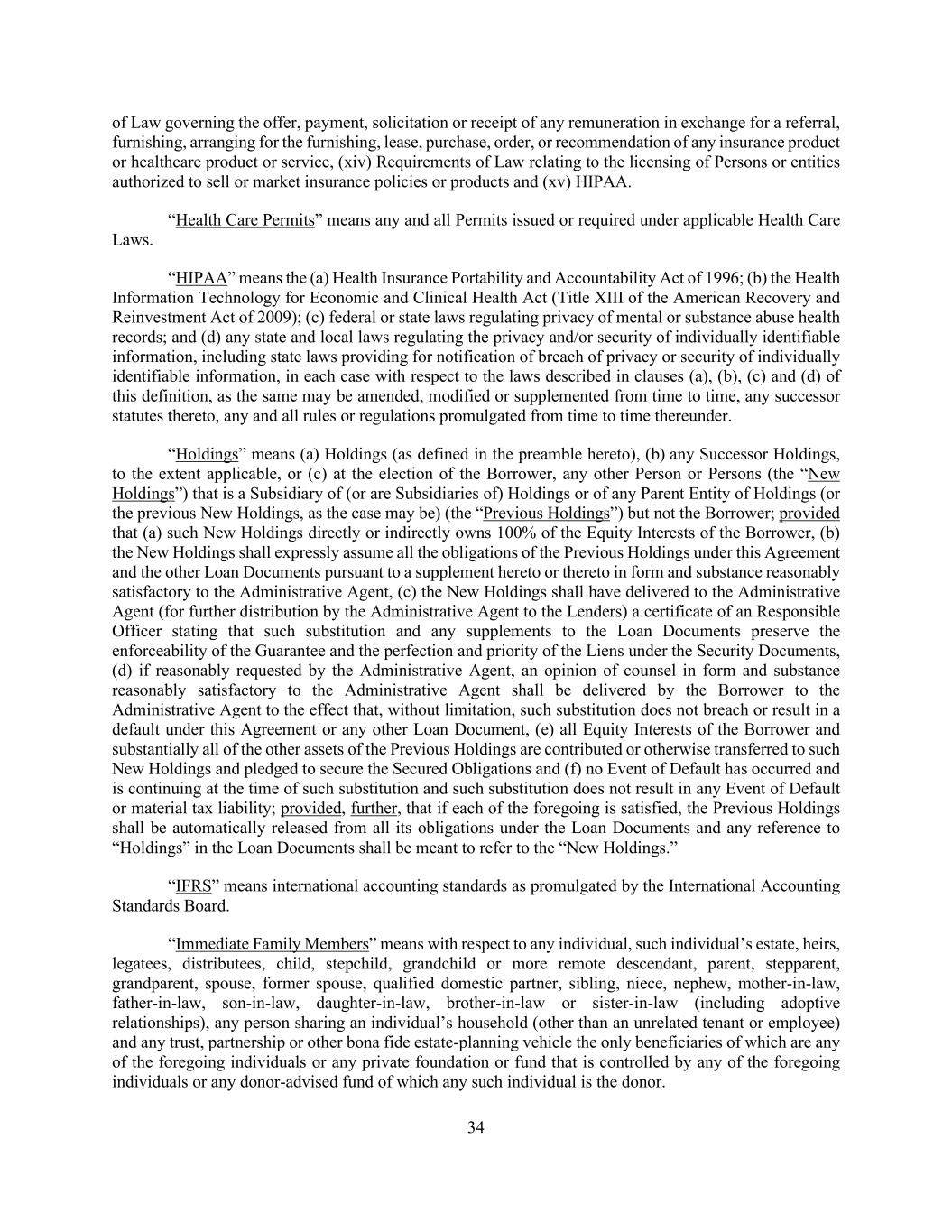 34 of Law governing the offer, payment, solicitation or receipt of any remuneration in exchange for a referral, furnishing, arranging for the furnishing, lease, purchase, order, or recommendation of any insurance product or healthcare product or service, (xiv) Requirements of Law relating to the licensing of Persons or entities authorized to sell or market insurance policies or products and (xv) HIPAA. “Health Care Permits” means any and all Permits issued or required under applicable Health Care Laws. “HIPAA” means the (a) Health Insurance Portability and Accountability Act of 1996; (b) the Health Information Technology for Economic and Clinical Health Act (Title XIII of the American Recovery and Reinvestment Act of 2009); (c) federal or state laws regulating privacy of mental or substance abuse health records; and (d) any state and local laws regulating the privacy and/or security of individually identifiable information, including state laws providing for notification of breach of privacy or security of individually identifiable information, in each case with respect to the laws described in clauses (a), (b), (c) and (d) of this definition, as the same may be amended, modified or supplemented from time to time, any successor statutes thereto, any and all rules or regulations promulgated from time to time thereunder. “Holdings” means (a) Holdings (as defined in the preamble hereto), (b) any Successor Holdings, to the extent applicable, or (c) at the election of the Borrower, any other Person or Persons (the “New Holdings”) that is a Subsidiary of (or are Subsidiaries of) Holdings or of any Parent Entity of Holdings (or the previous New Holdings, as the case may be) (the “Previous Holdings”) but not the Borrower; provided that (a) such New Holdings directly or indirectly owns 100% of the Equity Interests of the Borrower, (b) the New Holdings shall expressly assume all the obligations of the Previous Holdings under this Agreement and the other Loan Documents pursuant to a supplement hereto or thereto in form and substance reasonably satisfactory to the Administrative Agent, (c) the New Holdings shall have delivered to the Administrative Agent (for further distribution by the Administrative Agent to the Lenders) a certificate of an Responsible Officer stating that such substitution and any supplements to the Loan Documents preserve the enforceability of the Guarantee and the perfection and priority of the Liens under the Security Documents, (d) if reasonably requested by the Administrative Agent, an opinion of counsel in form and substance reasonably satisfactory to the Administrative Agent shall be delivered by the Borrower to the Administrative Agent to the effect that, without limitation, such substitution does not breach or result in a default under this Agreement or any other Loan Document, (e) all Equity Interests of the Borrower and substantially all of the other assets of the Previous Holdings are contributed or otherwise transferred to such New Holdings and pledged to secure the Secured Obligations and (f) no Event of Default has occurred and is continuing at the time of such substitution and such substitution does not result in any Event of Default or material tax liability; provided, further, that if each of the foregoing is satisfied, the Previous Holdings shall be automatically released from all its obligations under the Loan Documents and any reference to “Holdings” in the Loan Documents shall be meant to refer to the “New Holdings.” “IFRS” means international accounting standards as promulgated by the International Accounting Standards Board. “Immediate Family Members” means with respect to any individual, such individual’s estate, heirs, legatees, distributees, child, stepchild, grandchild or more remote descendant, parent, stepparent, grandparent, spouse, former spouse, qualified domestic partner, sibling, niece, nephew, mother-in-law, father-in-law, son-in-law, daughter-in-law, brother-in-law or sister-in-law (including adoptive relationships), any person sharing an individual’s household (other than an unrelated tenant or employee) and any trust, partnership or other bona fide estate-planning vehicle the only beneficiaries of which are any of the foregoing individuals or any private foundation or fund that is controlled by any of the foregoing individuals or any donor-advised fund of which any such individual is the donor.