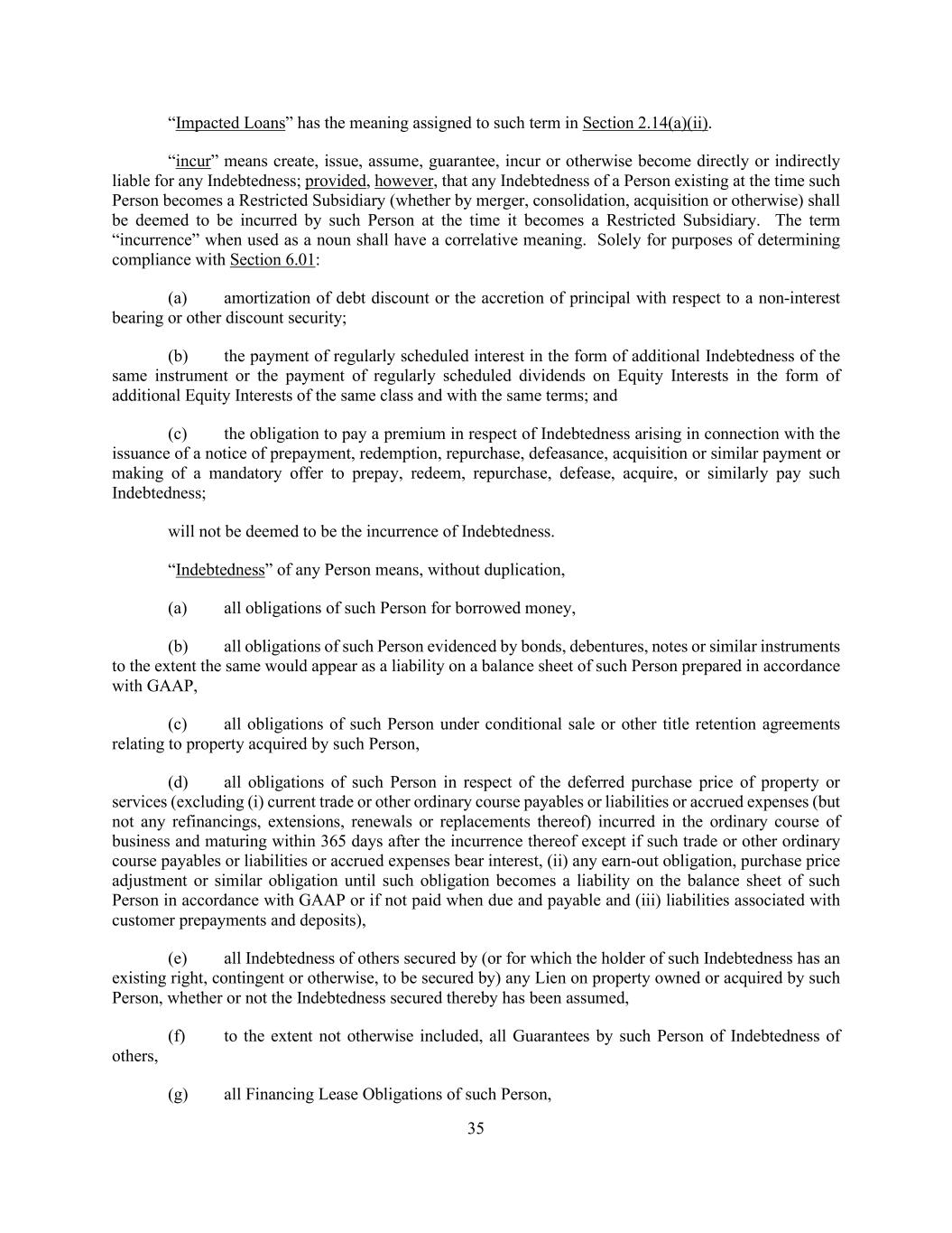 35 “Impacted Loans” has the meaning assigned to such term in Section 2.14(a)(ii). “incur” means create, issue, assume, guarantee, incur or otherwise become directly or indirectly liable for any Indebtedness; provided, however, that any Indebtedness of a Person existing at the time such Person becomes a Restricted Subsidiary (whether by merger, consolidation, acquisition or otherwise) shall be deemed to be incurred by such Person at the time it becomes a Restricted Subsidiary. The term “incurrence” when used as a noun shall have a correlative meaning. Solely for purposes of determining compliance with Section 6.01: (a) amortization of debt discount or the accretion of principal with respect to a non-interest bearing or other discount security; (b) the payment of regularly scheduled interest in the form of additional Indebtedness of the same instrument or the payment of regularly scheduled dividends on Equity Interests in the form of additional Equity Interests of the same class and with the same terms; and (c) the obligation to pay a premium in respect of Indebtedness arising in connection with the issuance of a notice of prepayment, redemption, repurchase, defeasance, acquisition or similar payment or making of a mandatory offer to prepay, redeem, repurchase, defease, acquire, or similarly pay such Indebtedness; will not be deemed to be the incurrence of Indebtedness. “Indebtedness” of any Person means, without duplication, (a) all obligations of such Person for borrowed money, (b) all obligations of such Person evidenced by bonds, debentures, notes or similar instruments to the extent the same would appear as a liability on a balance sheet of such Person prepared in accordance with GAAP, (c) all obligations of such Person under conditional sale or other title retention agreements relating to property acquired by such Person, (d) all obligations of such Person in respect of the deferred purchase price of property or services (excluding (i) current trade or other ordinary course payables or liabilities or accrued expenses (but not any refinancings, extensions, renewals or replacements thereof) incurred in the ordinary course of business and maturing within 365 days after the incurrence thereof except if such trade or other ordinary course payables or liabilities or accrued expenses bear interest, (ii) any earn-out obligation, purchase price adjustment or similar obligation until such obligation becomes a liability on the balance sheet of such Person in accordance with GAAP or if not paid when due and payable and (iii) liabilities associated with customer prepayments and deposits), (e) all Indebtedness of others secured by (or for which the holder of such Indebtedness has an existing right, contingent or otherwise, to be secured by) any Lien on property owned or acquired by such Person, whether or not the Indebtedness secured thereby has been assumed, (f) to the extent not otherwise included, all Guarantees by such Person of Indebtedness of others, (g) all Financing Lease Obligations of such Person,