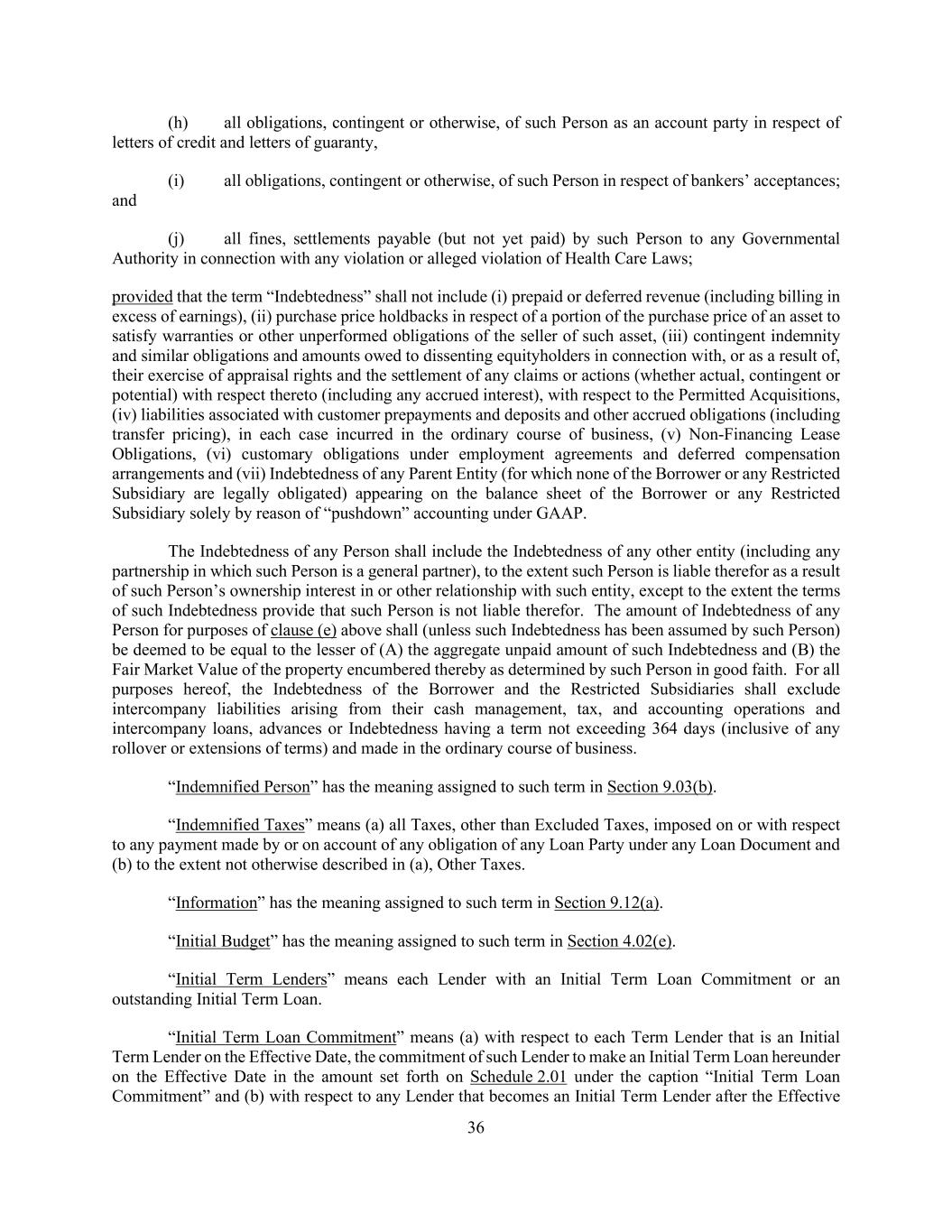 36 (h) all obligations, contingent or otherwise, of such Person as an account party in respect of letters of credit and letters of guaranty, (i) all obligations, contingent or otherwise, of such Person in respect of bankers’ acceptances; and (j) all fines, settlements payable (but not yet paid) by such Person to any Governmental Authority in connection with any violation or alleged violation of Health Care Laws; provided that the term “Indebtedness” shall not include (i) prepaid or deferred revenue (including billing in excess of earnings), (ii) purchase price holdbacks in respect of a portion of the purchase price of an asset to satisfy warranties or other unperformed obligations of the seller of such asset, (iii) contingent indemnity and similar obligations and amounts owed to dissenting equityholders in connection with, or as a result of, their exercise of appraisal rights and the settlement of any claims or actions (whether actual, contingent or potential) with respect thereto (including any accrued interest), with respect to the Permitted Acquisitions, (iv) liabilities associated with customer prepayments and deposits and other accrued obligations (including transfer pricing), in each case incurred in the ordinary course of business, (v) Non-Financing Lease Obligations, (vi) customary obligations under employment agreements and deferred compensation arrangements and (vii) Indebtedness of any Parent Entity (for which none of the Borrower or any Restricted Subsidiary are legally obligated) appearing on the balance sheet of the Borrower or any Restricted Subsidiary solely by reason of “pushdown” accounting under GAAP. The Indebtedness of any Person shall include the Indebtedness of any other entity (including any partnership in which such Person is a general partner), to the extent such Person is liable therefor as a result of such Person’s ownership interest in or other relationship with such entity, except to the extent the terms of such Indebtedness provide that such Person is not liable therefor. The amount of Indebtedness of any Person for purposes of clause (e) above shall (unless such Indebtedness has been assumed by such Person) be deemed to be equal to the lesser of (A) the aggregate unpaid amount of such Indebtedness and (B) the Fair Market Value of the property encumbered thereby as determined by such Person in good faith. For all purposes hereof, the Indebtedness of the Borrower and the Restricted Subsidiaries shall exclude intercompany liabilities arising from their cash management, tax, and accounting operations and intercompany loans, advances or Indebtedness having a term not exceeding 364 days (inclusive of any rollover or extensions of terms) and made in the ordinary course of business. “Indemnified Person” has the meaning assigned to such term in Section 9.03(b). “Indemnified Taxes” means (a) all Taxes, other than Excluded Taxes, imposed on or with respect to any payment made by or on account of any obligation of any Loan Party under any Loan Document and (b) to the extent not otherwise described in (a), Other Taxes. “Information” has the meaning assigned to such term in Section 9.12(a). “Initial Budget” has the meaning assigned to such term in Section 4.02(e). “Initial Term Lenders” means each Lender with an Initial Term Loan Commitment or an outstanding Initial Term Loan. “Initial Term Loan Commitment” means (a) with respect to each Term Lender that is an Initial Term Lender on the Effective Date, the commitment of such Lender to make an Initial Term Loan hereunder on the Effective Date in the amount set forth on Schedule 2.01 under the caption “Initial Term Loan Commitment” and (b) with respect to any Lender that becomes an Initial Term Lender after the Effective