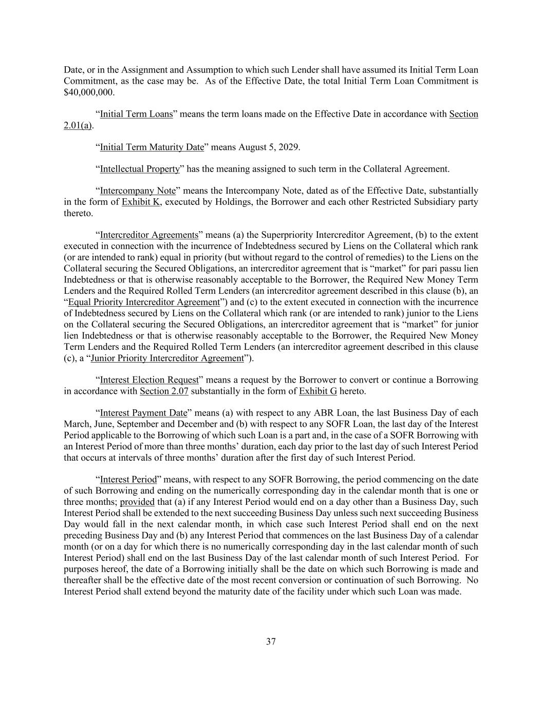 37 Date, or in the Assignment and Assumption to which such Lender shall have assumed its Initial Term Loan Commitment, as the case may be. As of the Effective Date, the total Initial Term Loan Commitment is $40,000,000. “Initial Term Loans” means the term loans made on the Effective Date in accordance with Section 2.01(a). “Initial Term Maturity Date” means August 5, 2029. “Intellectual Property” has the meaning assigned to such term in the Collateral Agreement. “Intercompany Note” means the Intercompany Note, dated as of the Effective Date, substantially in the form of Exhibit K, executed by Holdings, the Borrower and each other Restricted Subsidiary party thereto. “Intercreditor Agreements” means (a) the Superpriority Intercreditor Agreement, (b) to the extent executed in connection with the incurrence of Indebtedness secured by Liens on the Collateral which rank (or are intended to rank) equal in priority (but without regard to the control of remedies) to the Liens on the Collateral securing the Secured Obligations, an intercreditor agreement that is “market” for pari passu lien Indebtedness or that is otherwise reasonably acceptable to the Borrower, the Required New Money Term Lenders and the Required Rolled Term Lenders (an intercreditor agreement described in this clause (b), an “Equal Priority Intercreditor Agreement”) and (c) to the extent executed in connection with the incurrence of Indebtedness secured by Liens on the Collateral which rank (or are intended to rank) junior to the Liens on the Collateral securing the Secured Obligations, an intercreditor agreement that is “market” for junior lien Indebtedness or that is otherwise reasonably acceptable to the Borrower, the Required New Money Term Lenders and the Required Rolled Term Lenders (an intercreditor agreement described in this clause (c), a “Junior Priority Intercreditor Agreement”). “Interest Election Request” means a request by the Borrower to convert or continue a Borrowing in accordance with Section 2.07 substantially in the form of Exhibit G hereto. “Interest Payment Date” means (a) with respect to any ABR Loan, the last Business Day of each March, June, September and December and (b) with respect to any SOFR Loan, the last day of the Interest Period applicable to the Borrowing of which such Loan is a part and, in the case of a SOFR Borrowing with an Interest Period of more than three months’ duration, each day prior to the last day of such Interest Period that occurs at intervals of three months’ duration after the first day of such Interest Period. “Interest Period” means, with respect to any SOFR Borrowing, the period commencing on the date of such Borrowing and ending on the numerically corresponding day in the calendar month that is one or three months; provided that (a) if any Interest Period would end on a day other than a Business Day, such Interest Period shall be extended to the next succeeding Business Day unless such next succeeding Business Day would fall in the next calendar month, in which case such Interest Period shall end on the next preceding Business Day and (b) any Interest Period that commences on the last Business Day of a calendar month (or on a day for which there is no numerically corresponding day in the last calendar month of such Interest Period) shall end on the last Business Day of the last calendar month of such Interest Period. For purposes hereof, the date of a Borrowing initially shall be the date on which such Borrowing is made and thereafter shall be the effective date of the most recent conversion or continuation of such Borrowing. No Interest Period shall extend beyond the maturity date of the facility under which such Loan was made.