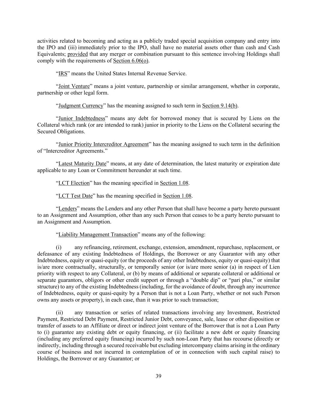 39 activities related to becoming and acting as a publicly traded special acquisition company and entry into the IPO and (iii) immediately prior to the IPO, shall have no material assets other than cash and Cash Equivalents; provided that any merger or combination pursuant to this sentence involving Holdings shall comply with the requirements of Section 6.06(o). “IRS” means the United States Internal Revenue Service. “Joint Venture” means a joint venture, partnership or similar arrangement, whether in corporate, partnership or other legal form. “Judgment Currency” has the meaning assigned to such term in Section 9.14(b). “Junior Indebtedness” means any debt for borrowed money that is secured by Liens on the Collateral which rank (or are intended to rank) junior in priority to the Liens on the Collateral securing the Secured Obligations. “Junior Priority Intercreditor Agreement” has the meaning assigned to such term in the definition of “Intercreditor Agreements.” “Latest Maturity Date” means, at any date of determination, the latest maturity or expiration date applicable to any Loan or Commitment hereunder at such time. “LCT Election” has the meaning specified in Section 1.08. “LCT Test Date” has the meaning specified in Section 1.08. “Lenders” means the Lenders and any other Person that shall have become a party hereto pursuant to an Assignment and Assumption, other than any such Person that ceases to be a party hereto pursuant to an Assignment and Assumption. “Liability Management Transaction” means any of the following: (i) any refinancing, retirement, exchange, extension, amendment, repurchase, replacement, or defeasance of any existing Indebtedness of Holdings, the Borrower or any Guarantor with any other Indebtedness, equity or quasi-equity (or the proceeds of any other Indebtedness, equity or quasi-equity) that is/are more contractually, structurally, or temporally senior (or is/are more senior (a) in respect of Lien priority with respect to any Collateral, or (b) by means of additional or separate collateral or additional or separate guarantors, obligors or other credit support or through a “double dip” or “pari plus,” or similar structure) to any of the existing Indebtedness (including, for the avoidance of doubt, through any incurrence of Indebtedness, equity or quasi-equity by a Person that is not a Loan Party, whether or not such Person owns any assets or property), in each case, than it was prior to such transaction; (ii) any transaction or series of related transactions involving any Investment, Restricted Payment, Restricted Debt Payment, Restricted Junior Debt, conveyance, sale, lease or other disposition or transfer of assets to an Affiliate or direct or indirect joint venture of the Borrower that is not a Loan Party to (i) guarantee any existing debt or equity financing, or (ii) facilitate a new debt or equity financing (including any preferred equity financing) incurred by such non-Loan Party that has recourse (directly or indirectly, including through a secured receivable but excluding intercompany claims arising in the ordinary course of business and not incurred in contemplation of or in connection with such capital raise) to Holdings, the Borrower or any Guarantor; or