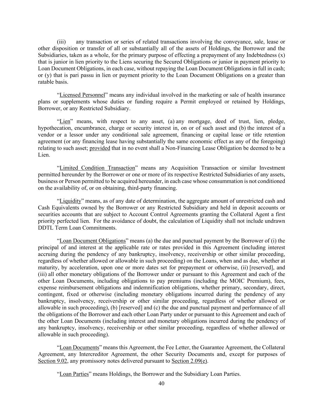 40 (iii) any transaction or series of related transactions involving the conveyance, sale, lease or other disposition or transfer of all or substantially all of the assets of Holdings, the Borrower and the Subsidiaries, taken as a whole, for the primary purpose of effecting a prepayment of any Indebtedness (x) that is junior in lien priority to the Liens securing the Secured Obligations or junior in payment priority to Loan Document Obligations, in each case, without repaying the Loan Document Obligations in full in cash; or (y) that is pari passu in lien or payment priority to the Loan Document Obligations on a greater than ratable basis. “Licensed Personnel” means any individual involved in the marketing or sale of health insurance plans or supplements whose duties or funding require a Permit employed or retained by Holdings, Borrower, or any Restricted Subsidiary. “Lien” means, with respect to any asset, (a) any mortgage, deed of trust, lien, pledge, hypothecation, encumbrance, charge or security interest in, on or of such asset and (b) the interest of a vendor or a lessor under any conditional sale agreement, financing or capital lease or title retention agreement (or any financing lease having substantially the same economic effect as any of the foregoing) relating to such asset; provided that in no event shall a Non-Financing Lease Obligation be deemed to be a Lien. “Limited Condition Transaction” means any Acquisition Transaction or similar Investment permitted hereunder by the Borrower or one or more of its respective Restricted Subsidiaries of any assets, business or Person permitted to be acquired hereunder, in each case whose consummation is not conditioned on the availability of, or on obtaining, third-party financing. “Liquidity” means, as of any date of determination, the aggregate amount of unrestricted cash and Cash Equivalents owned by the Borrower or any Restricted Subsidiary and held in deposit accounts or securities accounts that are subject to Account Control Agreements granting the Collateral Agent a first priority perfected lien. For the avoidance of doubt, the calculation of Liquidity shall not include undrawn DDTL Term Loan Commitments. “Loan Document Obligations” means (a) the due and punctual payment by the Borrower of (i) the principal of and interest at the applicable rate or rates provided in this Agreement (including interest accruing during the pendency of any bankruptcy, insolvency, receivership or other similar proceeding, regardless of whether allowed or allowable in such proceeding) on the Loans, when and as due, whether at maturity, by acceleration, upon one or more dates set for prepayment or otherwise, (ii) [reserved], and (iii) all other monetary obligations of the Borrower under or pursuant to this Agreement and each of the other Loan Documents, including obligations to pay premiums (including the MOIC Premium), fees, expense reimbursement obligations and indemnification obligations, whether primary, secondary, direct, contingent, fixed or otherwise (including monetary obligations incurred during the pendency of any bankruptcy, insolvency, receivership or other similar proceeding, regardless of whether allowed or allowable in such proceeding), (b) [reserved] and (c) the due and punctual payment and performance of all the obligations of the Borrower and each other Loan Party under or pursuant to this Agreement and each of the other Loan Documents (including interest and monetary obligations incurred during the pendency of any bankruptcy, insolvency, receivership or other similar proceeding, regardless of whether allowed or allowable in such proceeding). “Loan Documents” means this Agreement, the Fee Letter, the Guarantee Agreement, the Collateral Agreement, any Intercreditor Agreement, the other Security Documents and, except for purposes of Section 9.02, any promissory notes delivered pursuant to Section 2.09(e). “Loan Parties” means Holdings, the Borrower and the Subsidiary Loan Parties.