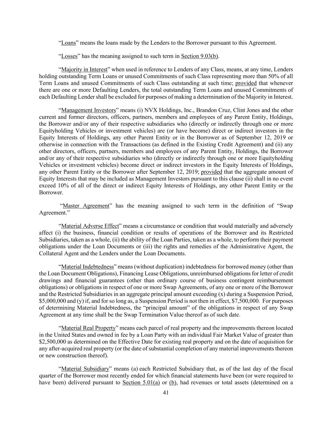 41 “Loans” means the loans made by the Lenders to the Borrower pursuant to this Agreement. “Losses” has the meaning assigned to such term in Section 9.03(b). “Majority in Interest” when used in reference to Lenders of any Class, means, at any time, Lenders holding outstanding Term Loans or unused Commitments of such Class representing more than 50% of all Term Loans and unused Commitments of such Class outstanding at such time; provided that whenever there are one or more Defaulting Lenders, the total outstanding Term Loans and unused Commitments of each Defaulting Lender shall be excluded for purposes of making a determination of the Majority in Interest. “Management Investors” means (i) NVX Holdings, Inc., Brandon Cruz, Clint Jones and the other current and former directors, officers, partners, members and employees of any Parent Entity, Holdings, the Borrower and/or any of their respective subsidiaries who (directly or indirectly through one or more Equityholding Vehicles or investment vehicles) are (or have become) direct or indirect investors in the Equity Interests of Holdings, any other Parent Entity or in the Borrower as of September 12, 2019 or otherwise in connection with the Transactions (as defined in the Existing Credit Agreement) and (ii) any other directors, officers, partners, members and employees of any Parent Entity, Holdings, the Borrower and/or any of their respective subsidiaries who (directly or indirectly through one or more Equityholding Vehicles or investment vehicles) become direct or indirect investors in the Equity Interests of Holdings, any other Parent Entity or the Borrower after September 12, 2019; provided that the aggregate amount of Equity Interests that may be included as Management Investors pursuant to this clause (ii) shall in no event exceed 10% of all of the direct or indirect Equity Interests of Holdings, any other Parent Entity or the Borrower. “Master Agreement” has the meaning assigned to such term in the definition of “Swap Agreement.” “Material Adverse Effect” means a circumstance or condition that would materially and adversely affect (i) the business, financial condition or results of operations of the Borrower and its Restricted Subsidiaries, taken as a whole, (ii) the ability of the Loan Parties, taken as a whole, to perform their payment obligations under the Loan Documents or (iii) the rights and remedies of the Administrative Agent, the Collateral Agent and the Lenders under the Loan Documents. “Material Indebtedness” means (without duplication) indebtedness for borrowed money (other than the Loan Document Obligations), Financing Lease Obligations, unreimbursed obligations for letter of credit drawings and financial guarantees (other than ordinary course of business contingent reimbursement obligations) or obligations in respect of one or more Swap Agreements, of any one or more of the Borrower and the Restricted Subsidiaries in an aggregate principal amount exceeding (x) during a Suspension Period, $5,000,000 and (y) if, and for so long as, a Suspension Period is not then in effect, $7,500,000. For purposes of determining Material Indebtedness, the “principal amount” of the obligations in respect of any Swap Agreement at any time shall be the Swap Termination Value thereof as of such date. “Material Real Property” means each parcel of real property and the improvements thereon located in the United States and owned in fee by a Loan Party with an individual Fair Market Value of greater than $2,500,000 as determined on the Effective Date for existing real property and on the date of acquisition for any after-acquired real property (or the date of substantial completion of any material improvements thereon or new construction thereof). “Material Subsidiary” means (a) each Restricted Subsidiary that, as of the last day of the fiscal quarter of the Borrower most recently ended for which financial statements have been (or were required to have been) delivered pursuant to Section 5.01(a) or (b), had revenues or total assets (determined on a