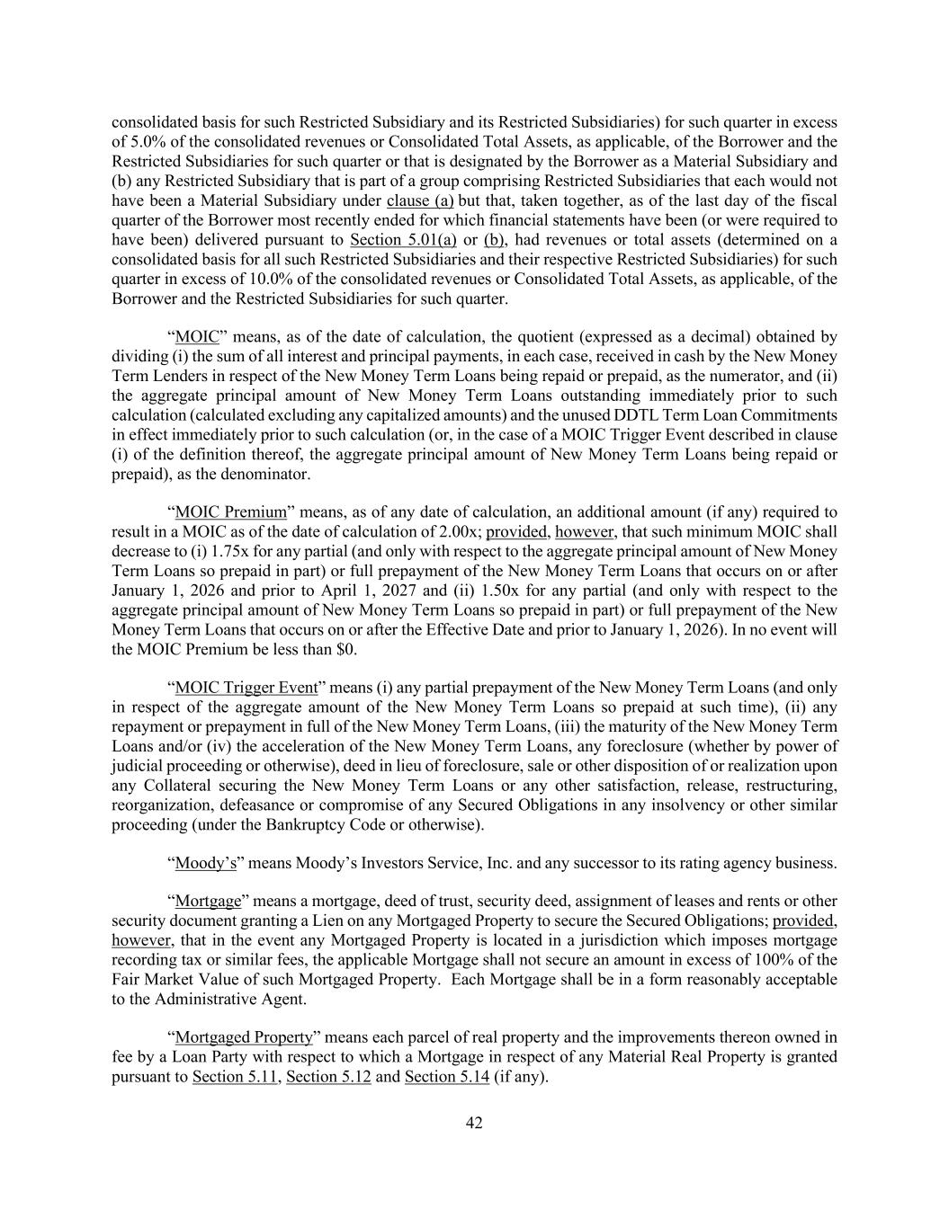 42 consolidated basis for such Restricted Subsidiary and its Restricted Subsidiaries) for such quarter in excess of 5.0% of the consolidated revenues or Consolidated Total Assets, as applicable, of the Borrower and the Restricted Subsidiaries for such quarter or that is designated by the Borrower as a Material Subsidiary and (b) any Restricted Subsidiary that is part of a group comprising Restricted Subsidiaries that each would not have been a Material Subsidiary under clause (a) but that, taken together, as of the last day of the fiscal quarter of the Borrower most recently ended for which financial statements have been (or were required to have been) delivered pursuant to Section 5.01(a) or (b), had revenues or total assets (determined on a consolidated basis for all such Restricted Subsidiaries and their respective Restricted Subsidiaries) for such quarter in excess of 10.0% of the consolidated revenues or Consolidated Total Assets, as applicable, of the Borrower and the Restricted Subsidiaries for such quarter. “MOIC” means, as of the date of calculation, the quotient (expressed as a decimal) obtained by dividing (i) the sum of all interest and principal payments, in each case, received in cash by the New Money Term Lenders in respect of the New Money Term Loans being repaid or prepaid, as the numerator, and (ii) the aggregate principal amount of New Money Term Loans outstanding immediately prior to such calculation (calculated excluding any capitalized amounts) and the unused DDTL Term Loan Commitments in effect immediately prior to such calculation (or, in the case of a MOIC Trigger Event described in clause (i) of the definition thereof, the aggregate principal amount of New Money Term Loans being repaid or prepaid), as the denominator. “MOIC Premium” means, as of any date of calculation, an additional amount (if any) required to result in a MOIC as of the date of calculation of 2.00x; provided, however, that such minimum MOIC shall decrease to (i) 1.75x for any partial (and only with respect to the aggregate principal amount of New Money Term Loans so prepaid in part) or full prepayment of the New Money Term Loans that occurs on or after January 1, 2026 and prior to April 1, 2027 and (ii) 1.50x for any partial (and only with respect to the aggregate principal amount of New Money Term Loans so prepaid in part) or full prepayment of the New Money Term Loans that occurs on or after the Effective Date and prior to January 1, 2026). In no event will the MOIC Premium be less than $0. “MOIC Trigger Event” means (i) any partial prepayment of the New Money Term Loans (and only in respect of the aggregate amount of the New Money Term Loans so prepaid at such time), (ii) any repayment or prepayment in full of the New Money Term Loans, (iii) the maturity of the New Money Term Loans and/or (iv) the acceleration of the New Money Term Loans, any foreclosure (whether by power of judicial proceeding or otherwise), deed in lieu of foreclosure, sale or other disposition of or realization upon any Collateral securing the New Money Term Loans or any other satisfaction, release, restructuring, reorganization, defeasance or compromise of any Secured Obligations in any insolvency or other similar proceeding (under the Bankruptcy Code or otherwise). “Moody’s” means Moody’s Investors Service, Inc. and any successor to its rating agency business. “Mortgage” means a mortgage, deed of trust, security deed, assignment of leases and rents or other security document granting a Lien on any Mortgaged Property to secure the Secured Obligations; provided, however, that in the event any Mortgaged Property is located in a jurisdiction which imposes mortgage recording tax or similar fees, the applicable Mortgage shall not secure an amount in excess of 100% of the Fair Market Value of such Mortgaged Property. Each Mortgage shall be in a form reasonably acceptable to the Administrative Agent. “Mortgaged Property” means each parcel of real property and the improvements thereon owned in fee by a Loan Party with respect to which a Mortgage in respect of any Material Real Property is granted pursuant to Section 5.11, Section 5.12 and Section 5.14 (if any).