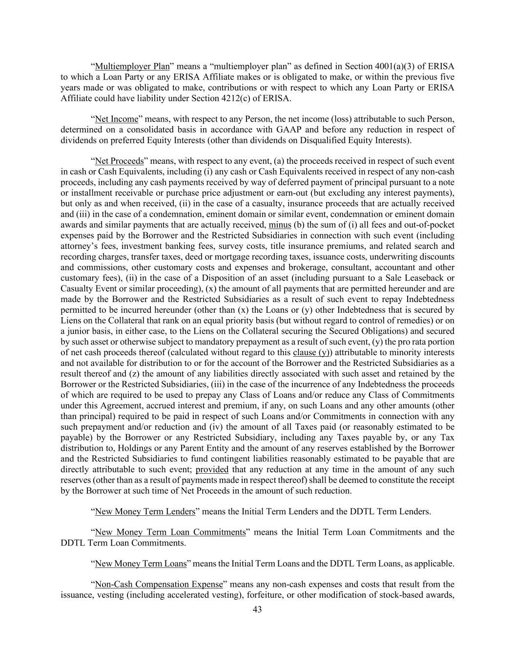 43 “Multiemployer Plan” means a “multiemployer plan” as defined in Section 4001(a)(3) of ERISA to which a Loan Party or any ERISA Affiliate makes or is obligated to make, or within the previous five years made or was obligated to make, contributions or with respect to which any Loan Party or ERISA Affiliate could have liability under Section 4212(c) of ERISA. “Net Income” means, with respect to any Person, the net income (loss) attributable to such Person, determined on a consolidated basis in accordance with GAAP and before any reduction in respect of dividends on preferred Equity Interests (other than dividends on Disqualified Equity Interests). “Net Proceeds” means, with respect to any event, (a) the proceeds received in respect of such event in cash or Cash Equivalents, including (i) any cash or Cash Equivalents received in respect of any non-cash proceeds, including any cash payments received by way of deferred payment of principal pursuant to a note or installment receivable or purchase price adjustment or earn-out (but excluding any interest payments), but only as and when received, (ii) in the case of a casualty, insurance proceeds that are actually received and (iii) in the case of a condemnation, eminent domain or similar event, condemnation or eminent domain awards and similar payments that are actually received, minus (b) the sum of (i) all fees and out-of-pocket expenses paid by the Borrower and the Restricted Subsidiaries in connection with such event (including attorney’s fees, investment banking fees, survey costs, title insurance premiums, and related search and recording charges, transfer taxes, deed or mortgage recording taxes, issuance costs, underwriting discounts and commissions, other customary costs and expenses and brokerage, consultant, accountant and other customary fees), (ii) in the case of a Disposition of an asset (including pursuant to a Sale Leaseback or Casualty Event or similar proceeding), (x) the amount of all payments that are permitted hereunder and are made by the Borrower and the Restricted Subsidiaries as a result of such event to repay Indebtedness permitted to be incurred hereunder (other than (x) the Loans or (y) other Indebtedness that is secured by Liens on the Collateral that rank on an equal priority basis (but without regard to control of remedies) or on a junior basis, in either case, to the Liens on the Collateral securing the Secured Obligations) and secured by such asset or otherwise subject to mandatory prepayment as a result of such event, (y) the pro rata portion of net cash proceeds thereof (calculated without regard to this clause (y)) attributable to minority interests and not available for distribution to or for the account of the Borrower and the Restricted Subsidiaries as a result thereof and (z) the amount of any liabilities directly associated with such asset and retained by the Borrower or the Restricted Subsidiaries, (iii) in the case of the incurrence of any Indebtedness the proceeds of which are required to be used to prepay any Class of Loans and/or reduce any Class of Commitments under this Agreement, accrued interest and premium, if any, on such Loans and any other amounts (other than principal) required to be paid in respect of such Loans and/or Commitments in connection with any such prepayment and/or reduction and (iv) the amount of all Taxes paid (or reasonably estimated to be payable) by the Borrower or any Restricted Subsidiary, including any Taxes payable by, or any Tax distribution to, Holdings or any Parent Entity and the amount of any reserves established by the Borrower and the Restricted Subsidiaries to fund contingent liabilities reasonably estimated to be payable that are directly attributable to such event; provided that any reduction at any time in the amount of any such reserves (other than as a result of payments made in respect thereof) shall be deemed to constitute the receipt by the Borrower at such time of Net Proceeds in the amount of such reduction. “New Money Term Lenders” means the Initial Term Lenders and the DDTL Term Lenders. “New Money Term Loan Commitments” means the Initial Term Loan Commitments and the DDTL Term Loan Commitments. “New Money Term Loans” means the Initial Term Loans and the DDTL Term Loans, as applicable. “Non-Cash Compensation Expense” means any non-cash expenses and costs that result from the issuance, vesting (including accelerated vesting), forfeiture, or other modification of stock-based awards,