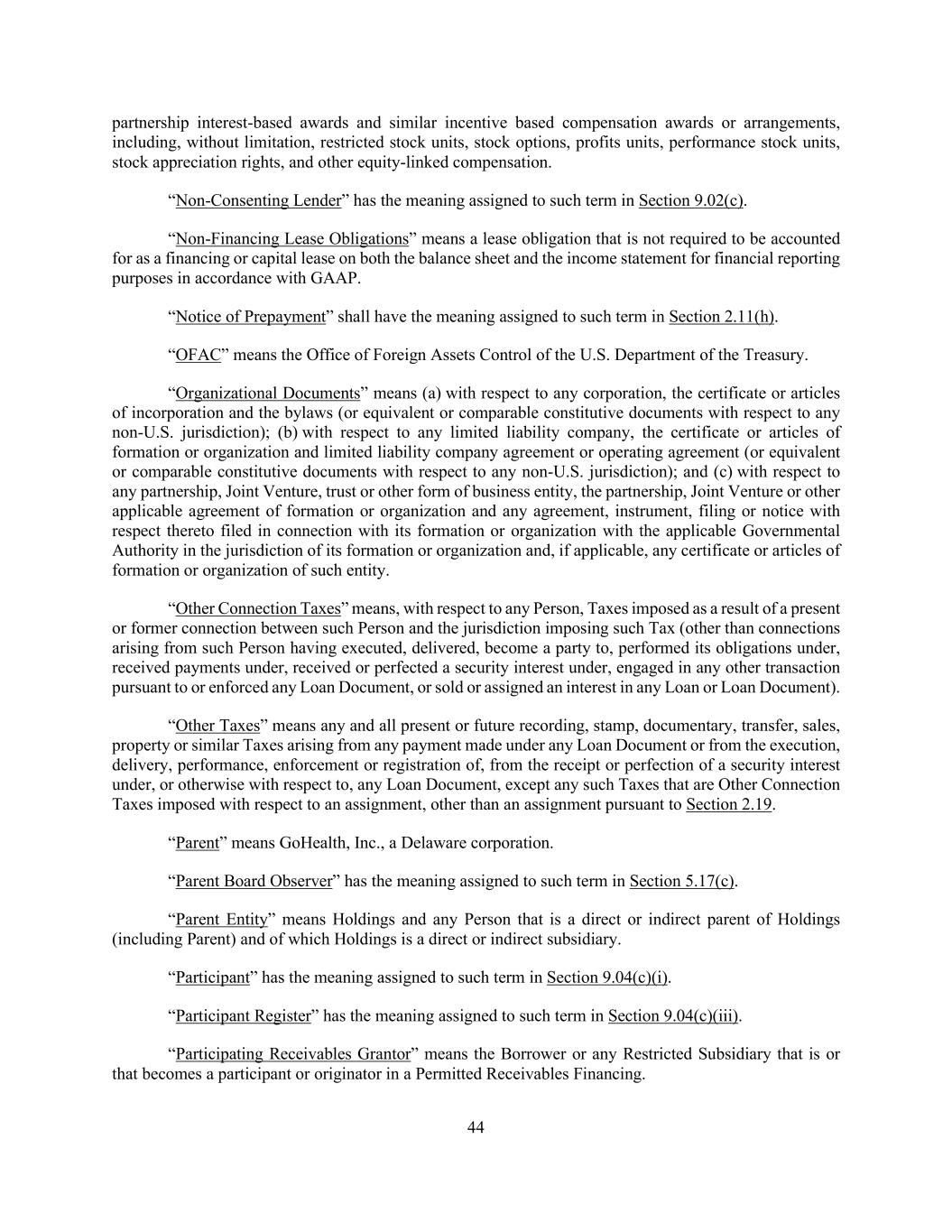 44 partnership interest-based awards and similar incentive based compensation awards or arrangements, including, without limitation, restricted stock units, stock options, profits units, performance stock units, stock appreciation rights, and other equity-linked compensation. “Non-Consenting Lender” has the meaning assigned to such term in Section 9.02(c). “Non-Financing Lease Obligations” means a lease obligation that is not required to be accounted for as a financing or capital lease on both the balance sheet and the income statement for financial reporting purposes in accordance with GAAP. “Notice of Prepayment” shall have the meaning assigned to such term in Section 2.11(h). “OFAC” means the Office of Foreign Assets Control of the U.S. Department of the Treasury. “Organizational Documents” means (a) with respect to any corporation, the certificate or articles of incorporation and the bylaws (or equivalent or comparable constitutive documents with respect to any non-U.S. jurisdiction); (b) with respect to any limited liability company, the certificate or articles of formation or organization and limited liability company agreement or operating agreement (or equivalent or comparable constitutive documents with respect to any non-U.S. jurisdiction); and (c) with respect to any partnership, Joint Venture, trust or other form of business entity, the partnership, Joint Venture or other applicable agreement of formation or organization and any agreement, instrument, filing or notice with respect thereto filed in connection with its formation or organization with the applicable Governmental Authority in the jurisdiction of its formation or organization and, if applicable, any certificate or articles of formation or organization of such entity. “Other Connection Taxes” means, with respect to any Person, Taxes imposed as a result of a present or former connection between such Person and the jurisdiction imposing such Tax (other than connections arising from such Person having executed, delivered, become a party to, performed its obligations under, received payments under, received or perfected a security interest under, engaged in any other transaction pursuant to or enforced any Loan Document, or sold or assigned an interest in any Loan or Loan Document). “Other Taxes” means any and all present or future recording, stamp, documentary, transfer, sales, property or similar Taxes arising from any payment made under any Loan Document or from the execution, delivery, performance, enforcement or registration of, from the receipt or perfection of a security interest under, or otherwise with respect to, any Loan Document, except any such Taxes that are Other Connection Taxes imposed with respect to an assignment, other than an assignment pursuant to Section 2.19. “Parent” means GoHealth, Inc., a Delaware corporation. “Parent Board Observer” has the meaning assigned to such term in Section 5.17(c). “Parent Entity” means Holdings and any Person that is a direct or indirect parent of Holdings (including Parent) and of which Holdings is a direct or indirect subsidiary. “Participant” has the meaning assigned to such term in Section 9.04(c)(i). “Participant Register” has the meaning assigned to such term in Section 9.04(c)(iii). “Participating Receivables Grantor” means the Borrower or any Restricted Subsidiary that is or that becomes a participant or originator in a Permitted Receivables Financing.