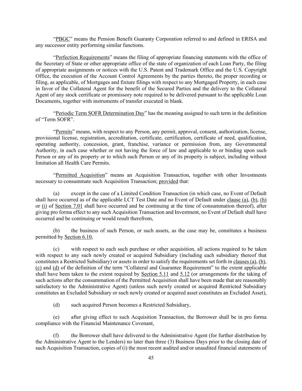 45 “PBGC” means the Pension Benefit Guaranty Corporation referred to and defined in ERISA and any successor entity performing similar functions. “Perfection Requirements” means the filing of appropriate financing statements with the office of the Secretary of State or other appropriate office of the state of organization of each Loan Party, the filing of appropriate assignments or notices with the U.S. Patent and Trademark Office and the U.S. Copyright Office, the execution of the Account Control Agreements by the parties thereto, the proper recording or filing, as applicable, of Mortgages and fixture filings with respect to any Mortgaged Property, in each case in favor of the Collateral Agent for the benefit of the Secured Parties and the delivery to the Collateral Agent of any stock certificate or promissory note required to be delivered pursuant to the applicable Loan Documents, together with instruments of transfer executed in blank. “Periodic Term SOFR Determination Day” has the meaning assigned to such term in the definition of “Term SOFR”. “Permits” means, with respect to any Person, any permit, approval, consent, authorization, license, provisional license, registration, accreditation, certificate, certification, certificate of need, qualification, operating authority, concession, grant, franchise, variance or permission from, any Governmental Authority, in each case whether or not having the force of law and applicable to or binding upon such Person or any of its property or to which such Person or any of its property is subject, including without limitation all Health Care Permits. “Permitted Acquisition” means an Acquisition Transaction, together with other Investments necessary to consummate such Acquisition Transaction; provided that: (a) except in the case of a Limited Condition Transaction (in which case, no Event of Default shall have occurred as of the applicable LCT Test Date and no Event of Default under clause (a), (b), (h) or (i) of Section 7.01 shall have occurred and be continuing at the time of consummation thereof), after giving pro forma effect to any such Acquisition Transaction and Investment, no Event of Default shall have occurred and be continuing or would result therefrom, (b) the business of such Person, or such assets, as the case may be, constitutes a business permitted by Section 6.10, (c) with respect to each such purchase or other acquisition, all actions required to be taken with respect to any such newly created or acquired Subsidiary (including each subsidiary thereof that constitutes a Restricted Subsidiary) or assets in order to satisfy the requirements set forth in clauses (a), (b), (c) and (d) of the definition of the term “Collateral and Guarantee Requirement” to the extent applicable shall have been taken to the extent required by Section 5.11 and 5.12 (or arrangements for the taking of such actions after the consummation of the Permitted Acquisition shall have been made that are reasonably satisfactory to the Administrative Agent) (unless such newly created or acquired Restricted Subsidiary constitutes an Excluded Subsidiary or such newly created or acquired asset constitutes an Excluded Asset), (d) such acquired Person becomes a Restricted Subsidiary, (e) after giving effect to such Acquisition Transaction, the Borrower shall be in pro forma compliance with the Financial Maintenance Covenant, (f) the Borrower shall have delivered to the Administrative Agent (for further distribution by the Administrative Agent to the Lenders) no later than three (3) Business Days prior to the closing date of such Acquisition Transaction, copies of (i) the most recent audited and/or unaudited financial statements of