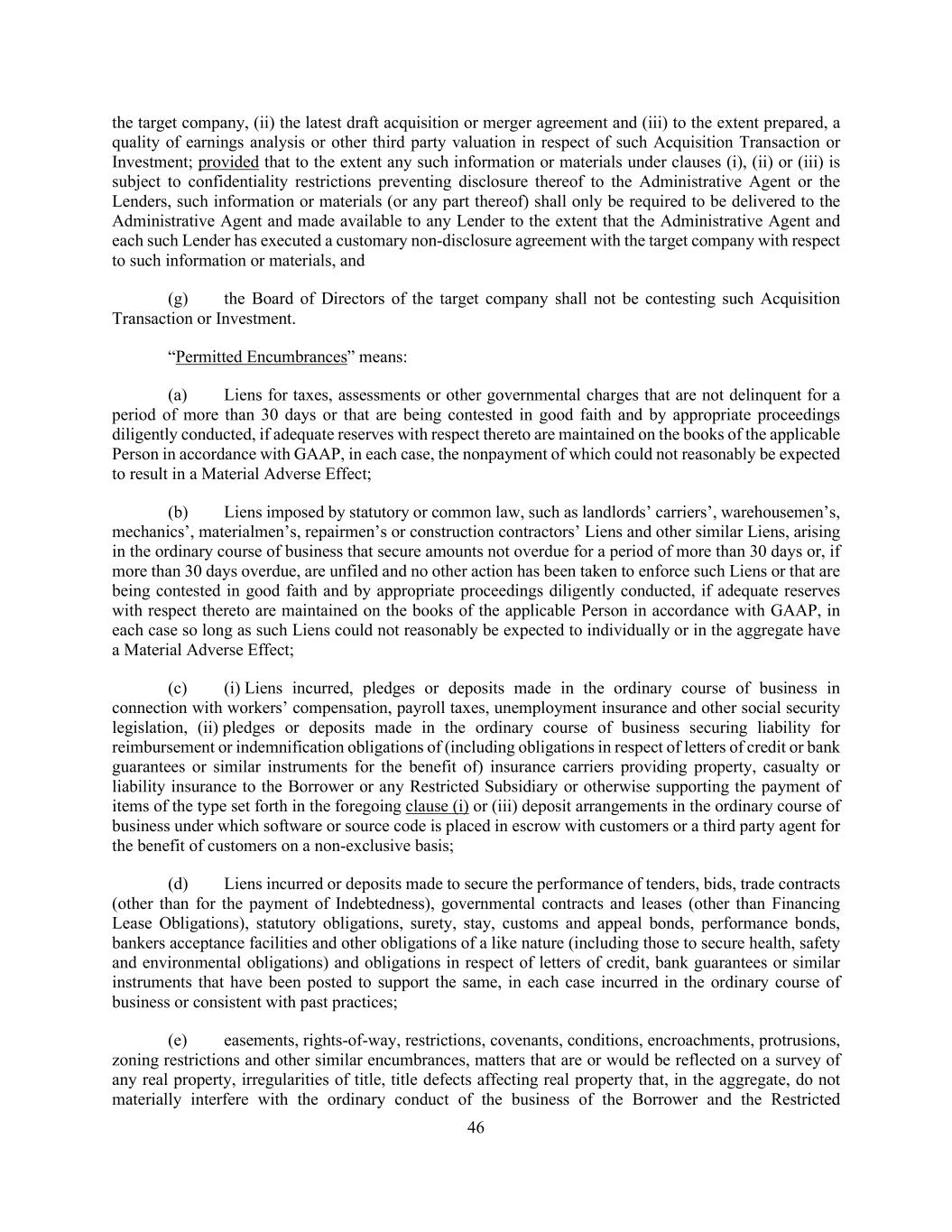 46 the target company, (ii) the latest draft acquisition or merger agreement and (iii) to the extent prepared, a quality of earnings analysis or other third party valuation in respect of such Acquisition Transaction or Investment; provided that to the extent any such information or materials under clauses (i), (ii) or (iii) is subject to confidentiality restrictions preventing disclosure thereof to the Administrative Agent or the Lenders, such information or materials (or any part thereof) shall only be required to be delivered to the Administrative Agent and made available to any Lender to the extent that the Administrative Agent and each such Lender has executed a customary non-disclosure agreement with the target company with respect to such information or materials, and (g) the Board of Directors of the target company shall not be contesting such Acquisition Transaction or Investment. “Permitted Encumbrances” means: (a) Liens for taxes, assessments or other governmental charges that are not delinquent for a period of more than 30 days or that are being contested in good faith and by appropriate proceedings diligently conducted, if adequate reserves with respect thereto are maintained on the books of the applicable Person in accordance with GAAP, in each case, the nonpayment of which could not reasonably be expected to result in a Material Adverse Effect; (b) Liens imposed by statutory or common law, such as landlords’ carriers’, warehousemen’s, mechanics’, materialmen’s, repairmen’s or construction contractors’ Liens and other similar Liens, arising in the ordinary course of business that secure amounts not overdue for a period of more than 30 days or, if more than 30 days overdue, are unfiled and no other action has been taken to enforce such Liens or that are being contested in good faith and by appropriate proceedings diligently conducted, if adequate reserves with respect thereto are maintained on the books of the applicable Person in accordance with GAAP, in each case so long as such Liens could not reasonably be expected to individually or in the aggregate have a Material Adverse Effect; (c) (i) Liens incurred, pledges or deposits made in the ordinary course of business in connection with workers’ compensation, payroll taxes, unemployment insurance and other social security legislation, (ii) pledges or deposits made in the ordinary course of business securing liability for reimbursement or indemnification obligations of (including obligations in respect of letters of credit or bank guarantees or similar instruments for the benefit of) insurance carriers providing property, casualty or liability insurance to the Borrower or any Restricted Subsidiary or otherwise supporting the payment of items of the type set forth in the foregoing clause (i) or (iii) deposit arrangements in the ordinary course of business under which software or source code is placed in escrow with customers or a third party agent for the benefit of customers on a non-exclusive basis; (d) Liens incurred or deposits made to secure the performance of tenders, bids, trade contracts (other than for the payment of Indebtedness), governmental contracts and leases (other than Financing Lease Obligations), statutory obligations, surety, stay, customs and appeal bonds, performance bonds, bankers acceptance facilities and other obligations of a like nature (including those to secure health, safety and environmental obligations) and obligations in respect of letters of credit, bank guarantees or similar instruments that have been posted to support the same, in each case incurred in the ordinary course of business or consistent with past practices; (e) easements, rights-of-way, restrictions, covenants, conditions, encroachments, protrusions, zoning restrictions and other similar encumbrances, matters that are or would be reflected on a survey of any real property, irregularities of title, title defects affecting real property that, in the aggregate, do not materially interfere with the ordinary conduct of the business of the Borrower and the Restricted