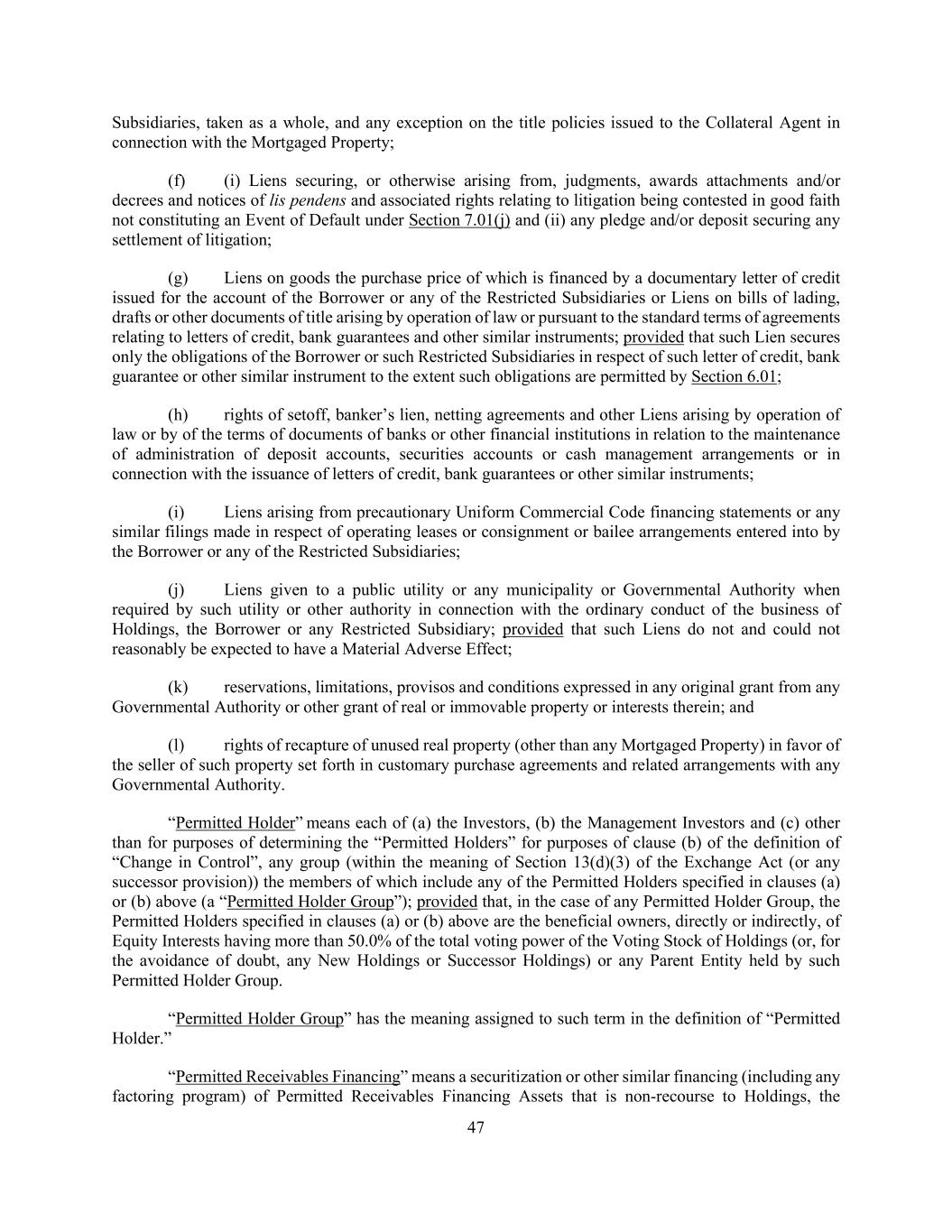 47 Subsidiaries, taken as a whole, and any exception on the title policies issued to the Collateral Agent in connection with the Mortgaged Property; (f) (i) Liens securing, or otherwise arising from, judgments, awards attachments and/or decrees and notices of lis pendens and associated rights relating to litigation being contested in good faith not constituting an Event of Default under Section 7.01(j) and (ii) any pledge and/or deposit securing any settlement of litigation; (g) Liens on goods the purchase price of which is financed by a documentary letter of credit issued for the account of the Borrower or any of the Restricted Subsidiaries or Liens on bills of lading, drafts or other documents of title arising by operation of law or pursuant to the standard terms of agreements relating to letters of credit, bank guarantees and other similar instruments; provided that such Lien secures only the obligations of the Borrower or such Restricted Subsidiaries in respect of such letter of credit, bank guarantee or other similar instrument to the extent such obligations are permitted by Section 6.01; (h) rights of setoff, banker’s lien, netting agreements and other Liens arising by operation of law or by of the terms of documents of banks or other financial institutions in relation to the maintenance of administration of deposit accounts, securities accounts or cash management arrangements or in connection with the issuance of letters of credit, bank guarantees or other similar instruments; (i) Liens arising from precautionary Uniform Commercial Code financing statements or any similar filings made in respect of operating leases or consignment or bailee arrangements entered into by the Borrower or any of the Restricted Subsidiaries; (j) Liens given to a public utility or any municipality or Governmental Authority when required by such utility or other authority in connection with the ordinary conduct of the business of Holdings, the Borrower or any Restricted Subsidiary; provided that such Liens do not and could not reasonably be expected to have a Material Adverse Effect; (k) reservations, limitations, provisos and conditions expressed in any original grant from any Governmental Authority or other grant of real or immovable property or interests therein; and (l) rights of recapture of unused real property (other than any Mortgaged Property) in favor of the seller of such property set forth in customary purchase agreements and related arrangements with any Governmental Authority. “Permitted Holder” means each of (a) the Investors, (b) the Management Investors and (c) other than for purposes of determining the “Permitted Holders” for purposes of clause (b) of the definition of “Change in Control”, any group (within the meaning of Section 13(d)(3) of the Exchange Act (or any successor provision)) the members of which include any of the Permitted Holders specified in clauses (a) or (b) above (a “Permitted Holder Group”); provided that, in the case of any Permitted Holder Group, the Permitted Holders specified in clauses (a) or (b) above are the beneficial owners, directly or indirectly, of Equity Interests having more than 50.0% of the total voting power of the Voting Stock of Holdings (or, for the avoidance of doubt, any New Holdings or Successor Holdings) or any Parent Entity held by such Permitted Holder Group. “Permitted Holder Group” has the meaning assigned to such term in the definition of “Permitted Holder.” “Permitted Receivables Financing” means a securitization or other similar financing (including any factoring program) of Permitted Receivables Financing Assets that is non-recourse to Holdings, the