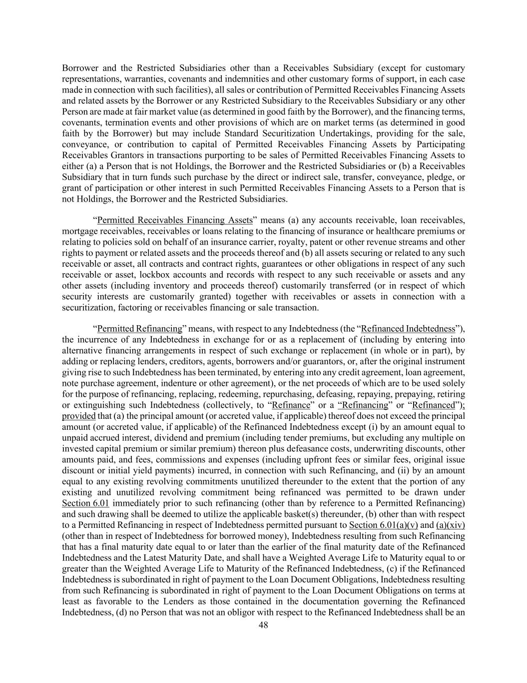 48 Borrower and the Restricted Subsidiaries other than a Receivables Subsidiary (except for customary representations, warranties, covenants and indemnities and other customary forms of support, in each case made in connection with such facilities), all sales or contribution of Permitted Receivables Financing Assets and related assets by the Borrower or any Restricted Subsidiary to the Receivables Subsidiary or any other Person are made at fair market value (as determined in good faith by the Borrower), and the financing terms, covenants, termination events and other provisions of which are on market terms (as determined in good faith by the Borrower) but may include Standard Securitization Undertakings, providing for the sale, conveyance, or contribution to capital of Permitted Receivables Financing Assets by Participating Receivables Grantors in transactions purporting to be sales of Permitted Receivables Financing Assets to either (a) a Person that is not Holdings, the Borrower and the Restricted Subsidiaries or (b) a Receivables Subsidiary that in turn funds such purchase by the direct or indirect sale, transfer, conveyance, pledge, or grant of participation or other interest in such Permitted Receivables Financing Assets to a Person that is not Holdings, the Borrower and the Restricted Subsidiaries. “Permitted Receivables Financing Assets” means (a) any accounts receivable, loan receivables, mortgage receivables, receivables or loans relating to the financing of insurance or healthcare premiums or relating to policies sold on behalf of an insurance carrier, royalty, patent or other revenue streams and other rights to payment or related assets and the proceeds thereof and (b) all assets securing or related to any such receivable or asset, all contracts and contract rights, guarantees or other obligations in respect of any such receivable or asset, lockbox accounts and records with respect to any such receivable or assets and any other assets (including inventory and proceeds thereof) customarily transferred (or in respect of which security interests are customarily granted) together with receivables or assets in connection with a securitization, factoring or receivables financing or sale transaction. “Permitted Refinancing” means, with respect to any Indebtedness (the “Refinanced Indebtedness”), the incurrence of any Indebtedness in exchange for or as a replacement of (including by entering into alternative financing arrangements in respect of such exchange or replacement (in whole or in part), by adding or replacing lenders, creditors, agents, borrowers and/or guarantors, or, after the original instrument giving rise to such Indebtedness has been terminated, by entering into any credit agreement, loan agreement, note purchase agreement, indenture or other agreement), or the net proceeds of which are to be used solely for the purpose of refinancing, replacing, redeeming, repurchasing, defeasing, repaying, prepaying, retiring or extinguishing such Indebtedness (collectively, to “Refinance” or a “Refinancing” or “Refinanced”); provided that (a) the principal amount (or accreted value, if applicable) thereof does not exceed the principal amount (or accreted value, if applicable) of the Refinanced Indebtedness except (i) by an amount equal to unpaid accrued interest, dividend and premium (including tender premiums, but excluding any multiple on invested capital premium or similar premium) thereon plus defeasance costs, underwriting discounts, other amounts paid, and fees, commissions and expenses (including upfront fees or similar fees, original issue discount or initial yield payments) incurred, in connection with such Refinancing, and (ii) by an amount equal to any existing revolving commitments unutilized thereunder to the extent that the portion of any existing and unutilized revolving commitment being refinanced was permitted to be drawn under Section 6.01 immediately prior to such refinancing (other than by reference to a Permitted Refinancing) and such drawing shall be deemed to utilize the applicable basket(s) thereunder, (b) other than with respect to a Permitted Refinancing in respect of Indebtedness permitted pursuant to Section 6.01(a)(v) and (a)(xiv) (other than in respect of Indebtedness for borrowed money), Indebtedness resulting from such Refinancing that has a final maturity date equal to or later than the earlier of the final maturity date of the Refinanced Indebtedness and the Latest Maturity Date, and shall have a Weighted Average Life to Maturity equal to or greater than the Weighted Average Life to Maturity of the Refinanced Indebtedness, (c) if the Refinanced Indebtedness is subordinated in right of payment to the Loan Document Obligations, Indebtedness resulting from such Refinancing is subordinated in right of payment to the Loan Document Obligations on terms at least as favorable to the Lenders as those contained in the documentation governing the Refinanced Indebtedness, (d) no Person that was not an obligor with respect to the Refinanced Indebtedness shall be an
