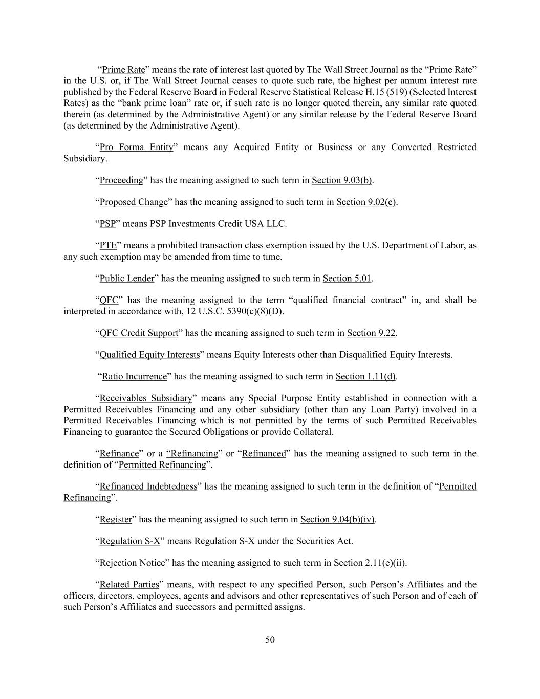 50 “Prime Rate” means the rate of interest last quoted by The Wall Street Journal as the “Prime Rate” in the U.S. or, if The Wall Street Journal ceases to quote such rate, the highest per annum interest rate published by the Federal Reserve Board in Federal Reserve Statistical Release H.15 (519) (Selected Interest Rates) as the “bank prime loan” rate or, if such rate is no longer quoted therein, any similar rate quoted therein (as determined by the Administrative Agent) or any similar release by the Federal Reserve Board (as determined by the Administrative Agent). “Pro Forma Entity” means any Acquired Entity or Business or any Converted Restricted Subsidiary. “Proceeding” has the meaning assigned to such term in Section 9.03(b). “Proposed Change” has the meaning assigned to such term in Section 9.02(c). “PSP” means PSP Investments Credit USA LLC. “PTE” means a prohibited transaction class exemption issued by the U.S. Department of Labor, as any such exemption may be amended from time to time. “Public Lender” has the meaning assigned to such term in Section 5.01. “QFC” has the meaning assigned to the term “qualified financial contract” in, and shall be interpreted in accordance with, 12 U.S.C. 5390(c)(8)(D). “QFC Credit Support” has the meaning assigned to such term in Section 9.22. “Qualified Equity Interests” means Equity Interests other than Disqualified Equity Interests. “Ratio Incurrence” has the meaning assigned to such term in Section 1.11(d). “Receivables Subsidiary” means any Special Purpose Entity established in connection with a Permitted Receivables Financing and any other subsidiary (other than any Loan Party) involved in a Permitted Receivables Financing which is not permitted by the terms of such Permitted Receivables Financing to guarantee the Secured Obligations or provide Collateral. “Refinance” or a “Refinancing” or “Refinanced” has the meaning assigned to such term in the definition of “Permitted Refinancing”. “Refinanced Indebtedness” has the meaning assigned to such term in the definition of “Permitted Refinancing”. “Register” has the meaning assigned to such term in Section 9.04(b)(iv). “Regulation S-X” means Regulation S-X under the Securities Act. “Rejection Notice” has the meaning assigned to such term in Section 2.11(e)(ii). “Related Parties” means, with respect to any specified Person, such Person’s Affiliates and the officers, directors, employees, agents and advisors and other representatives of such Person and of each of such Person’s Affiliates and successors and permitted assigns.