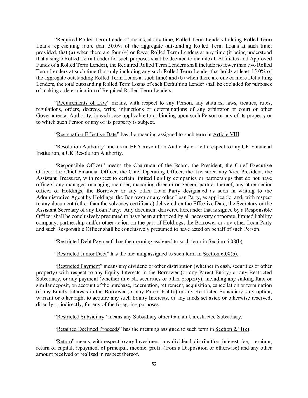 52 “Required Rolled Term Lenders” means, at any time, Rolled Term Lenders holding Rolled Term Loans representing more than 50.0% of the aggregate outstanding Rolled Term Loans at such time; provided, that (a) when there are four (4) or fewer Rolled Term Lenders at any time (it being understood that a single Rolled Term Lender for such purposes shall be deemed to include all Affiliates and Approved Funds of a Rolled Term Lender), the Required Rolled Term Lenders shall include no fewer than two Rolled Term Lenders at such time (but only including any such Rolled Term Lender that holds at least 15.0% of the aggregate outstanding Rolled Term Loans at such time) and (b) when there are one or more Defaulting Lenders, the total outstanding Rolled Term Loans of each Defaulting Lender shall be excluded for purposes of making a determination of Required Rolled Term Lenders. “Requirements of Law” means, with respect to any Person, any statutes, laws, treaties, rules, regulations, orders, decrees, writs, injunctions or determinations of any arbitrator or court or other Governmental Authority, in each case applicable to or binding upon such Person or any of its property or to which such Person or any of its property is subject. “Resignation Effective Date” has the meaning assigned to such term in Article VIII. “Resolution Authority” means an EEA Resolution Authority or, with respect to any UK Financial Institution, a UK Resolution Authority. “Responsible Officer” means the Chairman of the Board, the President, the Chief Executive Officer, the Chief Financial Officer, the Chief Operating Officer, the Treasurer, any Vice President, the Assistant Treasurer, with respect to certain limited liability companies or partnerships that do not have officers, any manager, managing member, managing director or general partner thereof, any other senior officer of Holdings, the Borrower or any other Loan Party designated as such in writing to the Administrative Agent by Holdings, the Borrower or any other Loan Party, as applicable, and, with respect to any document (other than the solvency certificate) delivered on the Effective Date, the Secretary or the Assistant Secretary of any Loan Party. Any document delivered hereunder that is signed by a Responsible Officer shall be conclusively presumed to have been authorized by all necessary corporate, limited liability company, partnership and/or other action on the part of Holdings, the Borrower or any other Loan Party and such Responsible Officer shall be conclusively presumed to have acted on behalf of such Person. “Restricted Debt Payment” has the meaning assigned to such term in Section 6.08(b). “Restricted Junior Debt” has the meaning assigned to such term in Section 6.08(b). “Restricted Payment” means any dividend or other distribution (whether in cash, securities or other property) with respect to any Equity Interests in the Borrower (or any Parent Entity) or any Restricted Subsidiary, or any payment (whether in cash, securities or other property), including any sinking fund or similar deposit, on account of the purchase, redemption, retirement, acquisition, cancellation or termination of any Equity Interests in the Borrower (or any Parent Entity) or any Restricted Subsidiary, any option, warrant or other right to acquire any such Equity Interests, or any funds set aside or otherwise reserved, directly or indirectly, for any of the foregoing purposes. “Restricted Subsidiary” means any Subsidiary other than an Unrestricted Subsidiary. “Retained Declined Proceeds” has the meaning assigned to such term in Section 2.11(e). “Return” means, with respect to any Investment, any dividend, distribution, interest, fee, premium, return of capital, repayment of principal, income, profit (from a Disposition or otherwise) and any other amount received or realized in respect thereof.