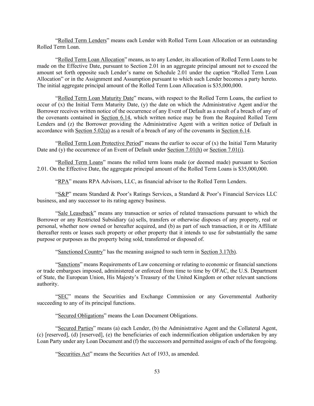 53 “Rolled Term Lenders” means each Lender with Rolled Term Loan Allocation or an outstanding Rolled Term Loan. “Rolled Term Loan Allocation” means, as to any Lender, its allocation of Rolled Term Loans to be made on the Effective Date, pursuant to Section 2.01 in an aggregate principal amount not to exceed the amount set forth opposite such Lender’s name on Schedule 2.01 under the caption “Rolled Term Loan Allocation” or in the Assignment and Assumption pursuant to which such Lender becomes a party hereto. The initial aggregate principal amount of the Rolled Term Loan Allocation is $35,000,000. “Rolled Term Loan Maturity Date” means, with respect to the Rolled Term Loans, the earliest to occur of (x) the Initial Term Maturity Date, (y) the date on which the Administrative Agent and/or the Borrower receives written notice of the occurrence of any Event of Default as a result of a breach of any of the covenants contained in Section 6.14, which written notice may be from the Required Rolled Term Lenders and (z) the Borrower providing the Administrative Agent with a written notice of Default in accordance with Section 5.02(a) as a result of a breach of any of the covenants in Section 6.14. “Rolled Term Loan Protective Period” means the earlier to occur of (x) the Initial Term Maturity Date and (y) the occurrence of an Event of Default under Section 7.01(h) or Section 7.01(i). “Rolled Term Loans” means the rolled term loans made (or deemed made) pursuant to Section 2.01. On the Effective Date, the aggregate principal amount of the Rolled Term Loans is $35,000,000. “RPA” means RPA Advisors, LLC, as financial advisor to the Rolled Term Lenders. “S&P” means Standard & Poor’s Ratings Services, a Standard & Poor’s Financial Services LLC business, and any successor to its rating agency business. “Sale Leaseback” means any transaction or series of related transactions pursuant to which the Borrower or any Restricted Subsidiary (a) sells, transfers or otherwise disposes of any property, real or personal, whether now owned or hereafter acquired, and (b) as part of such transaction, it or its Affiliate thereafter rents or leases such property or other property that it intends to use for substantially the same purpose or purposes as the property being sold, transferred or disposed of. “Sanctioned Country” has the meaning assigned to such term in Section 3.17(b). “Sanctions” means Requirements of Law concerning or relating to economic or financial sanctions or trade embargoes imposed, administered or enforced from time to time by OFAC, the U.S. Department of State, the European Union, His Majesty’s Treasury of the United Kingdom or other relevant sanctions authority. “SEC” means the Securities and Exchange Commission or any Governmental Authority succeeding to any of its principal functions. “Secured Obligations” means the Loan Document Obligations. “Secured Parties” means (a) each Lender, (b) the Administrative Agent and the Collateral Agent, (c) [reserved], (d) [reserved], (e) the beneficiaries of each indemnification obligation undertaken by any Loan Party under any Loan Document and (f) the successors and permitted assigns of each of the foregoing. “Securities Act” means the Securities Act of 1933, as amended.