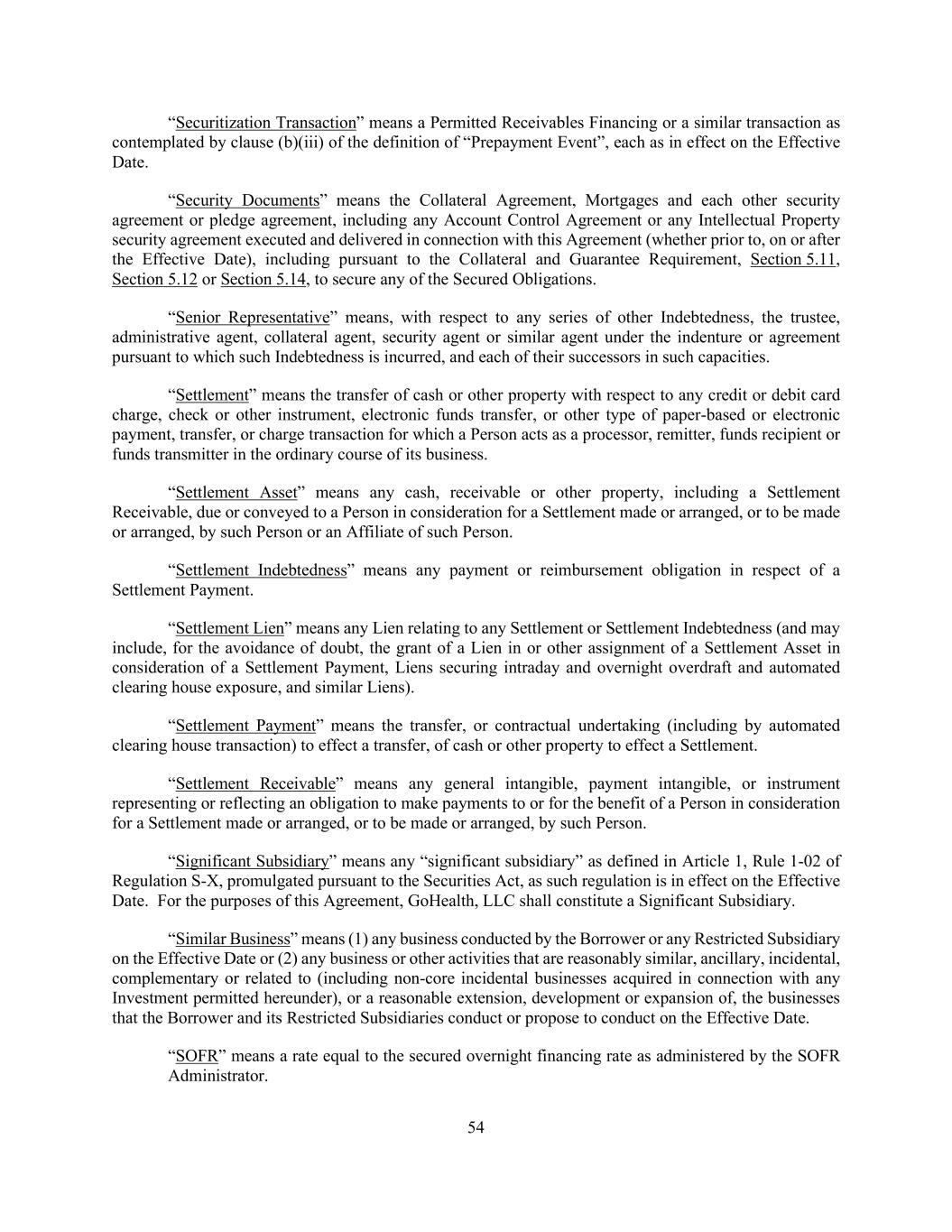 54 “Securitization Transaction” means a Permitted Receivables Financing or a similar transaction as contemplated by clause (b)(iii) of the definition of “Prepayment Event”, each as in effect on the Effective Date. “Security Documents” means the Collateral Agreement, Mortgages and each other security agreement or pledge agreement, including any Account Control Agreement or any Intellectual Property security agreement executed and delivered in connection with this Agreement (whether prior to, on or after the Effective Date), including pursuant to the Collateral and Guarantee Requirement, Section 5.11, Section 5.12 or Section 5.14, to secure any of the Secured Obligations. “Senior Representative” means, with respect to any series of other Indebtedness, the trustee, administrative agent, collateral agent, security agent or similar agent under the indenture or agreement pursuant to which such Indebtedness is incurred, and each of their successors in such capacities. “Settlement” means the transfer of cash or other property with respect to any credit or debit card charge, check or other instrument, electronic funds transfer, or other type of paper-based or electronic payment, transfer, or charge transaction for which a Person acts as a processor, remitter, funds recipient or funds transmitter in the ordinary course of its business. “Settlement Asset” means any cash, receivable or other property, including a Settlement Receivable, due or conveyed to a Person in consideration for a Settlement made or arranged, or to be made or arranged, by such Person or an Affiliate of such Person. “Settlement Indebtedness” means any payment or reimbursement obligation in respect of a Settlement Payment. “Settlement Lien” means any Lien relating to any Settlement or Settlement Indebtedness (and may include, for the avoidance of doubt, the grant of a Lien in or other assignment of a Settlement Asset in consideration of a Settlement Payment, Liens securing intraday and overnight overdraft and automated clearing house exposure, and similar Liens). “Settlement Payment” means the transfer, or contractual undertaking (including by automated clearing house transaction) to effect a transfer, of cash or other property to effect a Settlement. “Settlement Receivable” means any general intangible, payment intangible, or instrument representing or reflecting an obligation to make payments to or for the benefit of a Person in consideration for a Settlement made or arranged, or to be made or arranged, by such Person. “Significant Subsidiary” means any “significant subsidiary” as defined in Article 1, Rule 1-02 of Regulation S-X, promulgated pursuant to the Securities Act, as such regulation is in effect on the Effective Date. For the purposes of this Agreement, GoHealth, LLC shall constitute a Significant Subsidiary. “Similar Business” means (1) any business conducted by the Borrower or any Restricted Subsidiary on the Effective Date or (2) any business or other activities that are reasonably similar, ancillary, incidental, complementary or related to (including non-core incidental businesses acquired in connection with any Investment permitted hereunder), or a reasonable extension, development or expansion of, the businesses that the Borrower and its Restricted Subsidiaries conduct or propose to conduct on the Effective Date. “SOFR” means a rate equal to the secured overnight financing rate as administered by the SOFR Administrator.