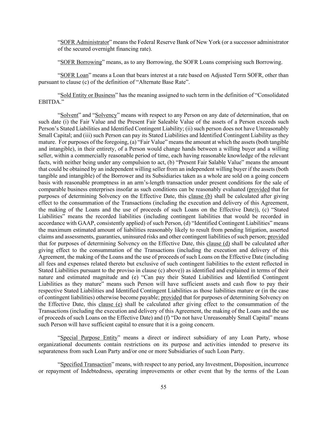 55 “SOFR Administrator” means the Federal Reserve Bank of New York (or a successor administrator of the secured overnight financing rate). “SOFR Borrowing” means, as to any Borrowing, the SOFR Loans comprising such Borrowing. “SOFR Loan” means a Loan that bears interest at a rate based on Adjusted Term SOFR, other than pursuant to clause (c) of the definition of “Alternate Base Rate”. “Sold Entity or Business” has the meaning assigned to such term in the definition of “Consolidated EBITDA.” “Solvent” and “Solvency” means with respect to any Person on any date of determination, that on such date (i) the Fair Value and the Present Fair Saleable Value of the assets of a Person exceeds such Person’s Stated Liabilities and Identified Contingent Liability; (ii) such person does not have Unreasonably Small Capital; and (iii) such Person can pay its Stated Liabilities and Identified Contingent Liability as they mature. For purposes of the foregoing, (a) “Fair Value” means the amount at which the assets (both tangible and intangible), in their entirety, of a Person would change hands between a willing buyer and a willing seller, within a commercially reasonable period of time, each having reasonable knowledge of the relevant facts, with neither being under any compulsion to act, (b) “Present Fair Salable Value” means the amount that could be obtained by an independent willing seller from an independent willing buyer if the assets (both tangible and intangible) of the Borrower and its Subsidiaries taken as a whole are sold on a going concern basis with reasonable promptness in an arm’s-length transaction under present conditions for the sale of comparable business enterprises insofar as such conditions can be reasonably evaluated (provided that for purposes of determining Solvency on the Effective Date, this clause (b) shall be calculated after giving effect to the consummation of the Transactions (including the execution and delivery of this Agreement, the making of the Loans and the use of proceeds of such Loans on the Effective Date)), (c) “Stated Liabilities” means the recorded liabilities (including contingent liabilities that would be recorded in accordance with GAAP, consistently applied) of such Person, (d) “Identified Contingent Liabilities” means the maximum estimated amount of liabilities reasonably likely to result from pending litigation, asserted claims and assessments, guaranties, uninsured risks and other contingent liabilities of such person; provided that for purposes of determining Solvency on the Effective Date, this clause (d) shall be calculated after giving effect to the consummation of the Transactions (including the execution and delivery of this Agreement, the making of the Loans and the use of proceeds of such Loans on the Effective Date (including all fees and expenses related thereto but exclusive of such contingent liabilities to the extent reflected in Stated Liabilities pursuant to the proviso in clause (c) above)) as identified and explained in terms of their nature and estimated magnitude and (e) “Can pay their Stated Liabilities and Identified Contingent Liabilities as they mature” means such Person will have sufficient assets and cash flow to pay their respective Stated Liabilities and Identified Contingent Liabilities as those liabilities mature or (in the case of contingent liabilities) otherwise become payable; provided that for purposes of determining Solvency on the Effective Date, this clause (e) shall be calculated after giving effect to the consummation of the Transactions (including the execution and delivery of this Agreement, the making of the Loans and the use of proceeds of such Loans on the Effective Date) and (f) “Do not have Unreasonably Small Capital” means such Person will have sufficient capital to ensure that it is a going concern. “Special Purpose Entity” means a direct or indirect subsidiary of any Loan Party, whose organizational documents contain restrictions on its purpose and activities intended to preserve its separateness from such Loan Party and/or one or more Subsidiaries of such Loan Party. “Specified Transaction” means, with respect to any period, any Investment, Disposition, incurrence or repayment of Indebtedness, operating improvements or other event that by the terms of the Loan