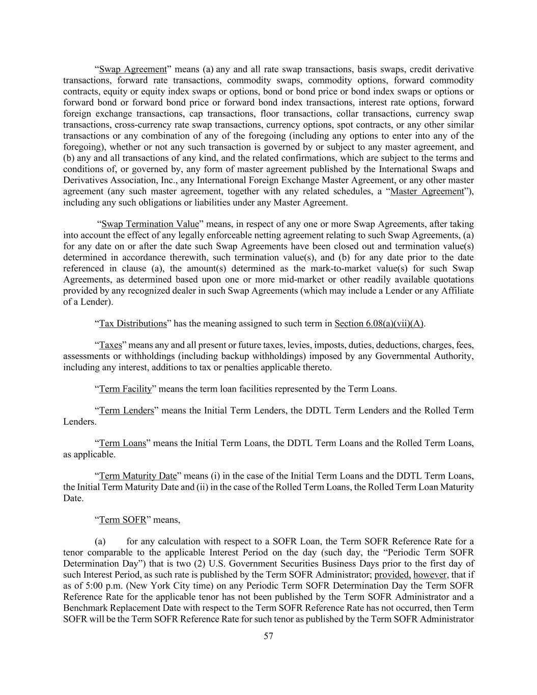 57 “Swap Agreement” means (a) any and all rate swap transactions, basis swaps, credit derivative transactions, forward rate transactions, commodity swaps, commodity options, forward commodity contracts, equity or equity index swaps or options, bond or bond price or bond index swaps or options or forward bond or forward bond price or forward bond index transactions, interest rate options, forward foreign exchange transactions, cap transactions, floor transactions, collar transactions, currency swap transactions, cross-currency rate swap transactions, currency options, spot contracts, or any other similar transactions or any combination of any of the foregoing (including any options to enter into any of the foregoing), whether or not any such transaction is governed by or subject to any master agreement, and (b) any and all transactions of any kind, and the related confirmations, which are subject to the terms and conditions of, or governed by, any form of master agreement published by the International Swaps and Derivatives Association, Inc., any International Foreign Exchange Master Agreement, or any other master agreement (any such master agreement, together with any related schedules, a “Master Agreement”), including any such obligations or liabilities under any Master Agreement. “Swap Termination Value” means, in respect of any one or more Swap Agreements, after taking into account the effect of any legally enforceable netting agreement relating to such Swap Agreements, (a) for any date on or after the date such Swap Agreements have been closed out and termination value(s) determined in accordance therewith, such termination value(s), and (b) for any date prior to the date referenced in clause (a), the amount(s) determined as the mark-to-market value(s) for such Swap Agreements, as determined based upon one or more mid-market or other readily available quotations provided by any recognized dealer in such Swap Agreements (which may include a Lender or any Affiliate of a Lender). “Tax Distributions” has the meaning assigned to such term in Section 6.08(a)(vii)(A). “Taxes” means any and all present or future taxes, levies, imposts, duties, deductions, charges, fees, assessments or withholdings (including backup withholdings) imposed by any Governmental Authority, including any interest, additions to tax or penalties applicable thereto. “Term Facility” means the term loan facilities represented by the Term Loans. “Term Lenders” means the Initial Term Lenders, the DDTL Term Lenders and the Rolled Term Lenders. “Term Loans” means the Initial Term Loans, the DDTL Term Loans and the Rolled Term Loans, as applicable. “Term Maturity Date” means (i) in the case of the Initial Term Loans and the DDTL Term Loans, the Initial Term Maturity Date and (ii) in the case of the Rolled Term Loans, the Rolled Term Loan Maturity Date. “Term SOFR” means, (a) for any calculation with respect to a SOFR Loan, the Term SOFR Reference Rate for a tenor comparable to the applicable Interest Period on the day (such day, the “Periodic Term SOFR Determination Day”) that is two (2) U.S. Government Securities Business Days prior to the first day of such Interest Period, as such rate is published by the Term SOFR Administrator; provided, however, that if as of 5:00 p.m. (New York City time) on any Periodic Term SOFR Determination Day the Term SOFR Reference Rate for the applicable tenor has not been published by the Term SOFR Administrator and a Benchmark Replacement Date with respect to the Term SOFR Reference Rate has not occurred, then Term SOFR will be the Term SOFR Reference Rate for such tenor as published by the Term SOFR Administrator