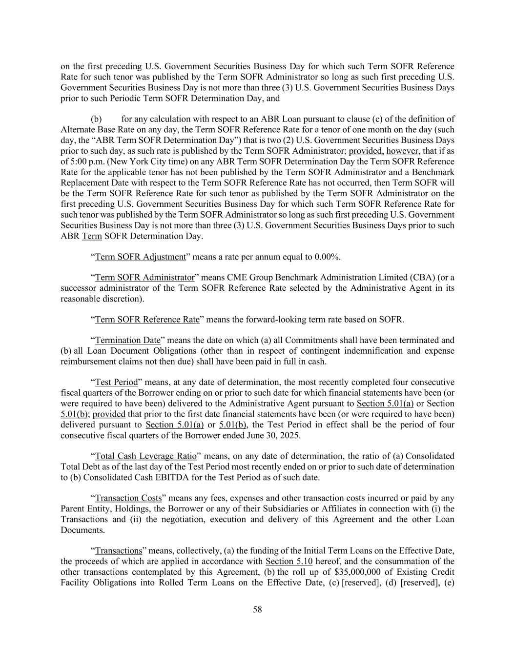 58 on the first preceding U.S. Government Securities Business Day for which such Term SOFR Reference Rate for such tenor was published by the Term SOFR Administrator so long as such first preceding U.S. Government Securities Business Day is not more than three (3) U.S. Government Securities Business Days prior to such Periodic Term SOFR Determination Day, and (b) for any calculation with respect to an ABR Loan pursuant to clause (c) of the definition of Alternate Base Rate on any day, the Term SOFR Reference Rate for a tenor of one month on the day (such day, the “ABR Term SOFR Determination Day”) that is two (2) U.S. Government Securities Business Days prior to such day, as such rate is published by the Term SOFR Administrator; provided, however, that if as of 5:00 p.m. (New York City time) on any ABR Term SOFR Determination Day the Term SOFR Reference Rate for the applicable tenor has not been published by the Term SOFR Administrator and a Benchmark Replacement Date with respect to the Term SOFR Reference Rate has not occurred, then Term SOFR will be the Term SOFR Reference Rate for such tenor as published by the Term SOFR Administrator on the first preceding U.S. Government Securities Business Day for which such Term SOFR Reference Rate for such tenor was published by the Term SOFR Administrator so long as such first preceding U.S. Government Securities Business Day is not more than three (3) U.S. Government Securities Business Days prior to such ABR Term SOFR Determination Day. “Term SOFR Adjustment” means a rate per annum equal to 0.00%. “Term SOFR Administrator” means CME Group Benchmark Administration Limited (CBA) (or a successor administrator of the Term SOFR Reference Rate selected by the Administrative Agent in its reasonable discretion). “Term SOFR Reference Rate” means the forward-looking term rate based on SOFR. “Termination Date” means the date on which (a) all Commitments shall have been terminated and (b) all Loan Document Obligations (other than in respect of contingent indemnification and expense reimbursement claims not then due) shall have been paid in full in cash. “Test Period” means, at any date of determination, the most recently completed four consecutive fiscal quarters of the Borrower ending on or prior to such date for which financial statements have been (or were required to have been) delivered to the Administrative Agent pursuant to Section 5.01(a) or Section 5.01(b); provided that prior to the first date financial statements have been (or were required to have been) delivered pursuant to Section 5.01(a) or 5.01(b), the Test Period in effect shall be the period of four consecutive fiscal quarters of the Borrower ended June 30, 2025. “Total Cash Leverage Ratio” means, on any date of determination, the ratio of (a) Consolidated Total Debt as of the last day of the Test Period most recently ended on or prior to such date of determination to (b) Consolidated Cash EBITDA for the Test Period as of such date. “Transaction Costs” means any fees, expenses and other transaction costs incurred or paid by any Parent Entity, Holdings, the Borrower or any of their Subsidiaries or Affiliates in connection with (i) the Transactions and (ii) the negotiation, execution and delivery of this Agreement and the other Loan Documents. “Transactions” means, collectively, (a) the funding of the Initial Term Loans on the Effective Date, the proceeds of which are applied in accordance with Section 5.10 hereof, and the consummation of the other transactions contemplated by this Agreement, (b) the roll up of $35,000,000 of Existing Credit Facility Obligations into Rolled Term Loans on the Effective Date, (c) [reserved], (d) [reserved], (e)