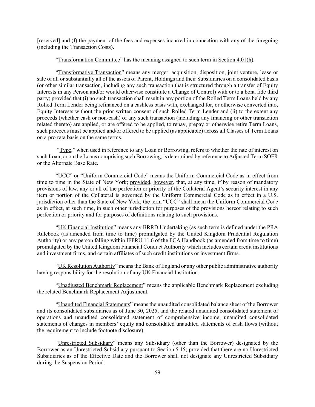 59 [reserved] and (f) the payment of the fees and expenses incurred in connection with any of the foregoing (including the Transaction Costs). “Transformation Committee” has the meaning assigned to such term in Section 4.01(h). “Transformative Transaction” means any merger, acquisition, disposition, joint venture, lease or sale of all or substantially all of the assets of Parent, Holdings and their Subsidiaries on a consolidated basis (or other similar transaction, including any such transaction that is structured through a transfer of Equity Interests in any Person and/or would otherwise constitute a Change of Control) with or to a bona fide third party; provided that (i) no such transaction shall result in any portion of the Rolled Term Loans held by any Rolled Term Lender being refinanced on a cashless basis with, exchanged for, or otherwise converted into, Equity Interests without the prior written consent of such Rolled Term Lender and (ii) to the extent any proceeds (whether cash or non-cash) of any such transaction (including any financing or other transaction related thereto) are applied, or are offered to be applied, to repay, prepay or otherwise retire Term Loans, such proceeds must be applied and/or offered to be applied (as applicable) across all Classes of Term Loans on a pro rata basis on the same terms. “Type,” when used in reference to any Loan or Borrowing, refers to whether the rate of interest on such Loan, or on the Loans comprising such Borrowing, is determined by reference to Adjusted Term SOFR or the Alternate Base Rate. “UCC” or “Uniform Commercial Code” means the Uniform Commercial Code as in effect from time to time in the State of New York; provided, however, that, at any time, if by reason of mandatory provisions of law, any or all of the perfection or priority of the Collateral Agent’s security interest in any item or portion of the Collateral is governed by the Uniform Commercial Code as in effect in a U.S. jurisdiction other than the State of New York, the term “UCC” shall mean the Uniform Commercial Code as in effect, at such time, in such other jurisdiction for purposes of the provisions hereof relating to such perfection or priority and for purposes of definitions relating to such provisions. “UK Financial Institution” means any BRRD Undertaking (as such term is defined under the PRA Rulebook (as amended from time to time) promulgated by the United Kingdom Prudential Regulation Authority) or any person falling within IFPRU 11.6 of the FCA Handbook (as amended from time to time) promulgated by the United Kingdom Financial Conduct Authority which includes certain credit institutions and investment firms, and certain affiliates of such credit institutions or investment firms. “UK Resolution Authority” means the Bank of England or any other public administrative authority having responsibility for the resolution of any UK Financial Institution. “Unadjusted Benchmark Replacement” means the applicable Benchmark Replacement excluding the related Benchmark Replacement Adjustment. “Unaudited Financial Statements” means the unaudited consolidated balance sheet of the Borrower and its consolidated subsidiaries as of June 30, 2025, and the related unaudited consolidated statement of operations and unaudited consolidated statement of comprehensive income, unaudited consolidated statements of changes in members’ equity and consolidated unaudited statements of cash flows (without the requirement to include footnote disclosure). “Unrestricted Subsidiary” means any Subsidiary (other than the Borrower) designated by the Borrower as an Unrestricted Subsidiary pursuant to Section 5.15; provided that there are no Unrestricted Subsidiaries as of the Effective Date and the Borrower shall not designate any Unrestricted Subsidiary during the Suspension Period.