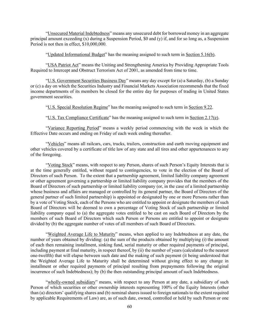 60 “Unsecured Material Indebtedness” means any unsecured debt for borrowed money in an aggregate principal amount exceeding (x) during a Suspension Period, $0 and (y) if, and for so long as, a Suspension Period is not then in effect, $10,000,000. “Updated Informational Budget” has the meaning assigned to such term in Section 5.16(b). “USA Patriot Act” means the Uniting and Strengthening America by Providing Appropriate Tools Required to Intercept and Obstruct Terrorism Act of 2001, as amended from time to time. “U.S. Government Securities Business Day” means any day except for (a) a Saturday, (b) a Sunday or (c) a day on which the Securities Industry and Financial Markets Association recommends that the fixed income departments of its members be closed for the entire day for purposes of trading in United States government securities. “U.S. Special Resolution Regime” has the meaning assigned to such term in Section 9.22. “U.S. Tax Compliance Certificate” has the meaning assigned to such term in Section 2.17(e). “Variance Reporting Period” means a weekly period commencing with the week in which the Effective Date occurs and ending on Friday of each week ending thereafter. “Vehicles” means all railcars, cars, trucks, trailers, construction and earth moving equipment and other vehicles covered by a certificate of title law of any state and all tires and other appurtenances to any of the foregoing. “Voting Stock” means, with respect to any Person, shares of such Person’s Equity Interests that is at the time generally entitled, without regard to contingencies, to vote in the election of the Board of Directors of such Person. To the extent that a partnership agreement, limited liability company agreement or other agreement governing a partnership or limited liability company provides that the members of the Board of Directors of such partnership or limited liability company (or, in the case of a limited partnership whose business and affairs are managed or controlled by its general partner, the Board of Directors of the general partner of such limited partnership) is appointed or designated by one or more Persons rather than by a vote of Voting Stock, each of the Persons who are entitled to appoint or designate the members of such Board of Directors will be deemed to own a percentage of Voting Stock of such partnership or limited liability company equal to (a) the aggregate votes entitled to be cast on such Board of Directors by the members of such Board of Directors which such Person or Persons are entitled to appoint or designate divided by (b) the aggregate number of votes of all members of such Board of Directors. “Weighted Average Life to Maturity” means, when applied to any Indebtedness at any date, the number of years obtained by dividing: (a) the sum of the products obtained by multiplying (i) the amount of each then remaining installment, sinking fund, serial maturity or other required payments of principal, including payment at final maturity, in respect thereof, by (ii) the number of years (calculated to the nearest one-twelfth) that will elapse between such date and the making of such payment (it being understood that the Weighted Average Life to Maturity shall be determined without giving effect to any change in installment or other required payments of principal resulting from prepayments following the original incurrence of such Indebtedness); by (b) the then outstanding principal amount of such Indebtedness. “wholly-owned subsidiary” means, with respect to any Person at any date, a subsidiary of such Person of which securities or other ownership interests representing 100% of the Equity Interests (other than (a) directors’ qualifying shares and (b) nominal shares issued to foreign nationals to the extent required by applicable Requirements of Law) are, as of such date, owned, controlled or held by such Person or one