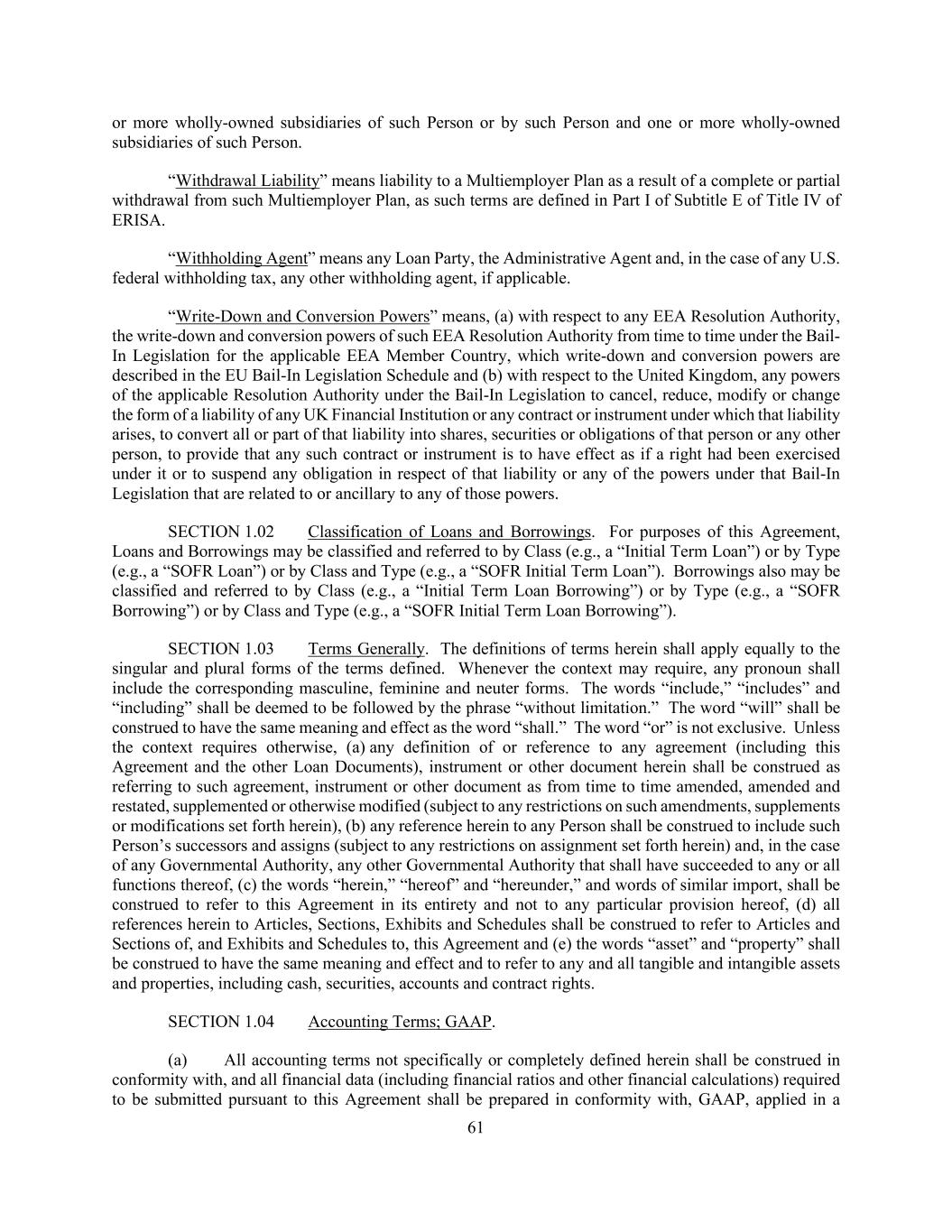 61 or more wholly-owned subsidiaries of such Person or by such Person and one or more wholly-owned subsidiaries of such Person. “Withdrawal Liability” means liability to a Multiemployer Plan as a result of a complete or partial withdrawal from such Multiemployer Plan, as such terms are defined in Part I of Subtitle E of Title IV of ERISA. “Withholding Agent” means any Loan Party, the Administrative Agent and, in the case of any U.S. federal withholding tax, any other withholding agent, if applicable. “Write-Down and Conversion Powers” means, (a) with respect to any EEA Resolution Authority, the write-down and conversion powers of such EEA Resolution Authority from time to time under the Bail- In Legislation for the applicable EEA Member Country, which write-down and conversion powers are described in the EU Bail-In Legislation Schedule and (b) with respect to the United Kingdom, any powers of the applicable Resolution Authority under the Bail-In Legislation to cancel, reduce, modify or change the form of a liability of any UK Financial Institution or any contract or instrument under which that liability arises, to convert all or part of that liability into shares, securities or obligations of that person or any other person, to provide that any such contract or instrument is to have effect as if a right had been exercised under it or to suspend any obligation in respect of that liability or any of the powers under that Bail-In Legislation that are related to or ancillary to any of those powers. SECTION 1.02 Classification of Loans and Borrowings. For purposes of this Agreement, Loans and Borrowings may be classified and referred to by Class (e.g., a “Initial Term Loan”) or by Type (e.g., a “SOFR Loan”) or by Class and Type (e.g., a “SOFR Initial Term Loan”). Borrowings also may be classified and referred to by Class (e.g., a “Initial Term Loan Borrowing”) or by Type (e.g., a “SOFR Borrowing”) or by Class and Type (e.g., a “SOFR Initial Term Loan Borrowing”). SECTION 1.03 Terms Generally. The definitions of terms herein shall apply equally to the singular and plural forms of the terms defined. Whenever the context may require, any pronoun shall include the corresponding masculine, feminine and neuter forms. The words “include,” “includes” and “including” shall be deemed to be followed by the phrase “without limitation.” The word “will” shall be construed to have the same meaning and effect as the word “shall.” The word “or” is not exclusive. Unless the context requires otherwise, (a) any definition of or reference to any agreement (including this Agreement and the other Loan Documents), instrument or other document herein shall be construed as referring to such agreement, instrument or other document as from time to time amended, amended and restated, supplemented or otherwise modified (subject to any restrictions on such amendments, supplements or modifications set forth herein), (b) any reference herein to any Person shall be construed to include such Person’s successors and assigns (subject to any restrictions on assignment set forth herein) and, in the case of any Governmental Authority, any other Governmental Authority that shall have succeeded to any or all functions thereof, (c) the words “herein,” “hereof” and “hereunder,” and words of similar import, shall be construed to refer to this Agreement in its entirety and not to any particular provision hereof, (d) all references herein to Articles, Sections, Exhibits and Schedules shall be construed to refer to Articles and Sections of, and Exhibits and Schedules to, this Agreement and (e) the words “asset” and “property” shall be construed to have the same meaning and effect and to refer to any and all tangible and intangible assets and properties, including cash, securities, accounts and contract rights. SECTION 1.04 Accounting Terms; GAAP. (a) All accounting terms not specifically or completely defined herein shall be construed in conformity with, and all financial data (including financial ratios and other financial calculations) required to be submitted pursuant to this Agreement shall be prepared in conformity with, GAAP, applied in a