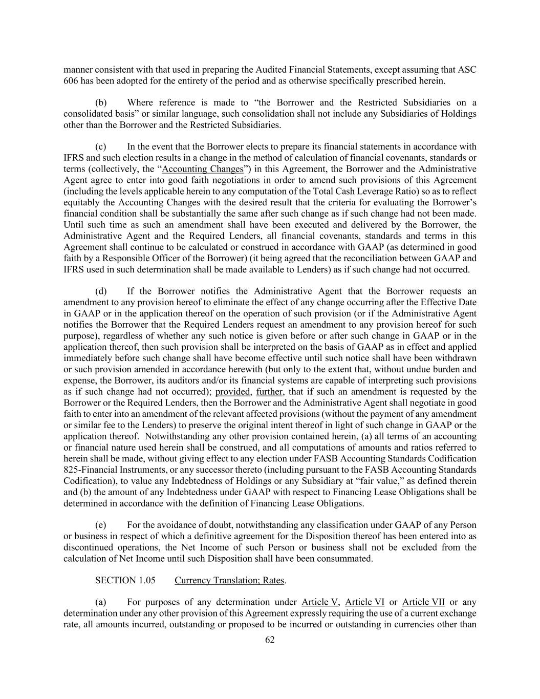 62 manner consistent with that used in preparing the Audited Financial Statements, except assuming that ASC 606 has been adopted for the entirety of the period and as otherwise specifically prescribed herein. (b) Where reference is made to “the Borrower and the Restricted Subsidiaries on a consolidated basis” or similar language, such consolidation shall not include any Subsidiaries of Holdings other than the Borrower and the Restricted Subsidiaries. (c) In the event that the Borrower elects to prepare its financial statements in accordance with IFRS and such election results in a change in the method of calculation of financial covenants, standards or terms (collectively, the “Accounting Changes”) in this Agreement, the Borrower and the Administrative Agent agree to enter into good faith negotiations in order to amend such provisions of this Agreement (including the levels applicable herein to any computation of the Total Cash Leverage Ratio) so as to reflect equitably the Accounting Changes with the desired result that the criteria for evaluating the Borrower’s financial condition shall be substantially the same after such change as if such change had not been made. Until such time as such an amendment shall have been executed and delivered by the Borrower, the Administrative Agent and the Required Lenders, all financial covenants, standards and terms in this Agreement shall continue to be calculated or construed in accordance with GAAP (as determined in good faith by a Responsible Officer of the Borrower) (it being agreed that the reconciliation between GAAP and IFRS used in such determination shall be made available to Lenders) as if such change had not occurred. (d) If the Borrower notifies the Administrative Agent that the Borrower requests an amendment to any provision hereof to eliminate the effect of any change occurring after the Effective Date in GAAP or in the application thereof on the operation of such provision (or if the Administrative Agent notifies the Borrower that the Required Lenders request an amendment to any provision hereof for such purpose), regardless of whether any such notice is given before or after such change in GAAP or in the application thereof, then such provision shall be interpreted on the basis of GAAP as in effect and applied immediately before such change shall have become effective until such notice shall have been withdrawn or such provision amended in accordance herewith (but only to the extent that, without undue burden and expense, the Borrower, its auditors and/or its financial systems are capable of interpreting such provisions as if such change had not occurred); provided, further, that if such an amendment is requested by the Borrower or the Required Lenders, then the Borrower and the Administrative Agent shall negotiate in good faith to enter into an amendment of the relevant affected provisions (without the payment of any amendment or similar fee to the Lenders) to preserve the original intent thereof in light of such change in GAAP or the application thereof. Notwithstanding any other provision contained herein, (a) all terms of an accounting or financial nature used herein shall be construed, and all computations of amounts and ratios referred to herein shall be made, without giving effect to any election under FASB Accounting Standards Codification 825-Financial Instruments, or any successor thereto (including pursuant to the FASB Accounting Standards Codification), to value any Indebtedness of Holdings or any Subsidiary at “fair value,” as defined therein and (b) the amount of any Indebtedness under GAAP with respect to Financing Lease Obligations shall be determined in accordance with the definition of Financing Lease Obligations. (e) For the avoidance of doubt, notwithstanding any classification under GAAP of any Person or business in respect of which a definitive agreement for the Disposition thereof has been entered into as discontinued operations, the Net Income of such Person or business shall not be excluded from the calculation of Net Income until such Disposition shall have been consummated. SECTION 1.05 Currency Translation; Rates. (a) For purposes of any determination under Article V, Article VI or Article VII or any determination under any other provision of this Agreement expressly requiring the use of a current exchange rate, all amounts incurred, outstanding or proposed to be incurred or outstanding in currencies other than