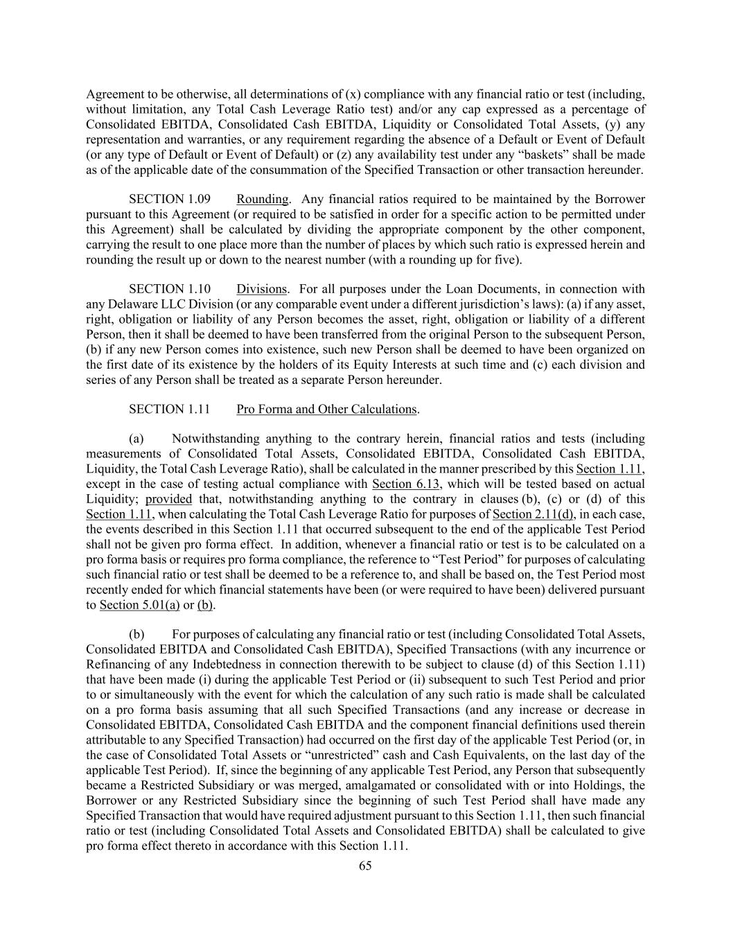 65 Agreement to be otherwise, all determinations of (x) compliance with any financial ratio or test (including, without limitation, any Total Cash Leverage Ratio test) and/or any cap expressed as a percentage of Consolidated EBITDA, Consolidated Cash EBITDA, Liquidity or Consolidated Total Assets, (y) any representation and warranties, or any requirement regarding the absence of a Default or Event of Default (or any type of Default or Event of Default) or (z) any availability test under any “baskets” shall be made as of the applicable date of the consummation of the Specified Transaction or other transaction hereunder. SECTION 1.09 Rounding. Any financial ratios required to be maintained by the Borrower pursuant to this Agreement (or required to be satisfied in order for a specific action to be permitted under this Agreement) shall be calculated by dividing the appropriate component by the other component, carrying the result to one place more than the number of places by which such ratio is expressed herein and rounding the result up or down to the nearest number (with a rounding up for five). SECTION 1.10 Divisions. For all purposes under the Loan Documents, in connection with any Delaware LLC Division (or any comparable event under a different jurisdiction’s laws): (a) if any asset, right, obligation or liability of any Person becomes the asset, right, obligation or liability of a different Person, then it shall be deemed to have been transferred from the original Person to the subsequent Person, (b) if any new Person comes into existence, such new Person shall be deemed to have been organized on the first date of its existence by the holders of its Equity Interests at such time and (c) each division and series of any Person shall be treated as a separate Person hereunder. SECTION 1.11 Pro Forma and Other Calculations. (a) Notwithstanding anything to the contrary herein, financial ratios and tests (including measurements of Consolidated Total Assets, Consolidated EBITDA, Consolidated Cash EBITDA, Liquidity, the Total Cash Leverage Ratio), shall be calculated in the manner prescribed by this Section 1.11, except in the case of testing actual compliance with Section 6.13, which will be tested based on actual Liquidity; provided that, notwithstanding anything to the contrary in clauses (b), (c) or (d) of this Section 1.11, when calculating the Total Cash Leverage Ratio for purposes of Section 2.11(d), in each case, the events described in this Section 1.11 that occurred subsequent to the end of the applicable Test Period shall not be given pro forma effect. In addition, whenever a financial ratio or test is to be calculated on a pro forma basis or requires pro forma compliance, the reference to “Test Period” for purposes of calculating such financial ratio or test shall be deemed to be a reference to, and shall be based on, the Test Period most recently ended for which financial statements have been (or were required to have been) delivered pursuant to Section 5.01(a) or (b). (b) For purposes of calculating any financial ratio or test (including Consolidated Total Assets, Consolidated EBITDA and Consolidated Cash EBITDA), Specified Transactions (with any incurrence or Refinancing of any Indebtedness in connection therewith to be subject to clause (d) of this Section 1.11) that have been made (i) during the applicable Test Period or (ii) subsequent to such Test Period and prior to or simultaneously with the event for which the calculation of any such ratio is made shall be calculated on a pro forma basis assuming that all such Specified Transactions (and any increase or decrease in Consolidated EBITDA, Consolidated Cash EBITDA and the component financial definitions used therein attributable to any Specified Transaction) had occurred on the first day of the applicable Test Period (or, in the case of Consolidated Total Assets or “unrestricted” cash and Cash Equivalents, on the last day of the applicable Test Period). If, since the beginning of any applicable Test Period, any Person that subsequently became a Restricted Subsidiary or was merged, amalgamated or consolidated with or into Holdings, the Borrower or any Restricted Subsidiary since the beginning of such Test Period shall have made any Specified Transaction that would have required adjustment pursuant to this Section 1.11, then such financial ratio or test (including Consolidated Total Assets and Consolidated EBITDA) shall be calculated to give pro forma effect thereto in accordance with this Section 1.11.