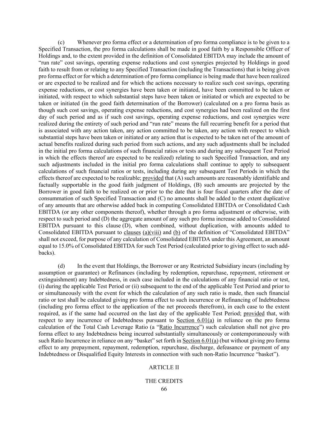 66 (c) Whenever pro forma effect or a determination of pro forma compliance is to be given to a Specified Transaction, the pro forma calculations shall be made in good faith by a Responsible Officer of Holdings and, to the extent provided in the definition of Consolidated EBITDA may include the amount of “run rate” cost savings, operating expense reductions and cost synergies projected by Holdings in good faith to result from or relating to any Specified Transaction (including the Transactions) that is being given pro forma effect or for which a determination of pro forma compliance is being made that have been realized or are expected to be realized and for which the actions necessary to realize such cost savings, operating expense reductions, or cost synergies have been taken or initiated, have been committed to be taken or initiated, with respect to which substantial steps have been taken or initiated or which are expected to be taken or initiated (in the good faith determination of the Borrower) (calculated on a pro forma basis as though such cost savings, operating expense reductions, and cost synergies had been realized on the first day of such period and as if such cost savings, operating expense reductions, and cost synergies were realized during the entirety of such period and “run rate” means the full recurring benefit for a period that is associated with any action taken, any action committed to be taken, any action with respect to which substantial steps have been taken or initiated or any action that is expected to be taken net of the amount of actual benefits realized during such period from such actions, and any such adjustments shall be included in the initial pro forma calculations of such financial ratios or tests and during any subsequent Test Period in which the effects thereof are expected to be realized) relating to such Specified Transaction, and any such adjustments included in the initial pro forma calculations shall continue to apply to subsequent calculations of such financial ratios or tests, including during any subsequent Test Periods in which the effects thereof are expected to be realizable; provided that (A) such amounts are reasonably identifiable and factually supportable in the good faith judgment of Holdings, (B) such amounts are projected by the Borrower in good faith to be realized on or prior to the date that is four fiscal quarters after the date of consummation of such Specified Transaction and (C) no amounts shall be added to the extent duplicative of any amounts that are otherwise added back in computing Consolidated EBITDA or Consolidated Cash EBITDA (or any other components thereof), whether through a pro forma adjustment or otherwise, with respect to such period and (D) the aggregate amount of any such pro forma increase added to Consolidated EBITDA pursuant to this clause (D), when combined, without duplication, with amounts added to Consolidated EBITDA pursuant to clauses (a)(viii) and (b) of the definition of “Consolidated EBITDA” shall not exceed, for purpose of any calculation of Consolidated EBITDA under this Agreement, an amount equal to 15.0% of Consolidated EBITDA for such Test Period (calculated prior to giving effect to such add- backs). (d) In the event that Holdings, the Borrower or any Restricted Subsidiary incurs (including by assumption or guarantee) or Refinances (including by redemption, repurchase, repayment, retirement or extinguishment) any Indebtedness, in each case included in the calculations of any financial ratio or test, (i) during the applicable Test Period or (ii) subsequent to the end of the applicable Test Period and prior to or simultaneously with the event for which the calculation of any such ratio is made, then such financial ratio or test shall be calculated giving pro forma effect to such incurrence or Refinancing of Indebtedness (including pro forma effect to the application of the net proceeds therefrom), in each case to the extent required, as if the same had occurred on the last day of the applicable Test Period; provided that, with respect to any incurrence of Indebtedness pursuant to Section 6.01(a) in reliance on the pro forma calculation of the Total Cash Leverage Ratio (a “Ratio Incurrence”) such calculation shall not give pro forma effect to any Indebtedness being incurred substantially simultaneously or contemporaneously with such Ratio Incurrence in reliance on any “basket” set forth in Section 6.01(a) (but without giving pro forma effect to any prepayment, repayment, redemption, repurchase, discharge, defeasance or payment of any Indebtedness or Disqualified Equity Interests in connection with such non-Ratio Incurrence “basket”). ARTICLE II THE CREDITS