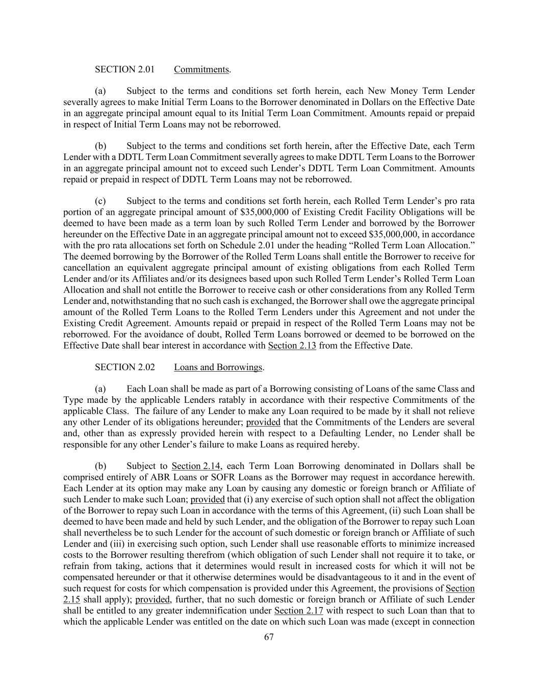 67 SECTION 2.01 Commitments. (a) Subject to the terms and conditions set forth herein, each New Money Term Lender severally agrees to make Initial Term Loans to the Borrower denominated in Dollars on the Effective Date in an aggregate principal amount equal to its Initial Term Loan Commitment. Amounts repaid or prepaid in respect of Initial Term Loans may not be reborrowed. (b) Subject to the terms and conditions set forth herein, after the Effective Date, each Term Lender with a DDTL Term Loan Commitment severally agrees to make DDTL Term Loans to the Borrower in an aggregate principal amount not to exceed such Lender’s DDTL Term Loan Commitment. Amounts repaid or prepaid in respect of DDTL Term Loans may not be reborrowed. (c) Subject to the terms and conditions set forth herein, each Rolled Term Lender’s pro rata portion of an aggregate principal amount of $35,000,000 of Existing Credit Facility Obligations will be deemed to have been made as a term loan by such Rolled Term Lender and borrowed by the Borrower hereunder on the Effective Date in an aggregate principal amount not to exceed $35,000,000, in accordance with the pro rata allocations set forth on Schedule 2.01 under the heading “Rolled Term Loan Allocation.” The deemed borrowing by the Borrower of the Rolled Term Loans shall entitle the Borrower to receive for cancellation an equivalent aggregate principal amount of existing obligations from each Rolled Term Lender and/or its Affiliates and/or its designees based upon such Rolled Term Lender’s Rolled Term Loan Allocation and shall not entitle the Borrower to receive cash or other considerations from any Rolled Term Lender and, notwithstanding that no such cash is exchanged, the Borrower shall owe the aggregate principal amount of the Rolled Term Loans to the Rolled Term Lenders under this Agreement and not under the Existing Credit Agreement. Amounts repaid or prepaid in respect of the Rolled Term Loans may not be reborrowed. For the avoidance of doubt, Rolled Term Loans borrowed or deemed to be borrowed on the Effective Date shall bear interest in accordance with Section 2.13 from the Effective Date. SECTION 2.02 Loans and Borrowings. (a) Each Loan shall be made as part of a Borrowing consisting of Loans of the same Class and Type made by the applicable Lenders ratably in accordance with their respective Commitments of the applicable Class. The failure of any Lender to make any Loan required to be made by it shall not relieve any other Lender of its obligations hereunder; provided that the Commitments of the Lenders are several and, other than as expressly provided herein with respect to a Defaulting Lender, no Lender shall be responsible for any other Lender’s failure to make Loans as required hereby. (b) Subject to Section 2.14, each Term Loan Borrowing denominated in Dollars shall be comprised entirely of ABR Loans or SOFR Loans as the Borrower may request in accordance herewith. Each Lender at its option may make any Loan by causing any domestic or foreign branch or Affiliate of such Lender to make such Loan; provided that (i) any exercise of such option shall not affect the obligation of the Borrower to repay such Loan in accordance with the terms of this Agreement, (ii) such Loan shall be deemed to have been made and held by such Lender, and the obligation of the Borrower to repay such Loan shall nevertheless be to such Lender for the account of such domestic or foreign branch or Affiliate of such Lender and (iii) in exercising such option, such Lender shall use reasonable efforts to minimize increased costs to the Borrower resulting therefrom (which obligation of such Lender shall not require it to take, or refrain from taking, actions that it determines would result in increased costs for which it will not be compensated hereunder or that it otherwise determines would be disadvantageous to it and in the event of such request for costs for which compensation is provided under this Agreement, the provisions of Section 2.15 shall apply); provided, further, that no such domestic or foreign branch or Affiliate of such Lender shall be entitled to any greater indemnification under Section 2.17 with respect to such Loan than that to which the applicable Lender was entitled on the date on which such Loan was made (except in connection