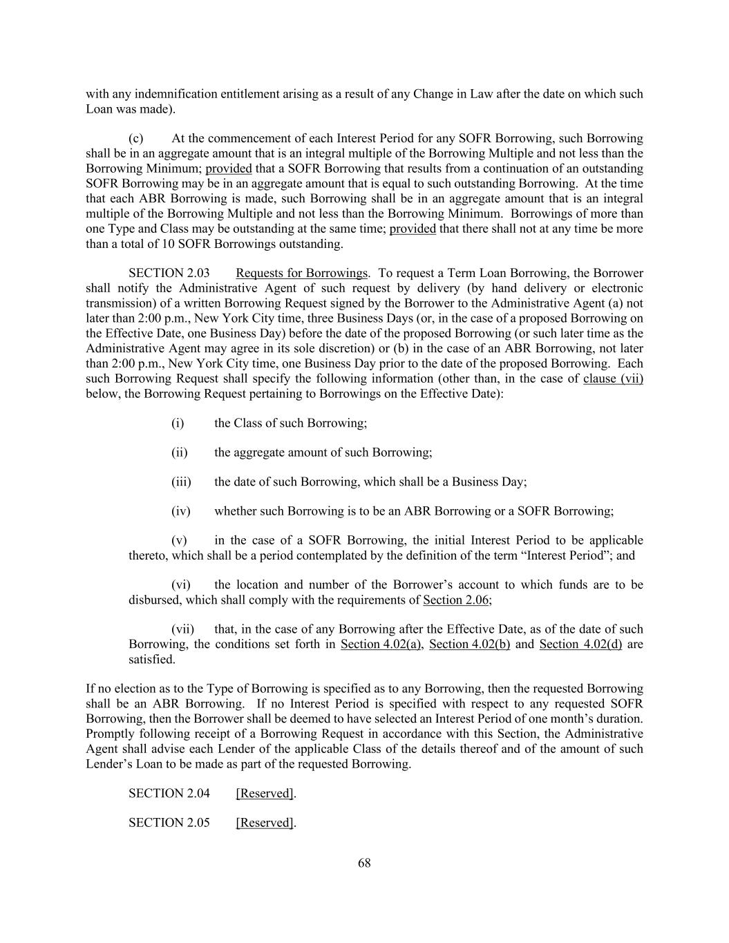 68 with any indemnification entitlement arising as a result of any Change in Law after the date on which such Loan was made). (c) At the commencement of each Interest Period for any SOFR Borrowing, such Borrowing shall be in an aggregate amount that is an integral multiple of the Borrowing Multiple and not less than the Borrowing Minimum; provided that a SOFR Borrowing that results from a continuation of an outstanding SOFR Borrowing may be in an aggregate amount that is equal to such outstanding Borrowing. At the time that each ABR Borrowing is made, such Borrowing shall be in an aggregate amount that is an integral multiple of the Borrowing Multiple and not less than the Borrowing Minimum. Borrowings of more than one Type and Class may be outstanding at the same time; provided that there shall not at any time be more than a total of 10 SOFR Borrowings outstanding. SECTION 2.03 Requests for Borrowings. To request a Term Loan Borrowing, the Borrower shall notify the Administrative Agent of such request by delivery (by hand delivery or electronic transmission) of a written Borrowing Request signed by the Borrower to the Administrative Agent (a) not later than 2:00 p.m., New York City time, three Business Days (or, in the case of a proposed Borrowing on the Effective Date, one Business Day) before the date of the proposed Borrowing (or such later time as the Administrative Agent may agree in its sole discretion) or (b) in the case of an ABR Borrowing, not later than 2:00 p.m., New York City time, one Business Day prior to the date of the proposed Borrowing. Each such Borrowing Request shall specify the following information (other than, in the case of clause (vii) below, the Borrowing Request pertaining to Borrowings on the Effective Date): (i) the Class of such Borrowing; (ii) the aggregate amount of such Borrowing; (iii) the date of such Borrowing, which shall be a Business Day; (iv) whether such Borrowing is to be an ABR Borrowing or a SOFR Borrowing; (v) in the case of a SOFR Borrowing, the initial Interest Period to be applicable thereto, which shall be a period contemplated by the definition of the term “Interest Period”; and (vi) the location and number of the Borrower’s account to which funds are to be disbursed, which shall comply with the requirements of Section 2.06; (vii) that, in the case of any Borrowing after the Effective Date, as of the date of such Borrowing, the conditions set forth in Section 4.02(a), Section 4.02(b) and Section 4.02(d) are satisfied. If no election as to the Type of Borrowing is specified as to any Borrowing, then the requested Borrowing shall be an ABR Borrowing. If no Interest Period is specified with respect to any requested SOFR Borrowing, then the Borrower shall be deemed to have selected an Interest Period of one month’s duration. Promptly following receipt of a Borrowing Request in accordance with this Section, the Administrative Agent shall advise each Lender of the applicable Class of the details thereof and of the amount of such Lender’s Loan to be made as part of the requested Borrowing. SECTION 2.04 [Reserved]. SECTION 2.05 [Reserved].