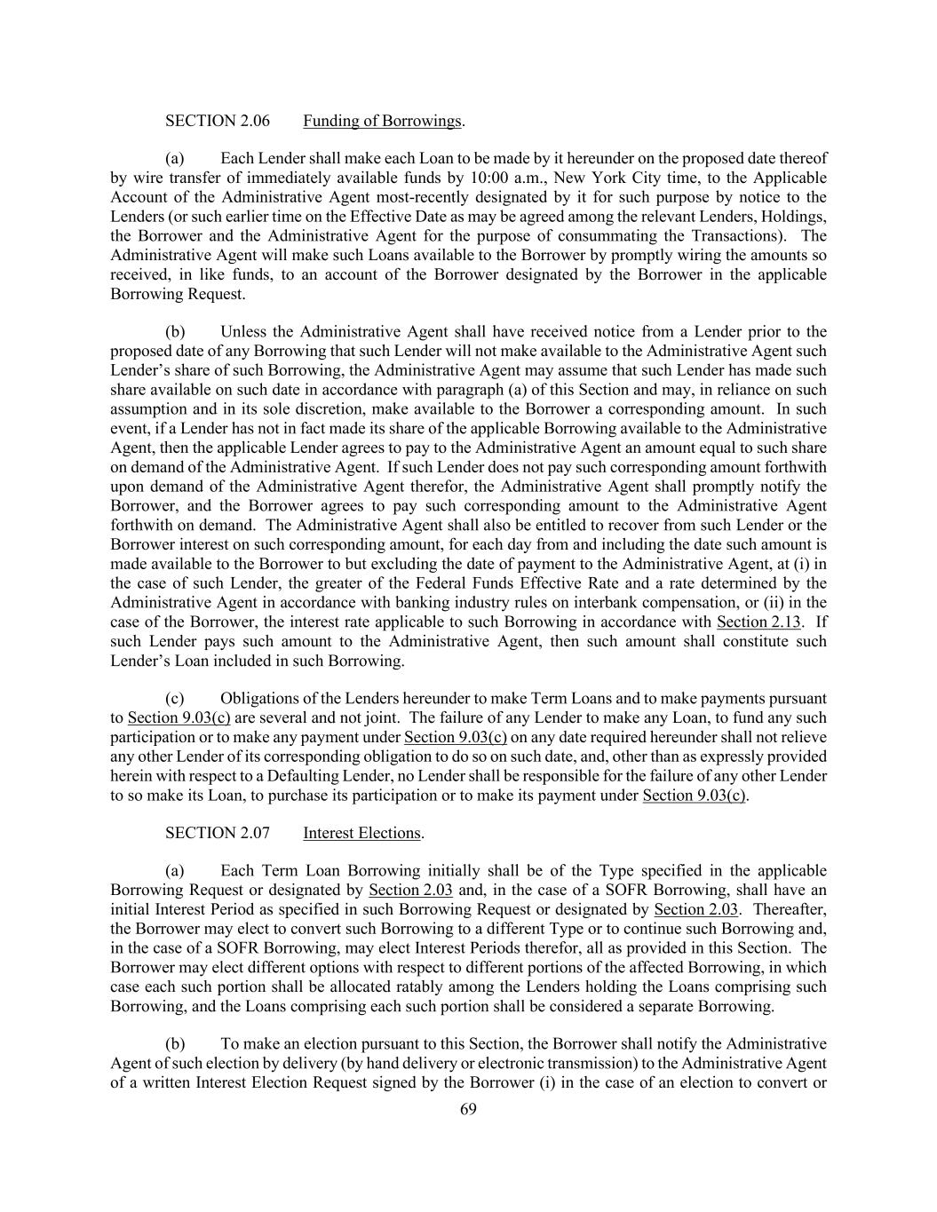 69 SECTION 2.06 Funding of Borrowings. (a) Each Lender shall make each Loan to be made by it hereunder on the proposed date thereof by wire transfer of immediately available funds by 10:00 a.m., New York City time, to the Applicable Account of the Administrative Agent most-recently designated by it for such purpose by notice to the Lenders (or such earlier time on the Effective Date as may be agreed among the relevant Lenders, Holdings, the Borrower and the Administrative Agent for the purpose of consummating the Transactions). The Administrative Agent will make such Loans available to the Borrower by promptly wiring the amounts so received, in like funds, to an account of the Borrower designated by the Borrower in the applicable Borrowing Request. (b) Unless the Administrative Agent shall have received notice from a Lender prior to the proposed date of any Borrowing that such Lender will not make available to the Administrative Agent such Lender’s share of such Borrowing, the Administrative Agent may assume that such Lender has made such share available on such date in accordance with paragraph (a) of this Section and may, in reliance on such assumption and in its sole discretion, make available to the Borrower a corresponding amount. In such event, if a Lender has not in fact made its share of the applicable Borrowing available to the Administrative Agent, then the applicable Lender agrees to pay to the Administrative Agent an amount equal to such share on demand of the Administrative Agent. If such Lender does not pay such corresponding amount forthwith upon demand of the Administrative Agent therefor, the Administrative Agent shall promptly notify the Borrower, and the Borrower agrees to pay such corresponding amount to the Administrative Agent forthwith on demand. The Administrative Agent shall also be entitled to recover from such Lender or the Borrower interest on such corresponding amount, for each day from and including the date such amount is made available to the Borrower to but excluding the date of payment to the Administrative Agent, at (i) in the case of such Lender, the greater of the Federal Funds Effective Rate and a rate determined by the Administrative Agent in accordance with banking industry rules on interbank compensation, or (ii) in the case of the Borrower, the interest rate applicable to such Borrowing in accordance with Section 2.13. If such Lender pays such amount to the Administrative Agent, then such amount shall constitute such Lender’s Loan included in such Borrowing. (c) Obligations of the Lenders hereunder to make Term Loans and to make payments pursuant to Section 9.03(c) are several and not joint. The failure of any Lender to make any Loan, to fund any such participation or to make any payment under Section 9.03(c) on any date required hereunder shall not relieve any other Lender of its corresponding obligation to do so on such date, and, other than as expressly provided herein with respect to a Defaulting Lender, no Lender shall be responsible for the failure of any other Lender to so make its Loan, to purchase its participation or to make its payment under Section 9.03(c). SECTION 2.07 Interest Elections. (a) Each Term Loan Borrowing initially shall be of the Type specified in the applicable Borrowing Request or designated by Section 2.03 and, in the case of a SOFR Borrowing, shall have an initial Interest Period as specified in such Borrowing Request or designated by Section 2.03. Thereafter, the Borrower may elect to convert such Borrowing to a different Type or to continue such Borrowing and, in the case of a SOFR Borrowing, may elect Interest Periods therefor, all as provided in this Section. The Borrower may elect different options with respect to different portions of the affected Borrowing, in which case each such portion shall be allocated ratably among the Lenders holding the Loans comprising such Borrowing, and the Loans comprising each such portion shall be considered a separate Borrowing. (b) To make an election pursuant to this Section, the Borrower shall notify the Administrative Agent of such election by delivery (by hand delivery or electronic transmission) to the Administrative Agent of a written Interest Election Request signed by the Borrower (i) in the case of an election to convert or