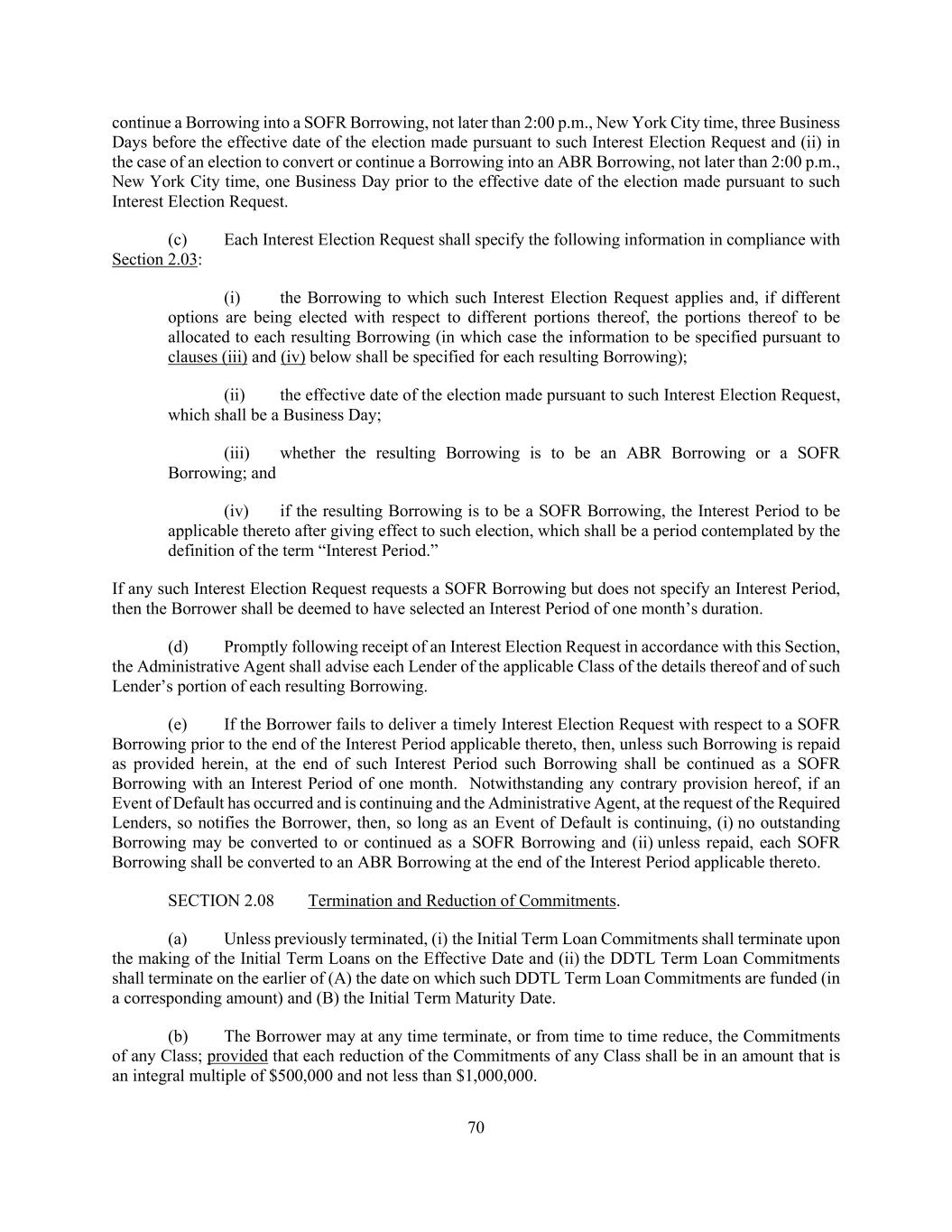 70 continue a Borrowing into a SOFR Borrowing, not later than 2:00 p.m., New York City time, three Business Days before the effective date of the election made pursuant to such Interest Election Request and (ii) in the case of an election to convert or continue a Borrowing into an ABR Borrowing, not later than 2:00 p.m., New York City time, one Business Day prior to the effective date of the election made pursuant to such Interest Election Request. (c) Each Interest Election Request shall specify the following information in compliance with Section 2.03: (i) the Borrowing to which such Interest Election Request applies and, if different options are being elected with respect to different portions thereof, the portions thereof to be allocated to each resulting Borrowing (in which case the information to be specified pursuant to clauses (iii) and (iv) below shall be specified for each resulting Borrowing); (ii) the effective date of the election made pursuant to such Interest Election Request, which shall be a Business Day; (iii) whether the resulting Borrowing is to be an ABR Borrowing or a SOFR Borrowing; and (iv) if the resulting Borrowing is to be a SOFR Borrowing, the Interest Period to be applicable thereto after giving effect to such election, which shall be a period contemplated by the definition of the term “Interest Period.” If any such Interest Election Request requests a SOFR Borrowing but does not specify an Interest Period, then the Borrower shall be deemed to have selected an Interest Period of one month’s duration. (d) Promptly following receipt of an Interest Election Request in accordance with this Section, the Administrative Agent shall advise each Lender of the applicable Class of the details thereof and of such Lender’s portion of each resulting Borrowing. (e) If the Borrower fails to deliver a timely Interest Election Request with respect to a SOFR Borrowing prior to the end of the Interest Period applicable thereto, then, unless such Borrowing is repaid as provided herein, at the end of such Interest Period such Borrowing shall be continued as a SOFR Borrowing with an Interest Period of one month. Notwithstanding any contrary provision hereof, if an Event of Default has occurred and is continuing and the Administrative Agent, at the request of the Required Lenders, so notifies the Borrower, then, so long as an Event of Default is continuing, (i) no outstanding Borrowing may be converted to or continued as a SOFR Borrowing and (ii) unless repaid, each SOFR Borrowing shall be converted to an ABR Borrowing at the end of the Interest Period applicable thereto. SECTION 2.08 Termination and Reduction of Commitments. (a) Unless previously terminated, (i) the Initial Term Loan Commitments shall terminate upon the making of the Initial Term Loans on the Effective Date and (ii) the DDTL Term Loan Commitments shall terminate on the earlier of (A) the date on which such DDTL Term Loan Commitments are funded (in a corresponding amount) and (B) the Initial Term Maturity Date. (b) The Borrower may at any time terminate, or from time to time reduce, the Commitments of any Class; provided that each reduction of the Commitments of any Class shall be in an amount that is an integral multiple of $500,000 and not less than $1,000,000.