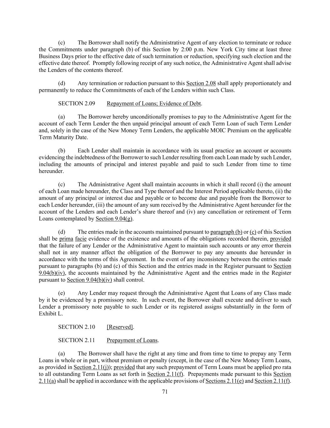 71 (c) The Borrower shall notify the Administrative Agent of any election to terminate or reduce the Commitments under paragraph (b) of this Section by 2:00 p.m. New York City time at least three Business Days prior to the effective date of such termination or reduction, specifying such election and the effective date thereof. Promptly following receipt of any such notice, the Administrative Agent shall advise the Lenders of the contents thereof. (d) Any termination or reduction pursuant to this Section 2.08 shall apply proportionately and permanently to reduce the Commitments of each of the Lenders within such Class. SECTION 2.09 Repayment of Loans; Evidence of Debt. (a) The Borrower hereby unconditionally promises to pay to the Administrative Agent for the account of each Term Lender the then unpaid principal amount of each Term Loan of such Term Lender and, solely in the case of the New Money Term Lenders, the applicable MOIC Premium on the applicable Term Maturity Date. (b) Each Lender shall maintain in accordance with its usual practice an account or accounts evidencing the indebtedness of the Borrower to such Lender resulting from each Loan made by such Lender, including the amounts of principal and interest payable and paid to such Lender from time to time hereunder. (c) The Administrative Agent shall maintain accounts in which it shall record (i) the amount of each Loan made hereunder, the Class and Type thereof and the Interest Period applicable thereto, (ii) the amount of any principal or interest due and payable or to become due and payable from the Borrower to each Lender hereunder, (iii) the amount of any sum received by the Administrative Agent hereunder for the account of the Lenders and each Lender’s share thereof and (iv) any cancellation or retirement of Term Loans contemplated by Section 9.04(g). (d) The entries made in the accounts maintained pursuant to paragraph (b) or (c) of this Section shall be prima facie evidence of the existence and amounts of the obligations recorded therein, provided that the failure of any Lender or the Administrative Agent to maintain such accounts or any error therein shall not in any manner affect the obligation of the Borrower to pay any amounts due hereunder in accordance with the terms of this Agreement. In the event of any inconsistency between the entries made pursuant to paragraphs (b) and (c) of this Section and the entries made in the Register pursuant to Section 9.04(b)(iv), the accounts maintained by the Administrative Agent and the entries made in the Register pursuant to Section 9.04(b)(iv) shall control. (e) Any Lender may request through the Administrative Agent that Loans of any Class made by it be evidenced by a promissory note. In such event, the Borrower shall execute and deliver to such Lender a promissory note payable to such Lender or its registered assigns substantially in the form of Exhibit L. SECTION 2.10 [Reserved]. SECTION 2.11 Prepayment of Loans. (a) The Borrower shall have the right at any time and from time to time to prepay any Term Loans in whole or in part, without premium or penalty (except, in the case of the New Money Term Loans, as provided in Section 2.11(j)); provided that any such prepayment of Term Loans must be applied pro rata to all outstanding Term Loans as set forth in Section 2.11(f). Prepayments made pursuant to this Section 2.11(a) shall be applied in accordance with the applicable provisions of Sections 2.11(e) and Section 2.11(f).