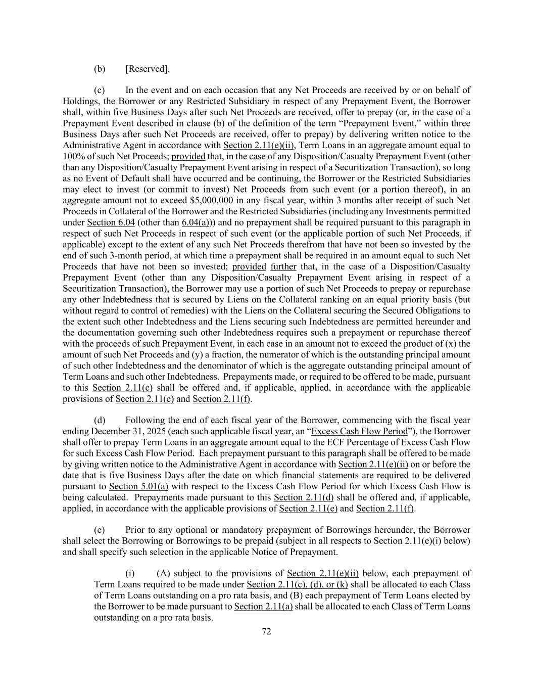 72 (b) [Reserved]. (c) In the event and on each occasion that any Net Proceeds are received by or on behalf of Holdings, the Borrower or any Restricted Subsidiary in respect of any Prepayment Event, the Borrower shall, within five Business Days after such Net Proceeds are received, offer to prepay (or, in the case of a Prepayment Event described in clause (b) of the definition of the term “Prepayment Event,” within three Business Days after such Net Proceeds are received, offer to prepay) by delivering written notice to the Administrative Agent in accordance with Section 2.11(e)(ii), Term Loans in an aggregate amount equal to 100% of such Net Proceeds; provided that, in the case of any Disposition/Casualty Prepayment Event (other than any Disposition/Casualty Prepayment Event arising in respect of a Securitization Transaction), so long as no Event of Default shall have occurred and be continuing, the Borrower or the Restricted Subsidiaries may elect to invest (or commit to invest) Net Proceeds from such event (or a portion thereof), in an aggregate amount not to exceed $5,000,000 in any fiscal year, within 3 months after receipt of such Net Proceeds in Collateral of the Borrower and the Restricted Subsidiaries (including any Investments permitted under Section 6.04 (other than 6.04(a))) and no prepayment shall be required pursuant to this paragraph in respect of such Net Proceeds in respect of such event (or the applicable portion of such Net Proceeds, if applicable) except to the extent of any such Net Proceeds therefrom that have not been so invested by the end of such 3-month period, at which time a prepayment shall be required in an amount equal to such Net Proceeds that have not been so invested; provided further that, in the case of a Disposition/Casualty Prepayment Event (other than any Disposition/Casualty Prepayment Event arising in respect of a Securitization Transaction), the Borrower may use a portion of such Net Proceeds to prepay or repurchase any other Indebtedness that is secured by Liens on the Collateral ranking on an equal priority basis (but without regard to control of remedies) with the Liens on the Collateral securing the Secured Obligations to the extent such other Indebtedness and the Liens securing such Indebtedness are permitted hereunder and the documentation governing such other Indebtedness requires such a prepayment or repurchase thereof with the proceeds of such Prepayment Event, in each case in an amount not to exceed the product of (x) the amount of such Net Proceeds and (y) a fraction, the numerator of which is the outstanding principal amount of such other Indebtedness and the denominator of which is the aggregate outstanding principal amount of Term Loans and such other Indebtedness. Prepayments made, or required to be offered to be made, pursuant to this Section 2.11(c) shall be offered and, if applicable, applied, in accordance with the applicable provisions of Section 2.11(e) and Section 2.11(f). (d) Following the end of each fiscal year of the Borrower, commencing with the fiscal year ending December 31, 2025 (each such applicable fiscal year, an “Excess Cash Flow Period”), the Borrower shall offer to prepay Term Loans in an aggregate amount equal to the ECF Percentage of Excess Cash Flow for such Excess Cash Flow Period. Each prepayment pursuant to this paragraph shall be offered to be made by giving written notice to the Administrative Agent in accordance with Section 2.11(e)(ii) on or before the date that is five Business Days after the date on which financial statements are required to be delivered pursuant to Section 5.01(a) with respect to the Excess Cash Flow Period for which Excess Cash Flow is being calculated. Prepayments made pursuant to this Section 2.11(d) shall be offered and, if applicable, applied, in accordance with the applicable provisions of Section 2.11(e) and Section 2.11(f). (e) Prior to any optional or mandatory prepayment of Borrowings hereunder, the Borrower shall select the Borrowing or Borrowings to be prepaid (subject in all respects to Section 2.11(e)(i) below) and shall specify such selection in the applicable Notice of Prepayment. (i) (A) subject to the provisions of Section 2.11(e)(ii) below, each prepayment of Term Loans required to be made under Section 2.11(c), (d), or (k) shall be allocated to each Class of Term Loans outstanding on a pro rata basis, and (B) each prepayment of Term Loans elected by the Borrower to be made pursuant to Section 2.11(a) shall be allocated to each Class of Term Loans outstanding on a pro rata basis.