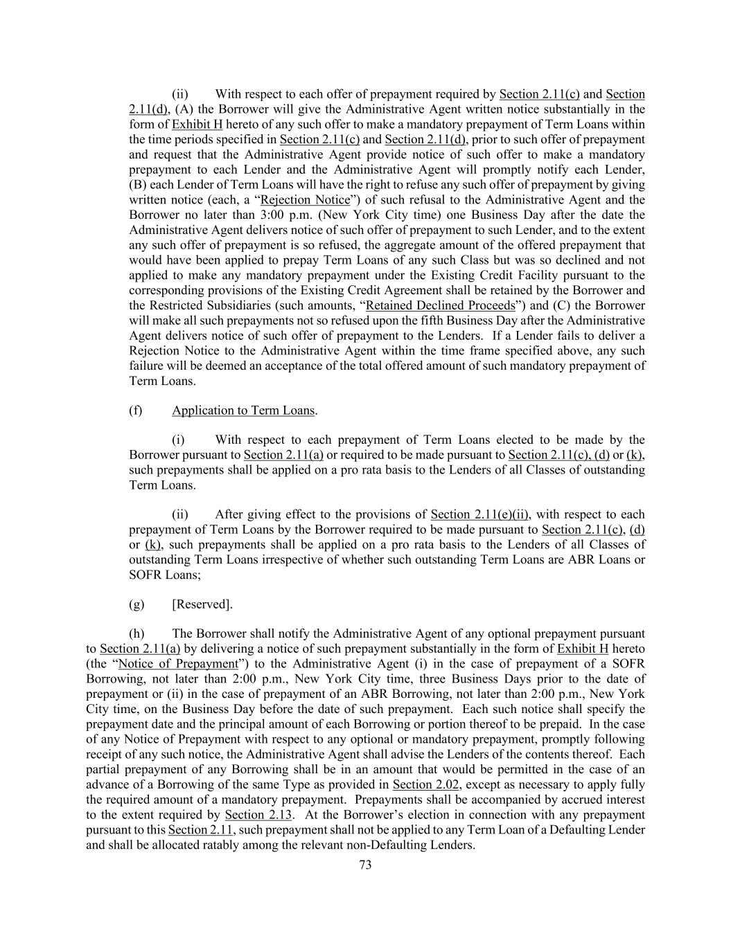73 (ii) With respect to each offer of prepayment required by Section 2.11(c) and Section 2.11(d), (A) the Borrower will give the Administrative Agent written notice substantially in the form of Exhibit H hereto of any such offer to make a mandatory prepayment of Term Loans within the time periods specified in Section 2.11(c) and Section 2.11(d), prior to such offer of prepayment and request that the Administrative Agent provide notice of such offer to make a mandatory prepayment to each Lender and the Administrative Agent will promptly notify each Lender, (B) each Lender of Term Loans will have the right to refuse any such offer of prepayment by giving written notice (each, a “Rejection Notice”) of such refusal to the Administrative Agent and the Borrower no later than 3:00 p.m. (New York City time) one Business Day after the date the Administrative Agent delivers notice of such offer of prepayment to such Lender, and to the extent any such offer of prepayment is so refused, the aggregate amount of the offered prepayment that would have been applied to prepay Term Loans of any such Class but was so declined and not applied to make any mandatory prepayment under the Existing Credit Facility pursuant to the corresponding provisions of the Existing Credit Agreement shall be retained by the Borrower and the Restricted Subsidiaries (such amounts, “Retained Declined Proceeds”) and (C) the Borrower will make all such prepayments not so refused upon the fifth Business Day after the Administrative Agent delivers notice of such offer of prepayment to the Lenders. If a Lender fails to deliver a Rejection Notice to the Administrative Agent within the time frame specified above, any such failure will be deemed an acceptance of the total offered amount of such mandatory prepayment of Term Loans. (f) Application to Term Loans. (i) With respect to each prepayment of Term Loans elected to be made by the Borrower pursuant to Section 2.11(a) or required to be made pursuant to Section 2.11(c), (d) or (k), such prepayments shall be applied on a pro rata basis to the Lenders of all Classes of outstanding Term Loans. (ii) After giving effect to the provisions of Section 2.11(e)(ii), with respect to each prepayment of Term Loans by the Borrower required to be made pursuant to Section 2.11(c), (d) or (k), such prepayments shall be applied on a pro rata basis to the Lenders of all Classes of outstanding Term Loans irrespective of whether such outstanding Term Loans are ABR Loans or SOFR Loans; (g) [Reserved]. (h) The Borrower shall notify the Administrative Agent of any optional prepayment pursuant to Section 2.11(a) by delivering a notice of such prepayment substantially in the form of Exhibit H hereto (the “Notice of Prepayment”) to the Administrative Agent (i) in the case of prepayment of a SOFR Borrowing, not later than 2:00 p.m., New York City time, three Business Days prior to the date of prepayment or (ii) in the case of prepayment of an ABR Borrowing, not later than 2:00 p.m., New York City time, on the Business Day before the date of such prepayment. Each such notice shall specify the prepayment date and the principal amount of each Borrowing or portion thereof to be prepaid. In the case of any Notice of Prepayment with respect to any optional or mandatory prepayment, promptly following receipt of any such notice, the Administrative Agent shall advise the Lenders of the contents thereof. Each partial prepayment of any Borrowing shall be in an amount that would be permitted in the case of an advance of a Borrowing of the same Type as provided in Section 2.02, except as necessary to apply fully the required amount of a mandatory prepayment. Prepayments shall be accompanied by accrued interest to the extent required by Section 2.13. At the Borrower’s election in connection with any prepayment pursuant to this Section 2.11, such prepayment shall not be applied to any Term Loan of a Defaulting Lender and shall be allocated ratably among the relevant non-Defaulting Lenders.