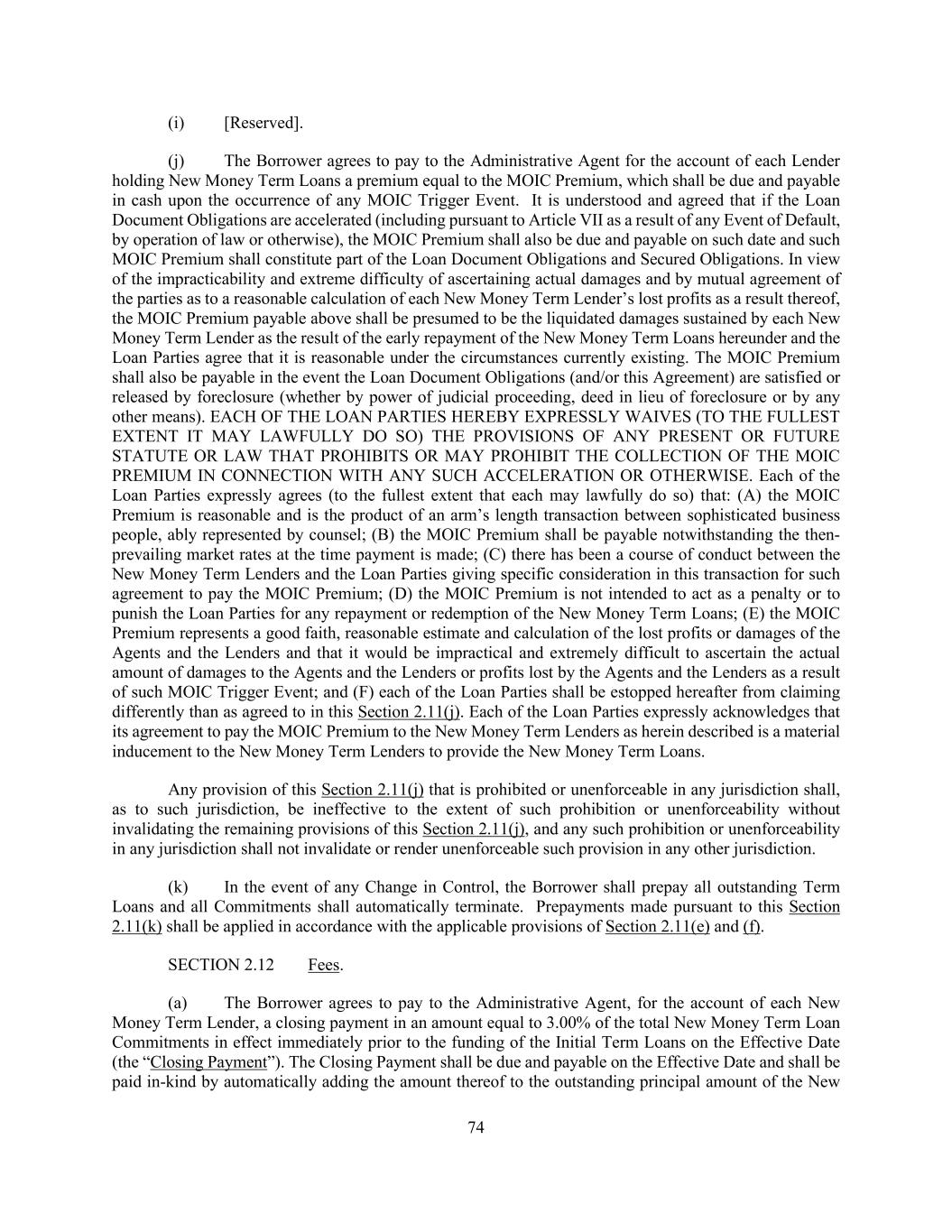 74 (i) [Reserved]. (j) The Borrower agrees to pay to the Administrative Agent for the account of each Lender holding New Money Term Loans a premium equal to the MOIC Premium, which shall be due and payable in cash upon the occurrence of any MOIC Trigger Event. It is understood and agreed that if the Loan Document Obligations are accelerated (including pursuant to Article VII as a result of any Event of Default, by operation of law or otherwise), the MOIC Premium shall also be due and payable on such date and such MOIC Premium shall constitute part of the Loan Document Obligations and Secured Obligations. In view of the impracticability and extreme difficulty of ascertaining actual damages and by mutual agreement of the parties as to a reasonable calculation of each New Money Term Lender’s lost profits as a result thereof, the MOIC Premium payable above shall be presumed to be the liquidated damages sustained by each New Money Term Lender as the result of the early repayment of the New Money Term Loans hereunder and the Loan Parties agree that it is reasonable under the circumstances currently existing. The MOIC Premium shall also be payable in the event the Loan Document Obligations (and/or this Agreement) are satisfied or released by foreclosure (whether by power of judicial proceeding, deed in lieu of foreclosure or by any other means). EACH OF THE LOAN PARTIES HEREBY EXPRESSLY WAIVES (TO THE FULLEST EXTENT IT MAY LAWFULLY DO SO) THE PROVISIONS OF ANY PRESENT OR FUTURE STATUTE OR LAW THAT PROHIBITS OR MAY PROHIBIT THE COLLECTION OF THE MOIC PREMIUM IN CONNECTION WITH ANY SUCH ACCELERATION OR OTHERWISE. Each of the Loan Parties expressly agrees (to the fullest extent that each may lawfully do so) that: (A) the MOIC Premium is reasonable and is the product of an arm’s length transaction between sophisticated business people, ably represented by counsel; (B) the MOIC Premium shall be payable notwithstanding the then- prevailing market rates at the time payment is made; (C) there has been a course of conduct between the New Money Term Lenders and the Loan Parties giving specific consideration in this transaction for such agreement to pay the MOIC Premium; (D) the MOIC Premium is not intended to act as a penalty or to punish the Loan Parties for any repayment or redemption of the New Money Term Loans; (E) the MOIC Premium represents a good faith, reasonable estimate and calculation of the lost profits or damages of the Agents and the Lenders and that it would be impractical and extremely difficult to ascertain the actual amount of damages to the Agents and the Lenders or profits lost by the Agents and the Lenders as a result of such MOIC Trigger Event; and (F) each of the Loan Parties shall be estopped hereafter from claiming differently than as agreed to in this Section 2.11(j). Each of the Loan Parties expressly acknowledges that its agreement to pay the MOIC Premium to the New Money Term Lenders as herein described is a material inducement to the New Money Term Lenders to provide the New Money Term Loans. Any provision of this Section 2.11(j) that is prohibited or unenforceable in any jurisdiction shall, as to such jurisdiction, be ineffective to the extent of such prohibition or unenforceability without invalidating the remaining provisions of this Section 2.11(j), and any such prohibition or unenforceability in any jurisdiction shall not invalidate or render unenforceable such provision in any other jurisdiction. (k) In the event of any Change in Control, the Borrower shall prepay all outstanding Term Loans and all Commitments shall automatically terminate. Prepayments made pursuant to this Section 2.11(k) shall be applied in accordance with the applicable provisions of Section 2.11(e) and (f). SECTION 2.12 Fees. (a) The Borrower agrees to pay to the Administrative Agent, for the account of each New Money Term Lender, a closing payment in an amount equal to 3.00% of the total New Money Term Loan Commitments in effect immediately prior to the funding of the Initial Term Loans on the Effective Date (the “Closing Payment”). The Closing Payment shall be due and payable on the Effective Date and shall be paid in-kind by automatically adding the amount thereof to the outstanding principal amount of the New