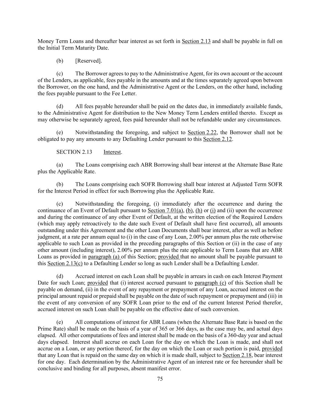 75 Money Term Loans and thereafter bear interest as set forth in Section 2.13 and shall be payable in full on the Initial Term Maturity Date. (b) [Reserved]. (c) The Borrower agrees to pay to the Administrative Agent, for its own account or the account of the Lenders, as applicable, fees payable in the amounts and at the times separately agreed upon between the Borrower, on the one hand, and the Administrative Agent or the Lenders, on the other hand, including the fees payable pursuant to the Fee Letter. (d) All fees payable hereunder shall be paid on the dates due, in immediately available funds, to the Administrative Agent for distribution to the New Money Term Lenders entitled thereto. Except as may otherwise be separately agreed, fees paid hereunder shall not be refundable under any circumstances. (e) Notwithstanding the foregoing, and subject to Section 2.22, the Borrower shall not be obligated to pay any amounts to any Defaulting Lender pursuant to this Section 2.12. SECTION 2.13 Interest. (a) The Loans comprising each ABR Borrowing shall bear interest at the Alternate Base Rate plus the Applicable Rate. (b) The Loans comprising each SOFR Borrowing shall bear interest at Adjusted Term SOFR for the Interest Period in effect for such Borrowing plus the Applicable Rate. (c) Notwithstanding the foregoing, (i) immediately after the occurrence and during the continuance of an Event of Default pursuant to Section 7.01(a), (b), (h) or (i) and (ii) upon the occurrence and during the continuance of any other Event of Default, at the written election of the Required Lenders (which may apply retroactively to the date such Event of Default shall have first occurred), all amounts outstanding under this Agreement and the other Loan Documents shall bear interest, after as well as before judgment, at a rate per annum equal to (i) in the case of any Loan, 2.00% per annum plus the rate otherwise applicable to such Loan as provided in the preceding paragraphs of this Section or (ii) in the case of any other amount (including interest), 2.00% per annum plus the rate applicable to Term Loans that are ABR Loans as provided in paragraph (a) of this Section; provided that no amount shall be payable pursuant to this Section 2.13(c) to a Defaulting Lender so long as such Lender shall be a Defaulting Lender. (d) Accrued interest on each Loan shall be payable in arrears in cash on each Interest Payment Date for such Loan; provided that (i) interest accrued pursuant to paragraph (c) of this Section shall be payable on demand, (ii) in the event of any repayment or prepayment of any Loan, accrued interest on the principal amount repaid or prepaid shall be payable on the date of such repayment or prepayment and (iii) in the event of any conversion of any SOFR Loan prior to the end of the current Interest Period therefor, accrued interest on such Loan shall be payable on the effective date of such conversion. (e) All computations of interest for ABR Loans (when the Alternate Base Rate is based on the Prime Rate) shall be made on the basis of a year of 365 or 366 days, as the case may be, and actual days elapsed. All other computations of fees and interest shall be made on the basis of a 360-day year and actual days elapsed. Interest shall accrue on each Loan for the day on which the Loan is made, and shall not accrue on a Loan, or any portion thereof, for the day on which the Loan or such portion is paid, provided that any Loan that is repaid on the same day on which it is made shall, subject to Section 2.18, bear interest for one day. Each determination by the Administrative Agent of an interest rate or fee hereunder shall be conclusive and binding for all purposes, absent manifest error.