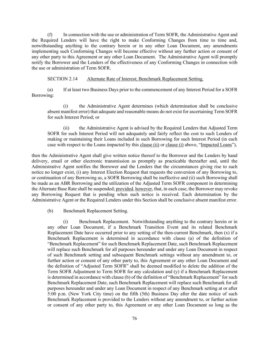 76 (f) In connection with the use or administration of Term SOFR, the Administrative Agent and the Required Lenders will have the right to make Conforming Changes from time to time and, notwithstanding anything to the contrary herein or in any other Loan Document, any amendments implementing such Conforming Changes will become effective without any further action or consent of any other party to this Agreement or any other Loan Document. The Administrative Agent will promptly notify the Borrower and the Lenders of the effectiveness of any Conforming Changes in connection with the use or administration of Term SOFR. SECTION 2.14 Alternate Rate of Interest; Benchmark Replacement Setting. (a) If at least two Business Days prior to the commencement of any Interest Period for a SOFR Borrowing: (i) the Administrative Agent determines (which determination shall be conclusive absent manifest error) that adequate and reasonable means do not exist for ascertaining Term SOFR for such Interest Period; or (ii) the Administrative Agent is advised by the Required Lenders that Adjusted Term SOFR for such Interest Period will not adequately and fairly reflect the cost to such Lenders of making or maintaining their Loans included in such Borrowing for such Interest Period (in each case with respect to the Loans impacted by this clause (ii) or clause (i) above, “Impacted Loans”), then the Administrative Agent shall give written notice thereof to the Borrower and the Lenders by hand delivery, email or other electronic transmission as promptly as practicable thereafter and, until the Administrative Agent notifies the Borrower and the Lenders that the circumstances giving rise to such notice no longer exist, (i) any Interest Election Request that requests the conversion of any Borrowing to, or continuation of any Borrowing as, a SOFR Borrowing shall be ineffective and (ii) such Borrowing shall be made as an ABR Borrowing and the utilization of the Adjusted Term SOFR component in determining the Alternate Base Rate shall be suspended; provided, however, that, in each case, the Borrower may revoke any Borrowing Request that is pending when such notice is received. Each determination by the Administrative Agent or the Required Lenders under this Section shall be conclusive absent manifest error. (b) Benchmark Replacement Setting. (i) Benchmark Replacement. Notwithstanding anything to the contrary herein or in any other Loan Document, if a Benchmark Transition Event and its related Benchmark Replacement Date have occurred prior to any setting of the then-current Benchmark, then (x) if a Benchmark Replacement is determined in accordance with clause (a) of the definition of “Benchmark Replacement” for such Benchmark Replacement Date, such Benchmark Replacement will replace such Benchmark for all purposes hereunder and under any Loan Document in respect of such Benchmark setting and subsequent Benchmark settings without any amendment to, or further action or consent of any other party to, this Agreement or any other Loan Document and the definition of “Adjusted Term SOFR” shall be deemed modified to delete the addition of the Term SOFR Adjustment to Term SOFR for any calculation and (y) if a Benchmark Replacement is determined in accordance with clause (b) of the definition of “Benchmark Replacement” for such Benchmark Replacement Date, such Benchmark Replacement will replace such Benchmark for all purposes hereunder and under any Loan Document in respect of any Benchmark setting at or after 5:00 p.m. (New York City time) on the fifth (5th) Business Day after the date notice of such Benchmark Replacement is provided to the Lenders without any amendment to, or further action or consent of any other party to, this Agreement or any other Loan Document so long as the