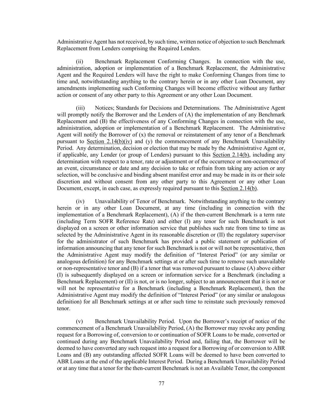 77 Administrative Agent has not received, by such time, written notice of objection to such Benchmark Replacement from Lenders comprising the Required Lenders. (ii) Benchmark Replacement Conforming Changes. In connection with the use, administration, adoption or implementation of a Benchmark Replacement, the Administrative Agent and the Required Lenders will have the right to make Conforming Changes from time to time and, notwithstanding anything to the contrary herein or in any other Loan Document, any amendments implementing such Conforming Changes will become effective without any further action or consent of any other party to this Agreement or any other Loan Document. (iii) Notices; Standards for Decisions and Determinations. The Administrative Agent will promptly notify the Borrower and the Lenders of (A) the implementation of any Benchmark Replacement and (B) the effectiveness of any Conforming Changes in connection with the use, administration, adoption or implementation of a Benchmark Replacement. The Administrative Agent will notify the Borrower of (x) the removal or reinstatement of any tenor of a Benchmark pursuant to Section 2.14(b)(iv) and (y) the commencement of any Benchmark Unavailability Period. Any determination, decision or election that may be made by the Administrative Agent or, if applicable, any Lender (or group of Lenders) pursuant to this Section 2.14(b), including any determination with respect to a tenor, rate or adjustment or of the occurrence or non-occurrence of an event, circumstance or date and any decision to take or refrain from taking any action or any selection, will be conclusive and binding absent manifest error and may be made in its or their sole discretion and without consent from any other party to this Agreement or any other Loan Document, except, in each case, as expressly required pursuant to this Section 2.14(b). (iv) Unavailability of Tenor of Benchmark. Notwithstanding anything to the contrary herein or in any other Loan Document, at any time (including in connection with the implementation of a Benchmark Replacement), (A) if the then-current Benchmark is a term rate (including Term SOFR Reference Rate) and either (I) any tenor for such Benchmark is not displayed on a screen or other information service that publishes such rate from time to time as selected by the Administrative Agent in its reasonable discretion or (II) the regulatory supervisor for the administrator of such Benchmark has provided a public statement or publication of information announcing that any tenor for such Benchmark is not or will not be representative, then the Administrative Agent may modify the definition of “Interest Period” (or any similar or analogous definition) for any Benchmark settings at or after such time to remove such unavailable or non-representative tenor and (B) if a tenor that was removed pursuant to clause (A) above either (I) is subsequently displayed on a screen or information service for a Benchmark (including a Benchmark Replacement) or (II) is not, or is no longer, subject to an announcement that it is not or will not be representative for a Benchmark (including a Benchmark Replacement), then the Administrative Agent may modify the definition of “Interest Period” (or any similar or analogous definition) for all Benchmark settings at or after such time to reinstate such previously removed tenor. (v) Benchmark Unavailability Period. Upon the Borrower’s receipt of notice of the commencement of a Benchmark Unavailability Period, (A) the Borrower may revoke any pending request for a Borrowing of, conversion to or continuation of SOFR Loans to be made, converted or continued during any Benchmark Unavailability Period and, failing that, the Borrower will be deemed to have converted any such request into a request for a Borrowing of or conversion to ABR Loans and (B) any outstanding affected SOFR Loans will be deemed to have been converted to ABR Loans at the end of the applicable Interest Period. During a Benchmark Unavailability Period or at any time that a tenor for the then-current Benchmark is not an Available Tenor, the component