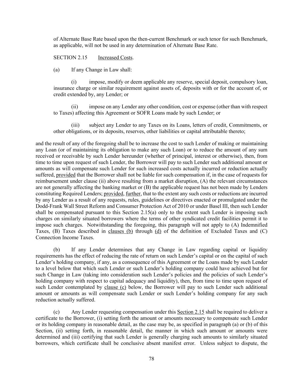 78 of Alternate Base Rate based upon the then-current Benchmark or such tenor for such Benchmark, as applicable, will not be used in any determination of Alternate Base Rate. SECTION 2.15 Increased Costs. (a) If any Change in Law shall: (i) impose, modify or deem applicable any reserve, special deposit, compulsory loan, insurance charge or similar requirement against assets of, deposits with or for the account of, or credit extended by, any Lender; or (ii) impose on any Lender any other condition, cost or expense (other than with respect to Taxes) affecting this Agreement or SOFR Loans made by such Lender; or (iii) subject any Lender to any Taxes on its Loans, letters of credit, Commitments, or other obligations, or its deposits, reserves, other liabilities or capital attributable thereto; and the result of any of the foregoing shall be to increase the cost to such Lender of making or maintaining any Loan (or of maintaining its obligation to make any such Loan) or to reduce the amount of any sum received or receivable by such Lender hereunder (whether of principal, interest or otherwise), then, from time to time upon request of such Lender, the Borrower will pay to such Lender such additional amount or amounts as will compensate such Lender for such increased costs actually incurred or reduction actually suffered, provided that the Borrower shall not be liable for such compensation if, in the case of requests for reimbursement under clause (ii) above resulting from a market disruption, (A) the relevant circumstances are not generally affecting the banking market or (B) the applicable request has not been made by Lenders constituting Required Lenders; provided, further, that to the extent any such costs or reductions are incurred by any Lender as a result of any requests, rules, guidelines or directives enacted or promulgated under the Dodd-Frank Wall Street Reform and Consumer Protection Act of 2010 or under Basel III, then such Lender shall be compensated pursuant to this Section 2.15(a) only to the extent such Lender is imposing such charges on similarly situated borrowers where the terms of other syndicated credit facilities permit it to impose such charges. Notwithstanding the foregoing, this paragraph will not apply to (A) Indemnified Taxes, (B) Taxes described in clauses (b) through (d) of the definition of Excluded Taxes and (C) Connection Income Taxes. (b) If any Lender determines that any Change in Law regarding capital or liquidity requirements has the effect of reducing the rate of return on such Lender’s capital or on the capital of such Lender’s holding company, if any, as a consequence of this Agreement or the Loans made by such Lender to a level below that which such Lender or such Lender’s holding company could have achieved but for such Change in Law (taking into consideration such Lender’s policies and the policies of such Lender’s holding company with respect to capital adequacy and liquidity), then, from time to time upon request of such Lender contemplated by clause (c) below, the Borrower will pay to such Lender such additional amount or amounts as will compensate such Lender or such Lender’s holding company for any such reduction actually suffered. (c) Any Lender requesting compensation under this Section 2.15 shall be required to deliver a certificate to the Borrower, (i) setting forth the amount or amounts necessary to compensate such Lender or its holding company in reasonable detail, as the case may be, as specified in paragraph (a) or (b) of this Section, (ii) setting forth, in reasonable detail, the manner in which such amount or amounts were determined and (iii) certifying that such Lender is generally charging such amounts to similarly situated borrowers, which certificate shall be conclusive absent manifest error. Unless subject to dispute, the