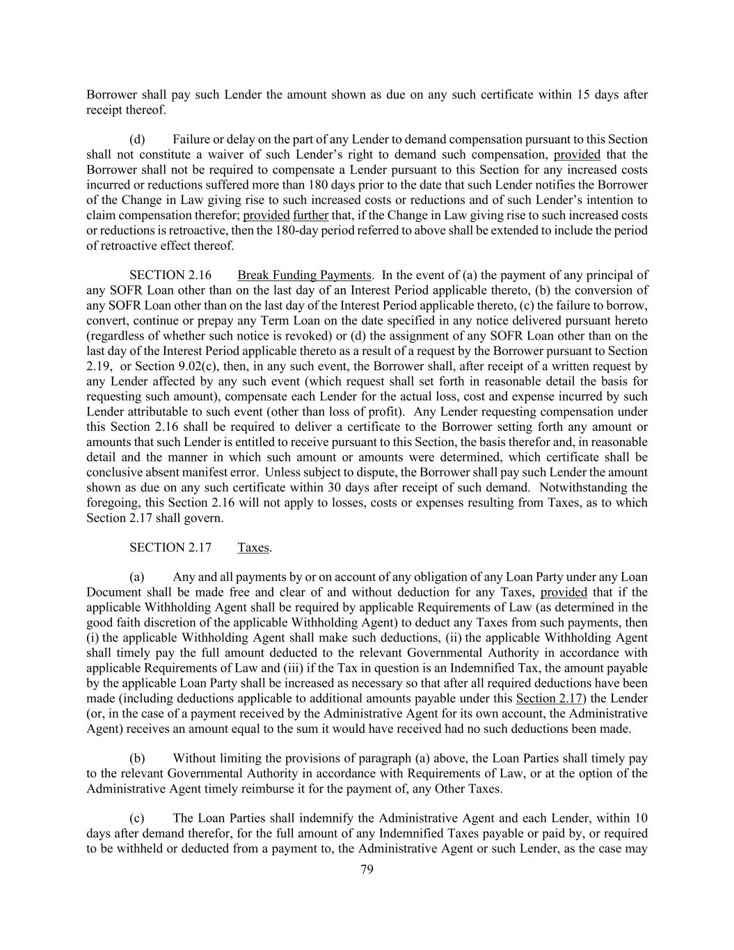 79 Borrower shall pay such Lender the amount shown as due on any such certificate within 15 days after receipt thereof. (d) Failure or delay on the part of any Lender to demand compensation pursuant to this Section shall not constitute a waiver of such Lender’s right to demand such compensation, provided that the Borrower shall not be required to compensate a Lender pursuant to this Section for any increased costs incurred or reductions suffered more than 180 days prior to the date that such Lender notifies the Borrower of the Change in Law giving rise to such increased costs or reductions and of such Lender’s intention to claim compensation therefor; provided further that, if the Change in Law giving rise to such increased costs or reductions is retroactive, then the 180-day period referred to above shall be extended to include the period of retroactive effect thereof. SECTION 2.16 Break Funding Payments. In the event of (a) the payment of any principal of any SOFR Loan other than on the last day of an Interest Period applicable thereto, (b) the conversion of any SOFR Loan other than on the last day of the Interest Period applicable thereto, (c) the failure to borrow, convert, continue or prepay any Term Loan on the date specified in any notice delivered pursuant hereto (regardless of whether such notice is revoked) or (d) the assignment of any SOFR Loan other than on the last day of the Interest Period applicable thereto as a result of a request by the Borrower pursuant to Section 2.19, or Section 9.02(c), then, in any such event, the Borrower shall, after receipt of a written request by any Lender affected by any such event (which request shall set forth in reasonable detail the basis for requesting such amount), compensate each Lender for the actual loss, cost and expense incurred by such Lender attributable to such event (other than loss of profit). Any Lender requesting compensation under this Section 2.16 shall be required to deliver a certificate to the Borrower setting forth any amount or amounts that such Lender is entitled to receive pursuant to this Section, the basis therefor and, in reasonable detail and the manner in which such amount or amounts were determined, which certificate shall be conclusive absent manifest error. Unless subject to dispute, the Borrower shall pay such Lender the amount shown as due on any such certificate within 30 days after receipt of such demand. Notwithstanding the foregoing, this Section 2.16 will not apply to losses, costs or expenses resulting from Taxes, as to which Section 2.17 shall govern. SECTION 2.17 Taxes. (a) Any and all payments by or on account of any obligation of any Loan Party under any Loan Document shall be made free and clear of and without deduction for any Taxes, provided that if the applicable Withholding Agent shall be required by applicable Requirements of Law (as determined in the good faith discretion of the applicable Withholding Agent) to deduct any Taxes from such payments, then (i) the applicable Withholding Agent shall make such deductions, (ii) the applicable Withholding Agent shall timely pay the full amount deducted to the relevant Governmental Authority in accordance with applicable Requirements of Law and (iii) if the Tax in question is an Indemnified Tax, the amount payable by the applicable Loan Party shall be increased as necessary so that after all required deductions have been made (including deductions applicable to additional amounts payable under this Section 2.17) the Lender (or, in the case of a payment received by the Administrative Agent for its own account, the Administrative Agent) receives an amount equal to the sum it would have received had no such deductions been made. (b) Without limiting the provisions of paragraph (a) above, the Loan Parties shall timely pay to the relevant Governmental Authority in accordance with Requirements of Law, or at the option of the Administrative Agent timely reimburse it for the payment of, any Other Taxes. (c) The Loan Parties shall indemnify the Administrative Agent and each Lender, within 10 days after demand therefor, for the full amount of any Indemnified Taxes payable or paid by, or required to be withheld or deducted from a payment to, the Administrative Agent or such Lender, as the case may